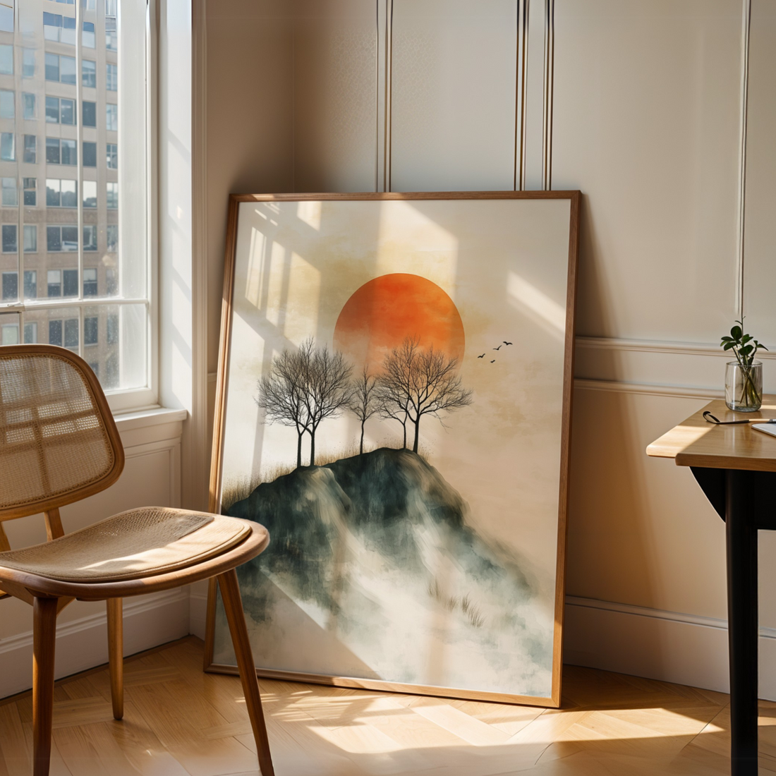 Vintage Minimalist Abstract Mountain Sunset Trees Wall Art Print Decor. High Resolution Digital Download 300 DPI.