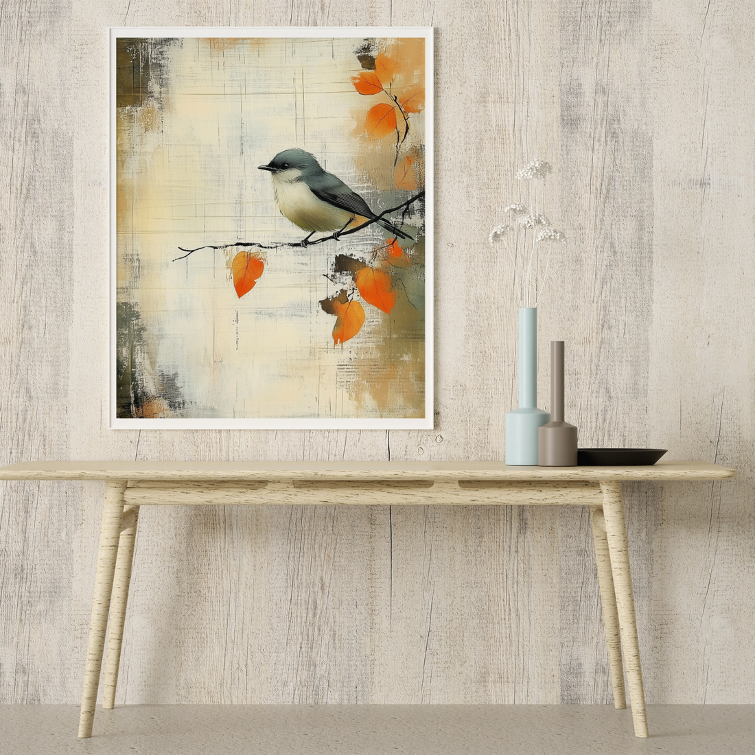 Transform your space with our enchanting wall art featuring a small gray bird perched delicately...