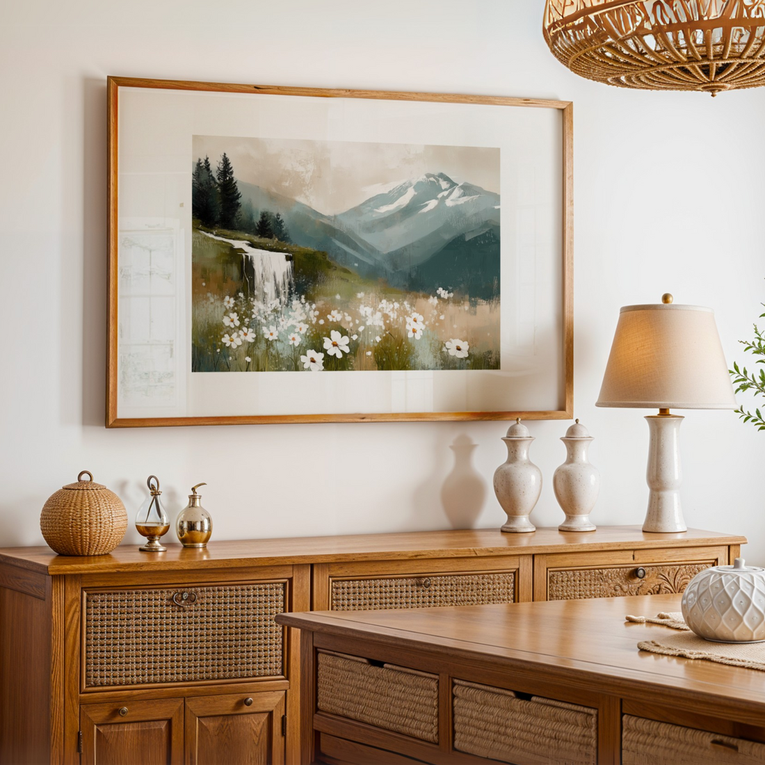 Whimsical Violet Field Wall Art Snow Mountain Waterfall Scenic Sky. High Resolution Digital Download 300 DPI.