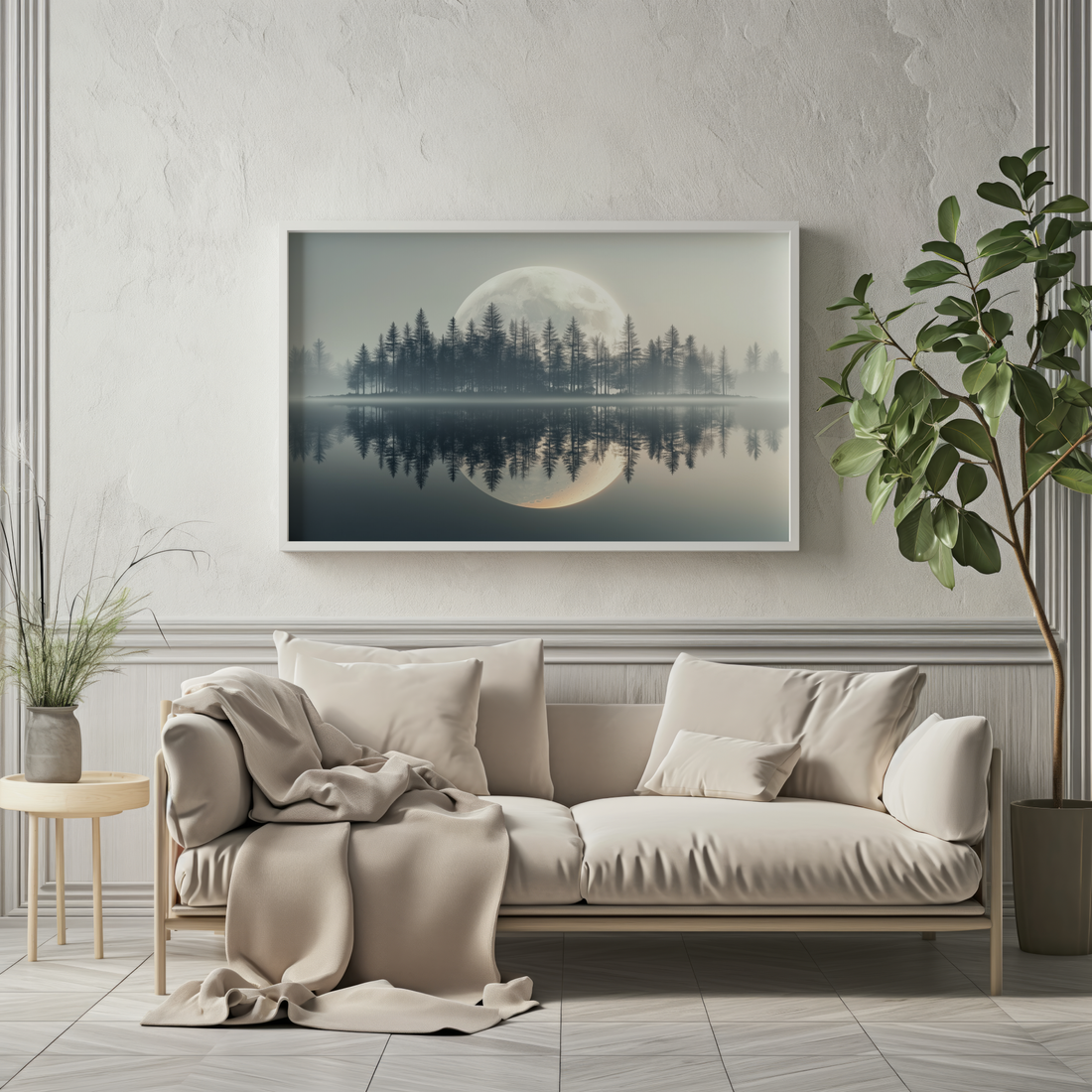 Moonlit Lake Wall Art Pine Trees Mist Reflection Night Tranquil Scene. High Resolution Digital Download 300 DPI.