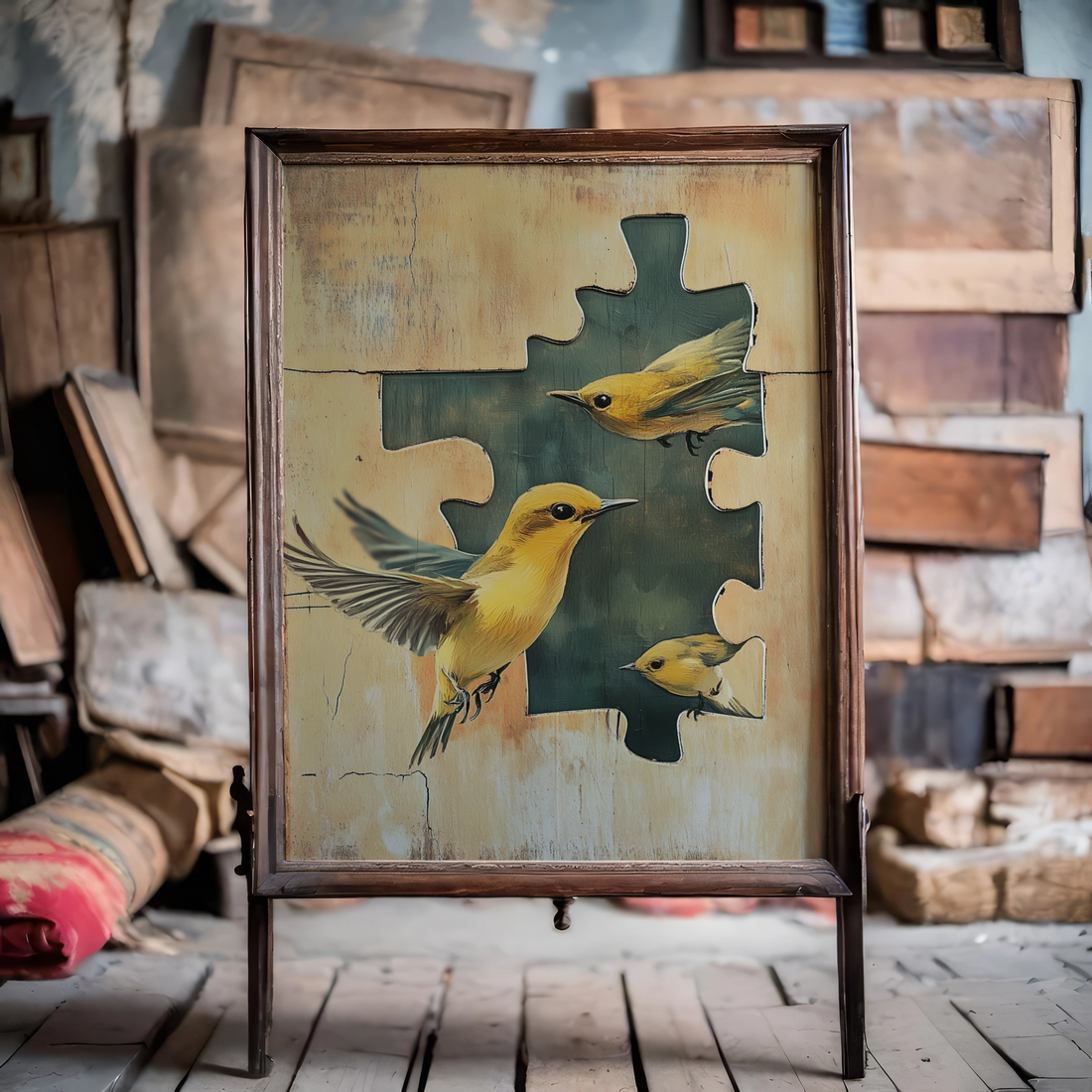 Elusive Identity: Jigsaw Puzzle with Missing Pieces and Birds Symbolizing Freedom. High Resolution Digital Download 300 DPI