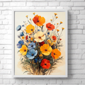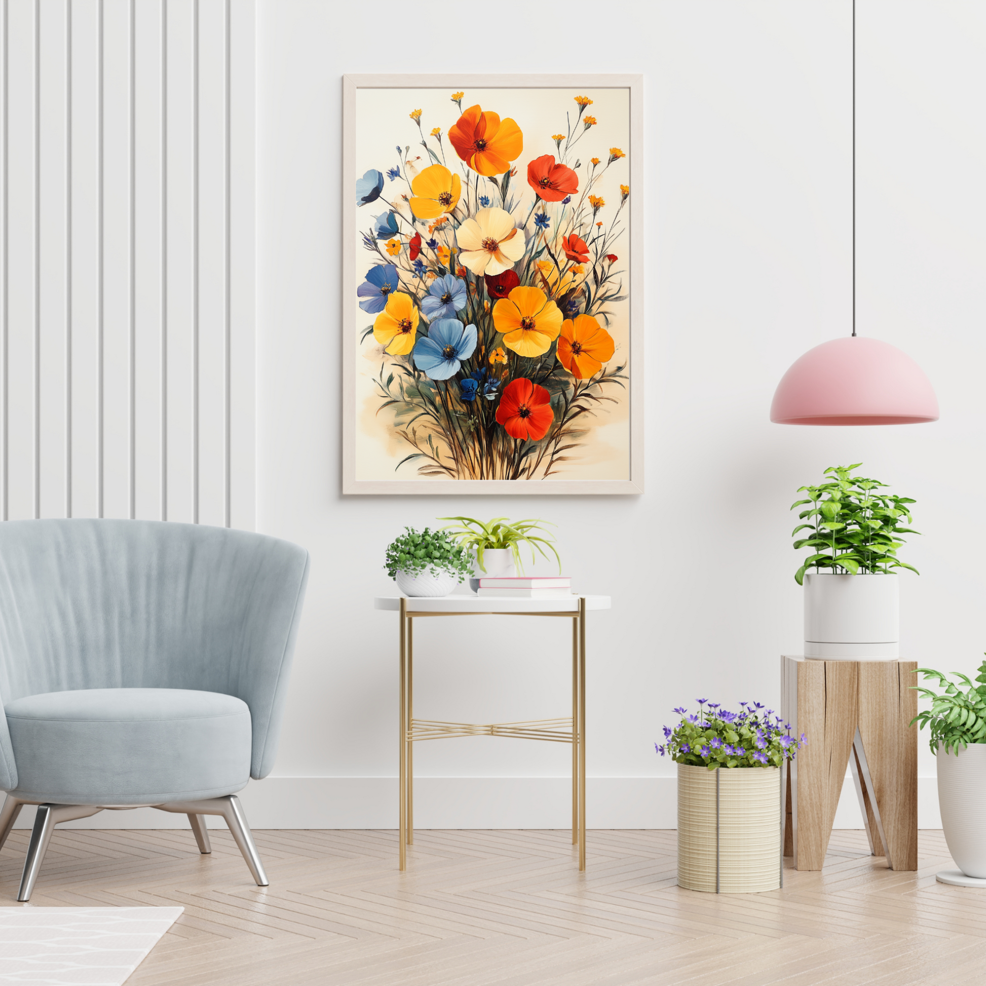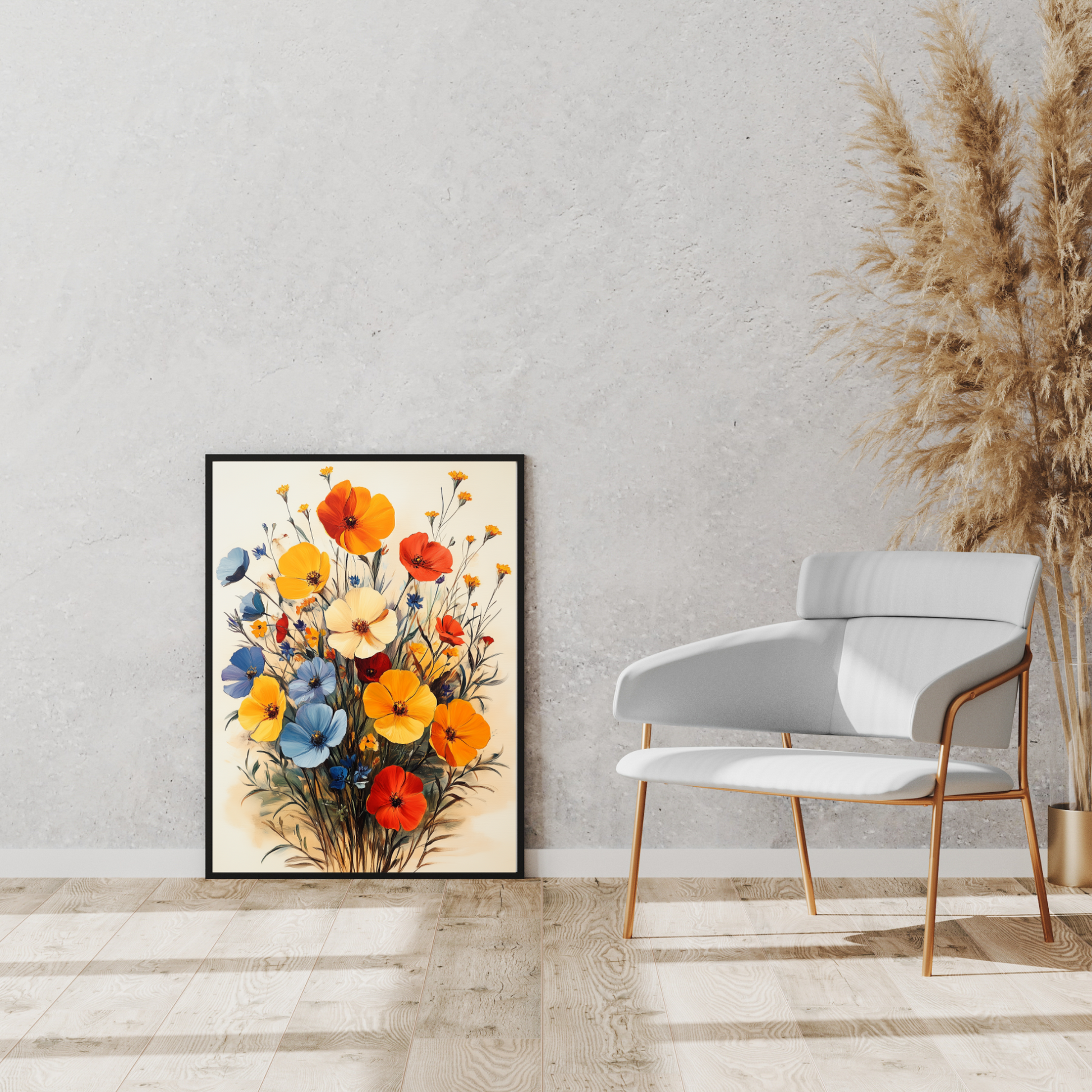 Transform your space with our stunning wildflower bouquet artwork, featuring a breathtaking array of vibrant red, orange, yellow, and blue blooms. This captivating piece captures the raw beauty of wildflowers, artfully arranged against a soft, light background that allows each color to shine. Perfect for nature lovers and art enthusiasts, this painting brings the untamed spirit of meadow flowers into your home. Whether displayed in a living room, bedroom, or office, this artwork adds a touch of natural beauty and energy to any interior, celebrating the wild and free essence of colorful wildflowers.