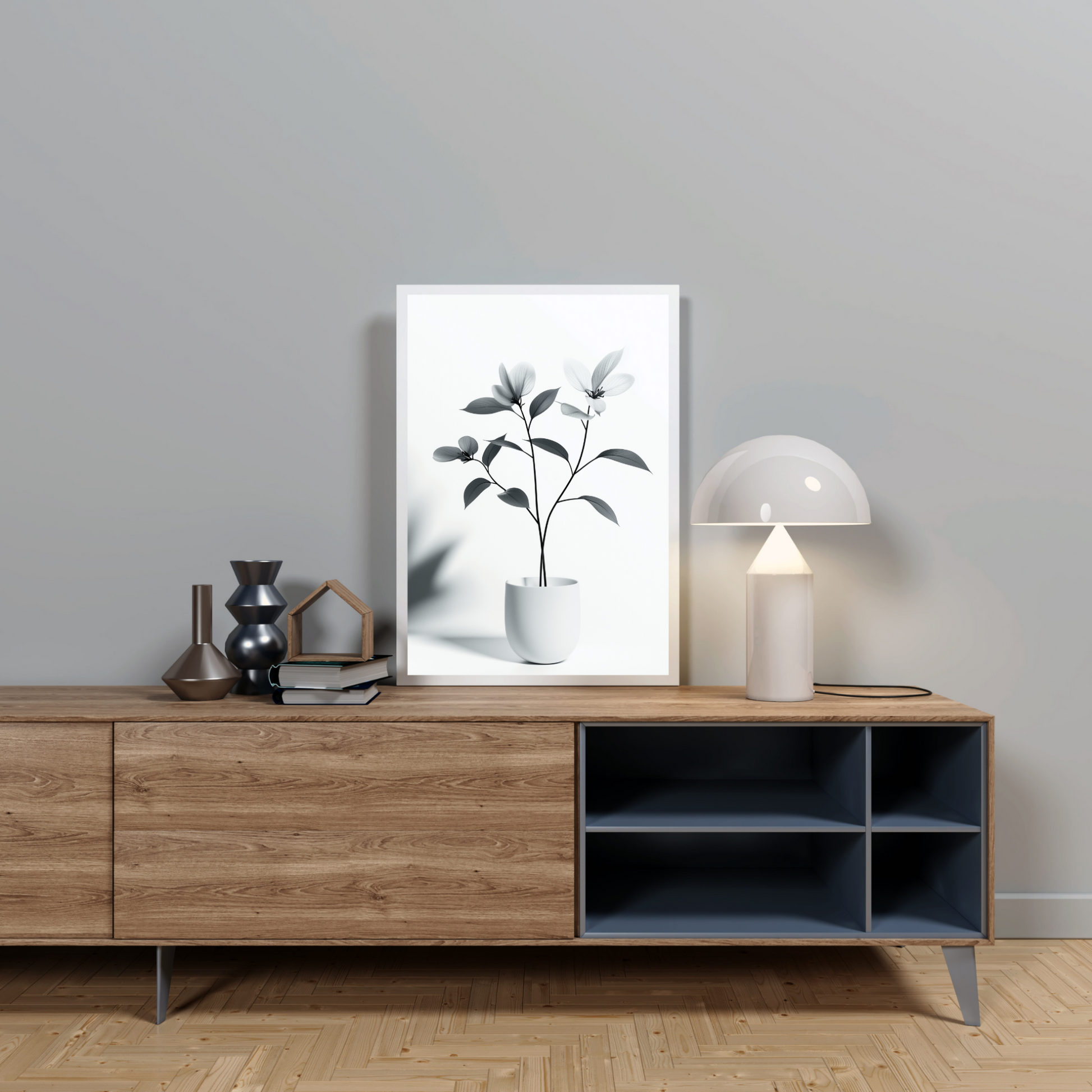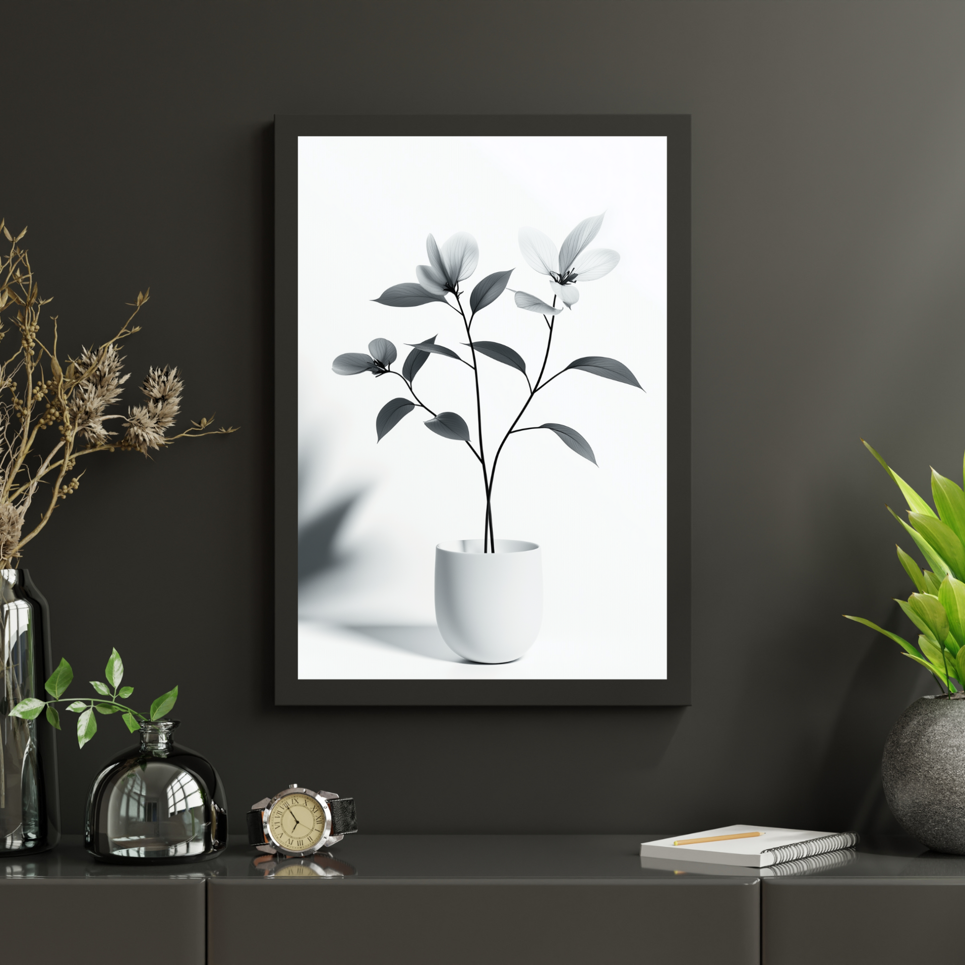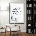 Enhance your space with this sophisticated black and white image of a plant with large, striking leaves and delicate flowers. The plant is beautifully arranged in a vase or container, creating a timeless and elegant composition. The blurred, out-of-focus background adds depth and softness, allowing the intricate details of the plant to take center stage. Perfect for modern or minimalist interiors, this artwork brings a touch of natural beauty and refined simplicity to any room, whether displayed in a living area, office, or bedroom.