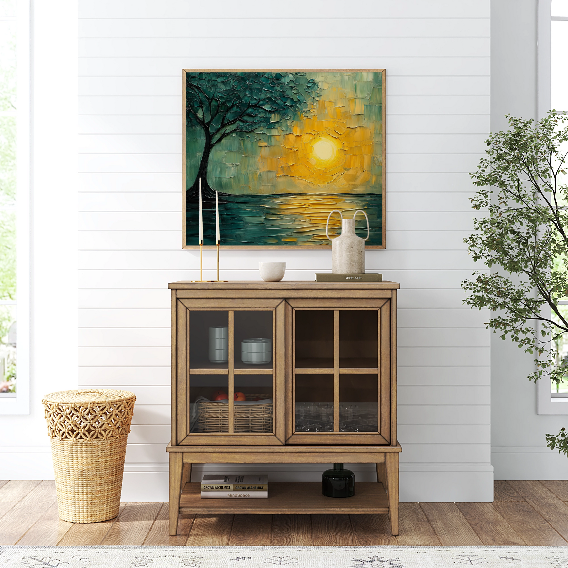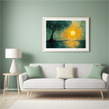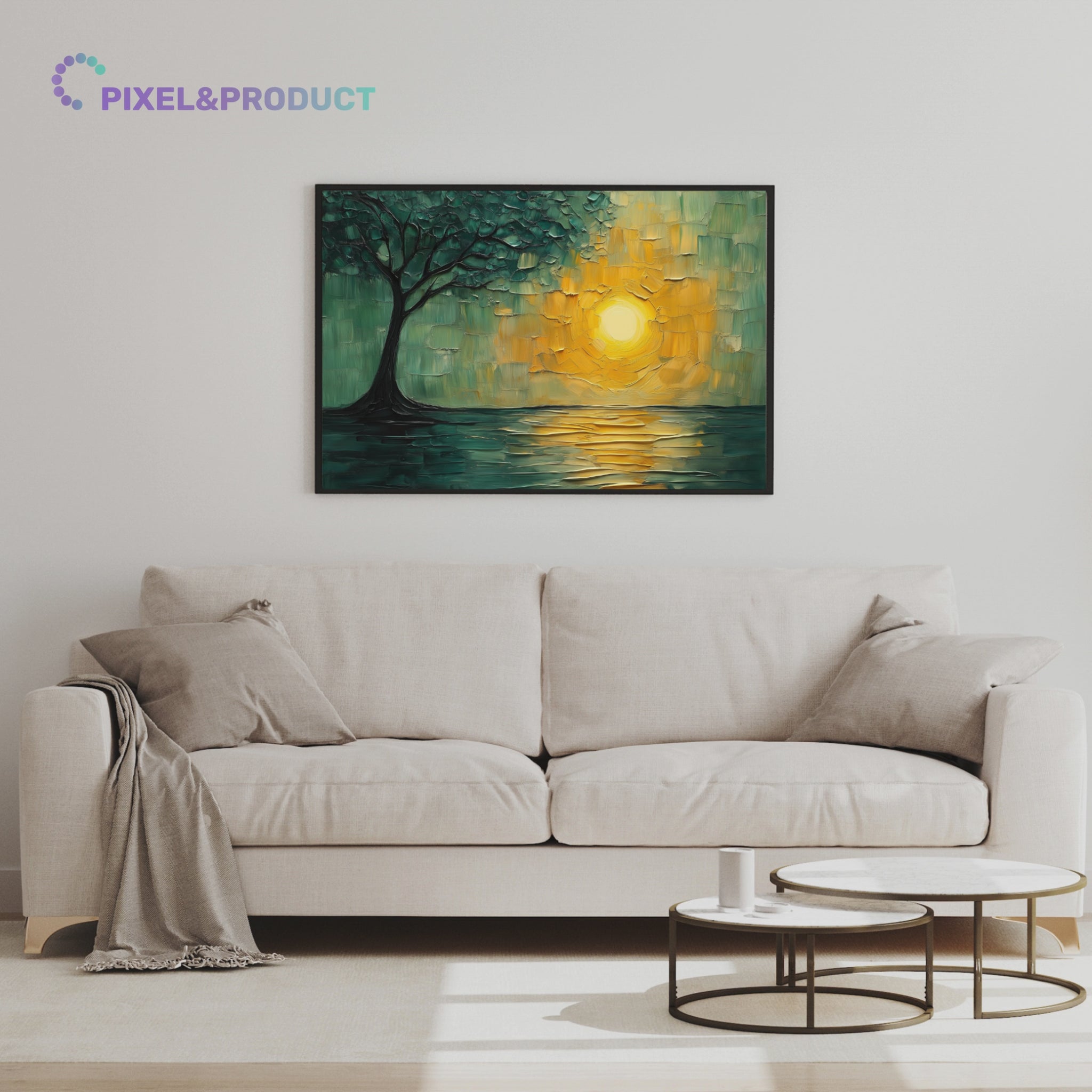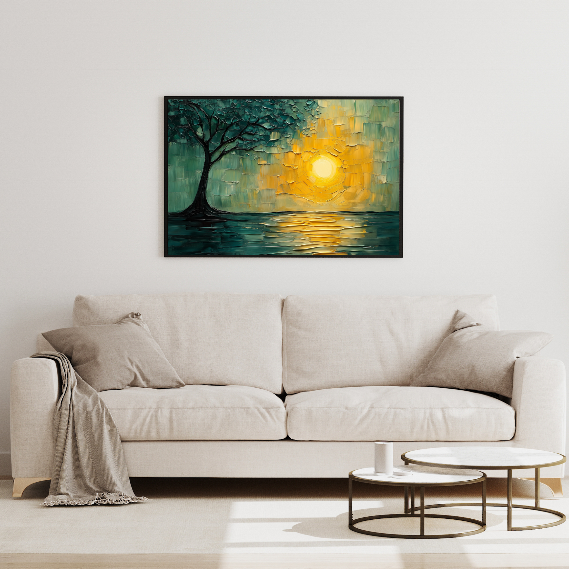 Immerse yourself in the serene beauty of our textured abstract landscape painting. This captivating artwork features a majestic tree with lush green foliage standing proudly in the foreground, its branches gracefully extending over a tranquil body of water. The sky comes alive with a vibrant orange and yellow sunset, casting a warm, golden glow across the entire scene. The water's surface mirrors the sky's radiant colors, creating a perfect harmony of reflection and reality. With its clear, pronounced brush textures and 3D paint effects, this piece brings depth and tactile appeal to your space. Ideal for those seeking a peaceful yet visually striking focal point, this abstract landscape transforms any room into a haven of tranquility and natural beauty.