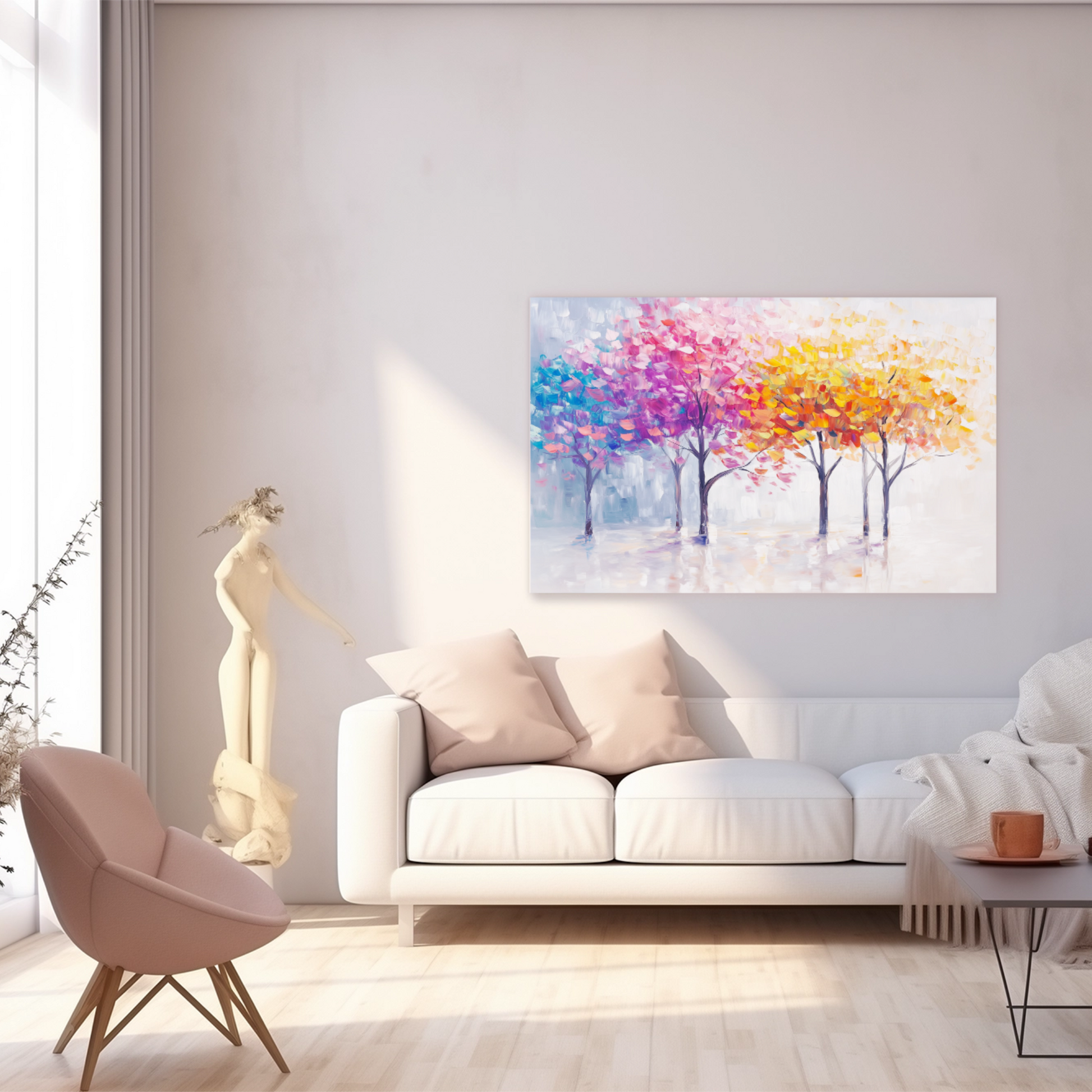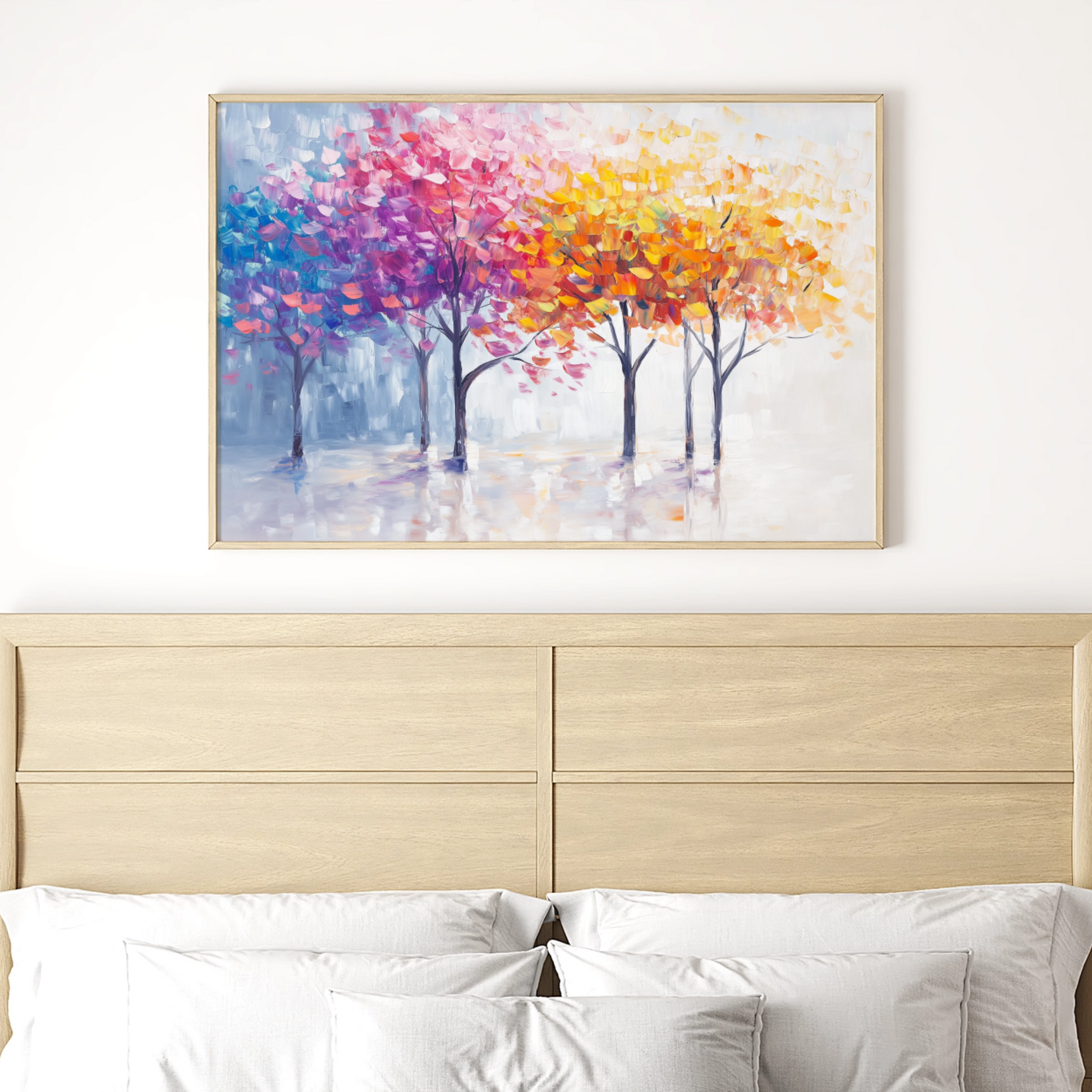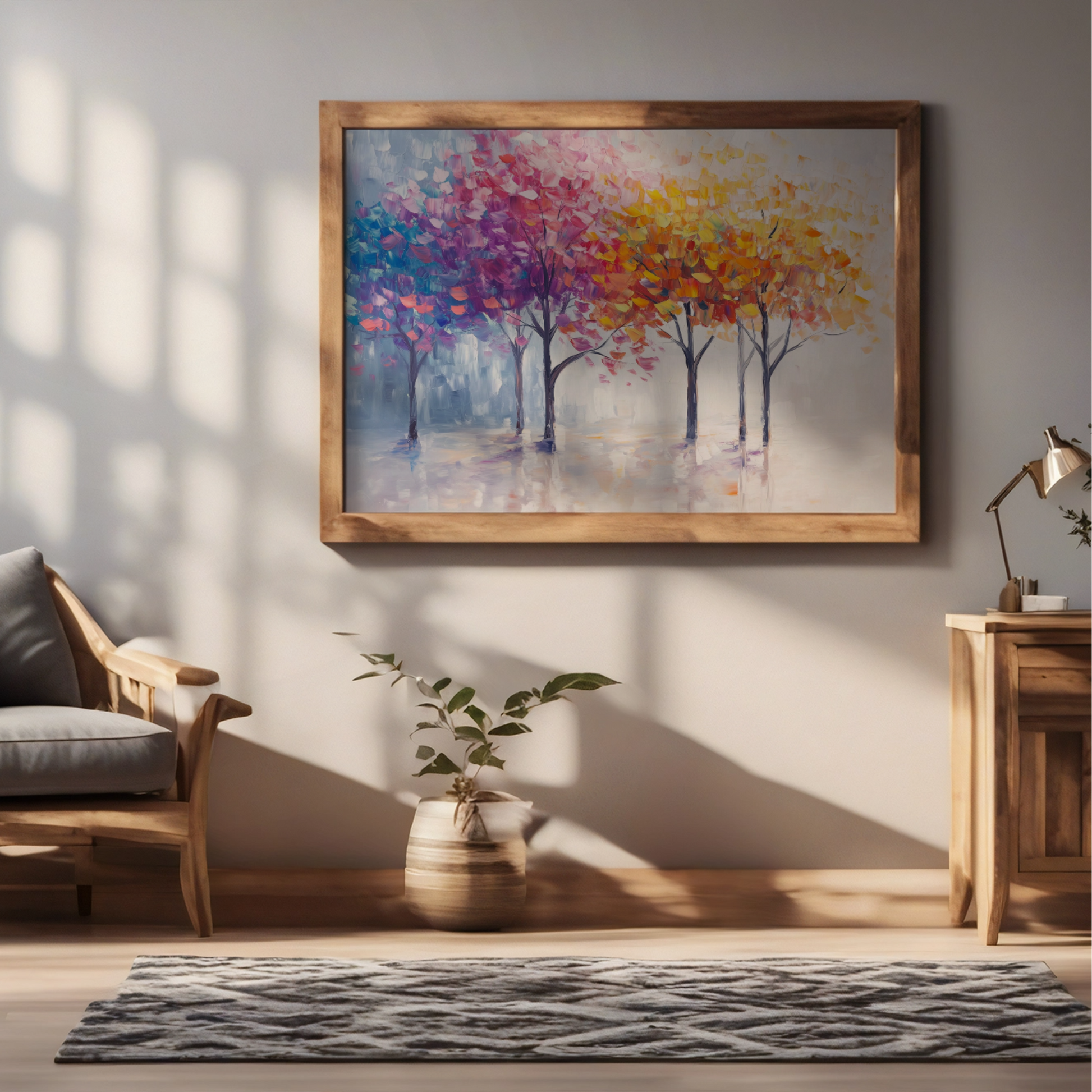 Transform your space with our enchanting wall art featuring a colorful landscape of abstract trees. This captivating piece showcases a row of whimsical trees in the foreground, their vibrant leaves bursting with shades of pink, purple, orange, and yellow. Set against a softly blurred background suggesting a rainy or misty atmosphere, the artwork creates a dreamlike, impressionistic scene. Perfect for those who appreciate modern art and nature-inspired decor, this piece adds a touch of magic and color to any room, making it an ideal focal point for your home or office.