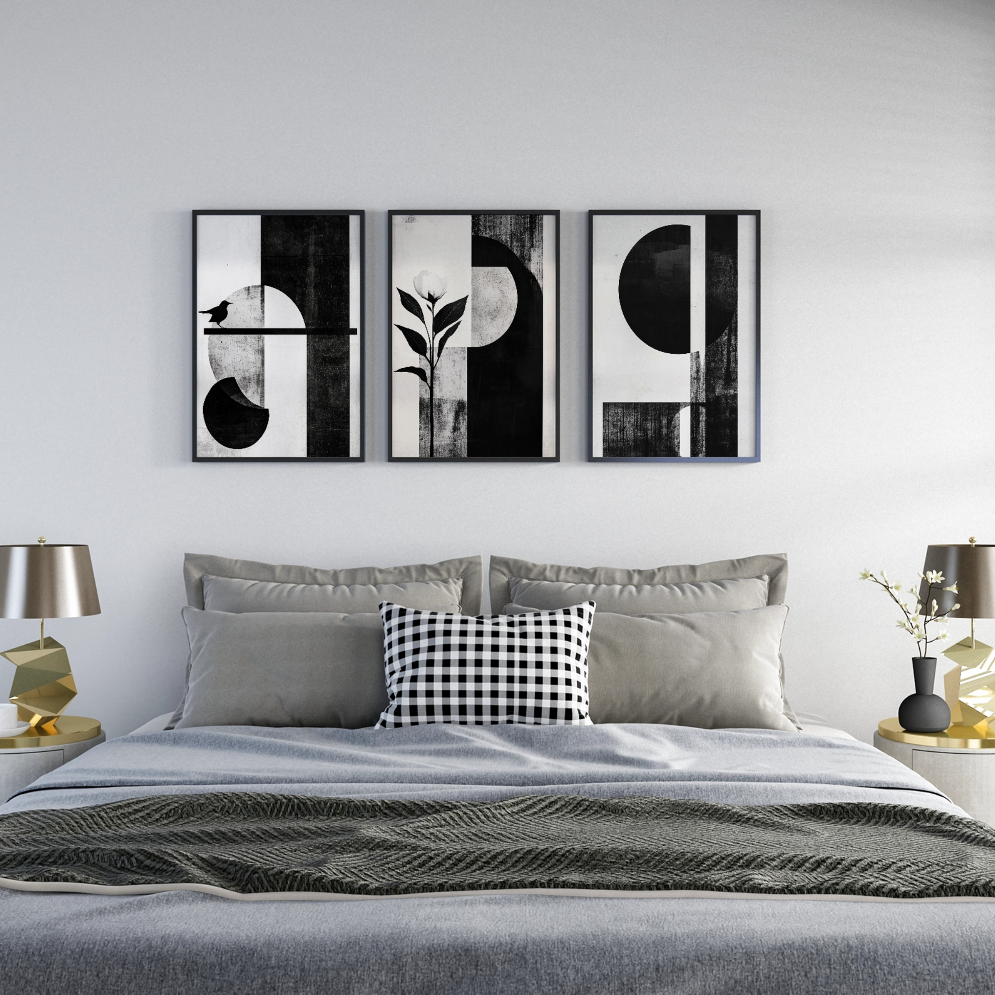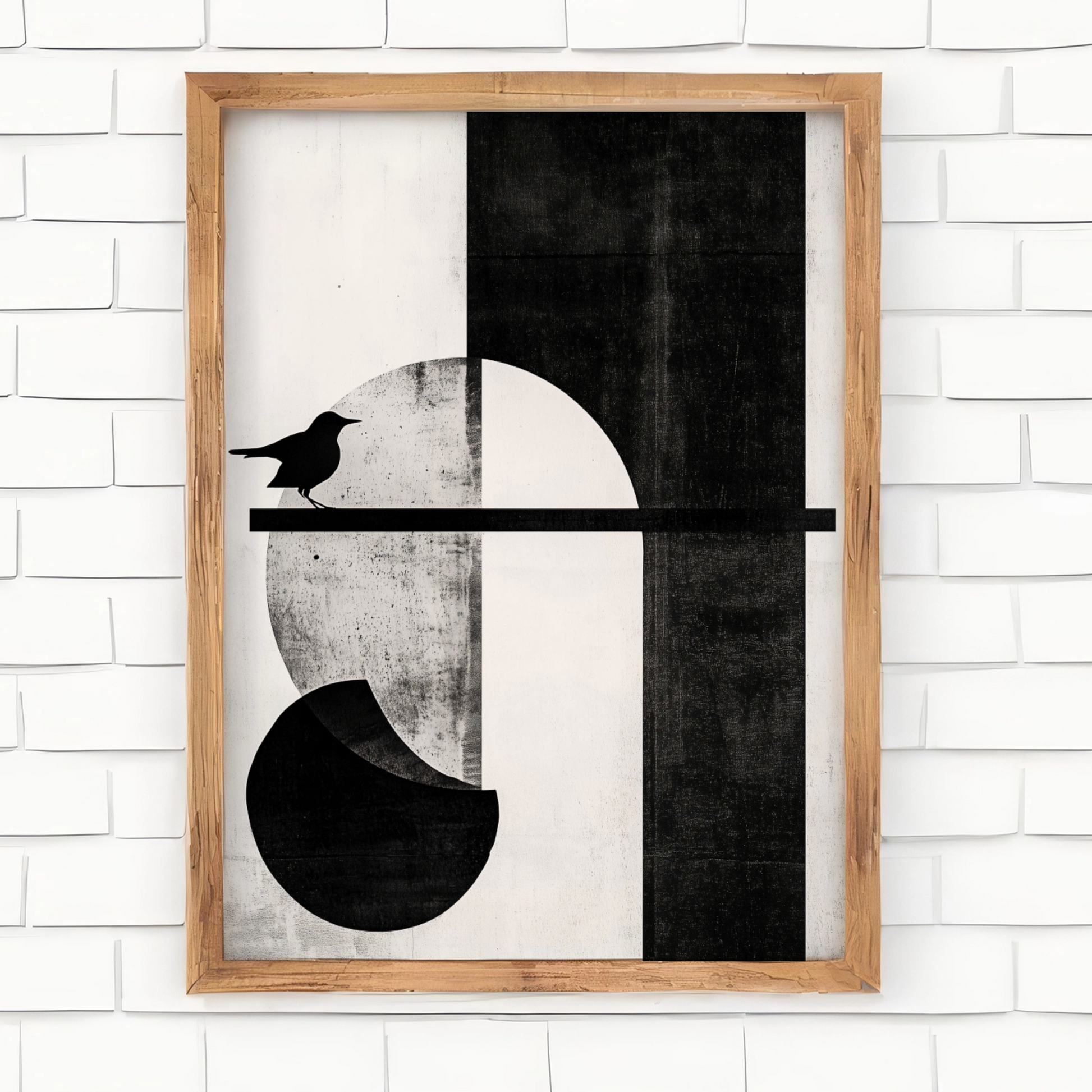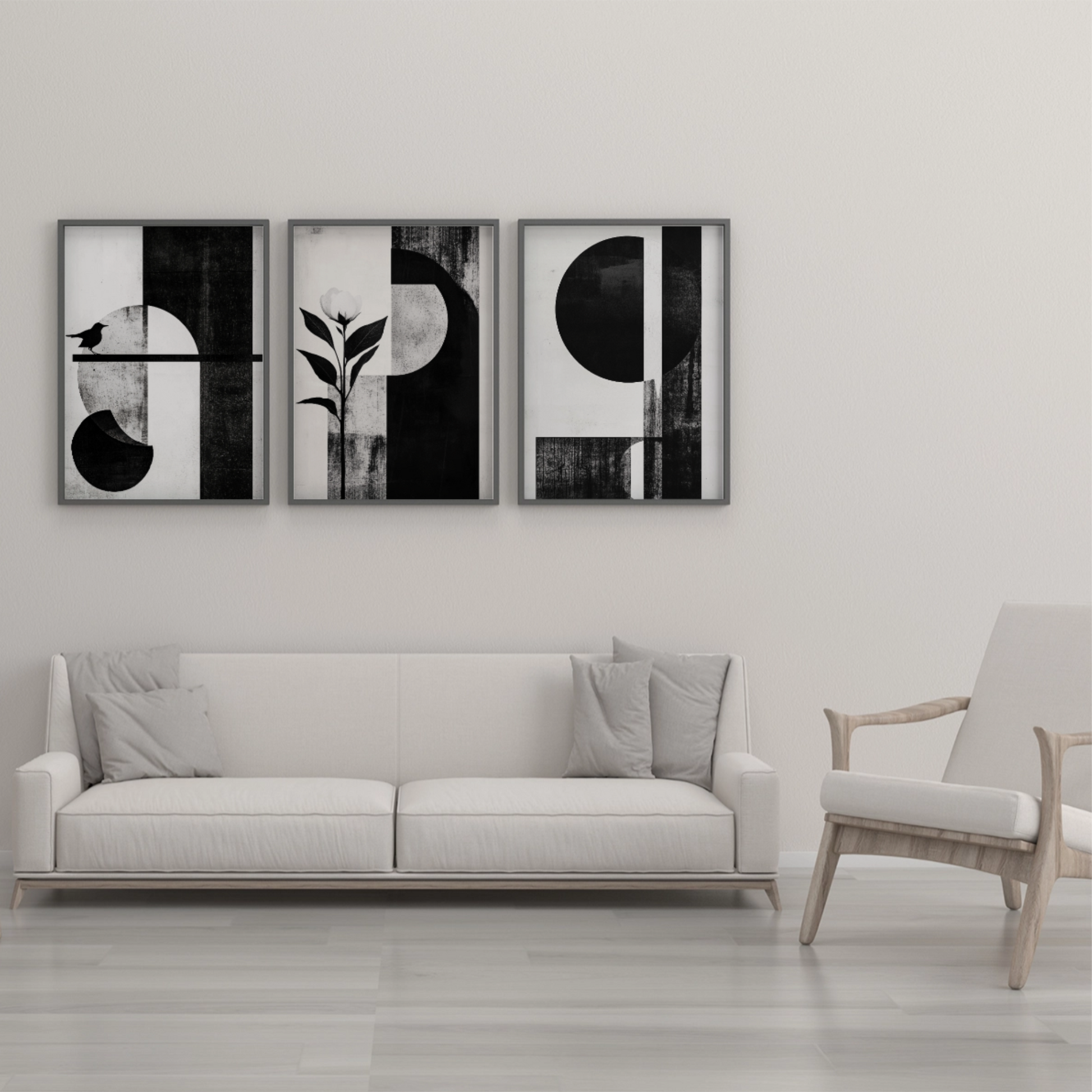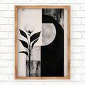 Elevate your space with our striking Scandinavian-inspired wall art. This minimalist piece features a harmonious composition of a sun, flower, and bird, alongside other abstract shapes, rendered in a sophisticated palette of black, grey, and white. Set against a crisp white canvas, the artwork embodies the essence of Scandinavian design with its clean lines and understated elegance. Perfect for modern interiors and those who appreciate minimalist aesthetics, this piece adds a touch of serene sophistication to any room, making it an ideal focal point for your home or office decor.
