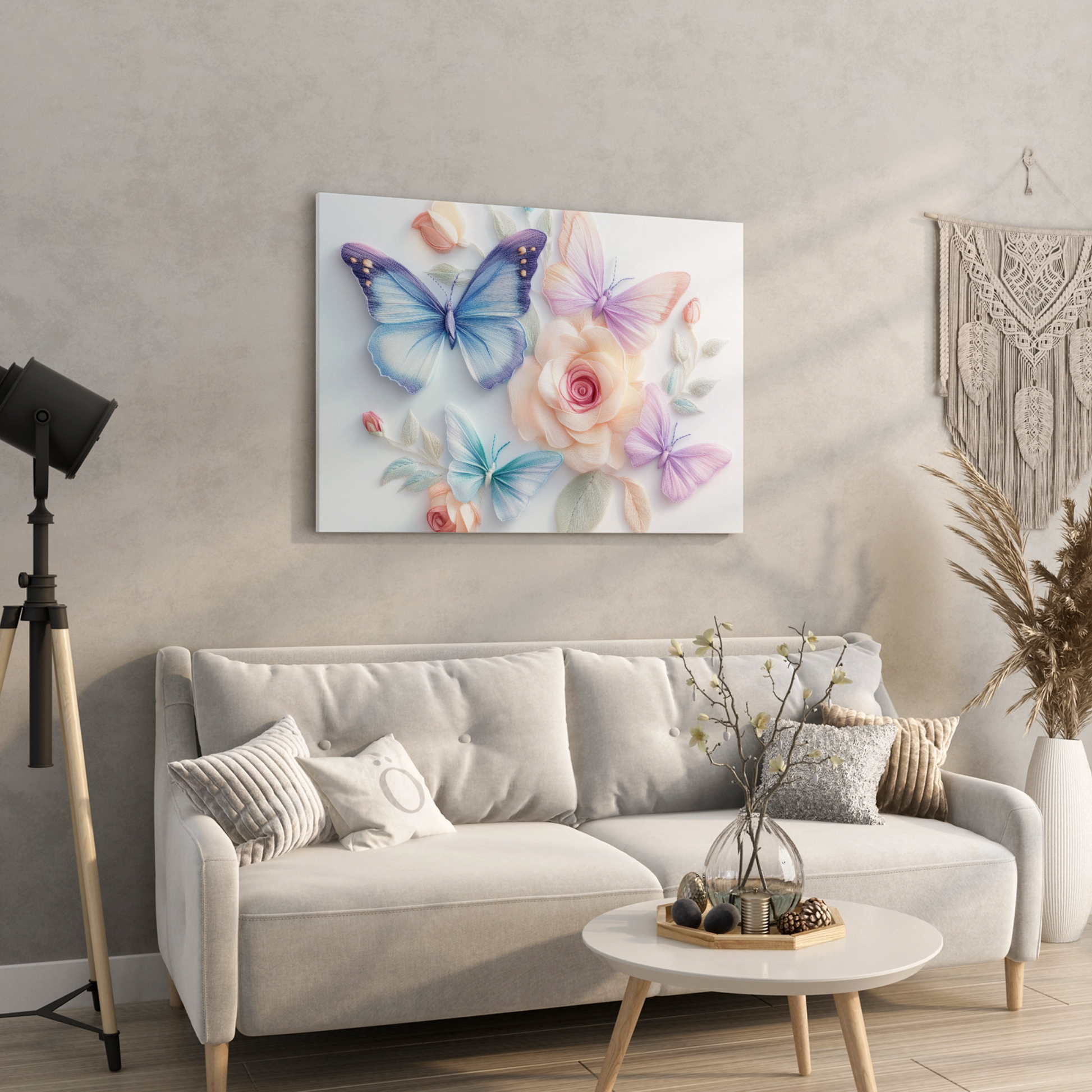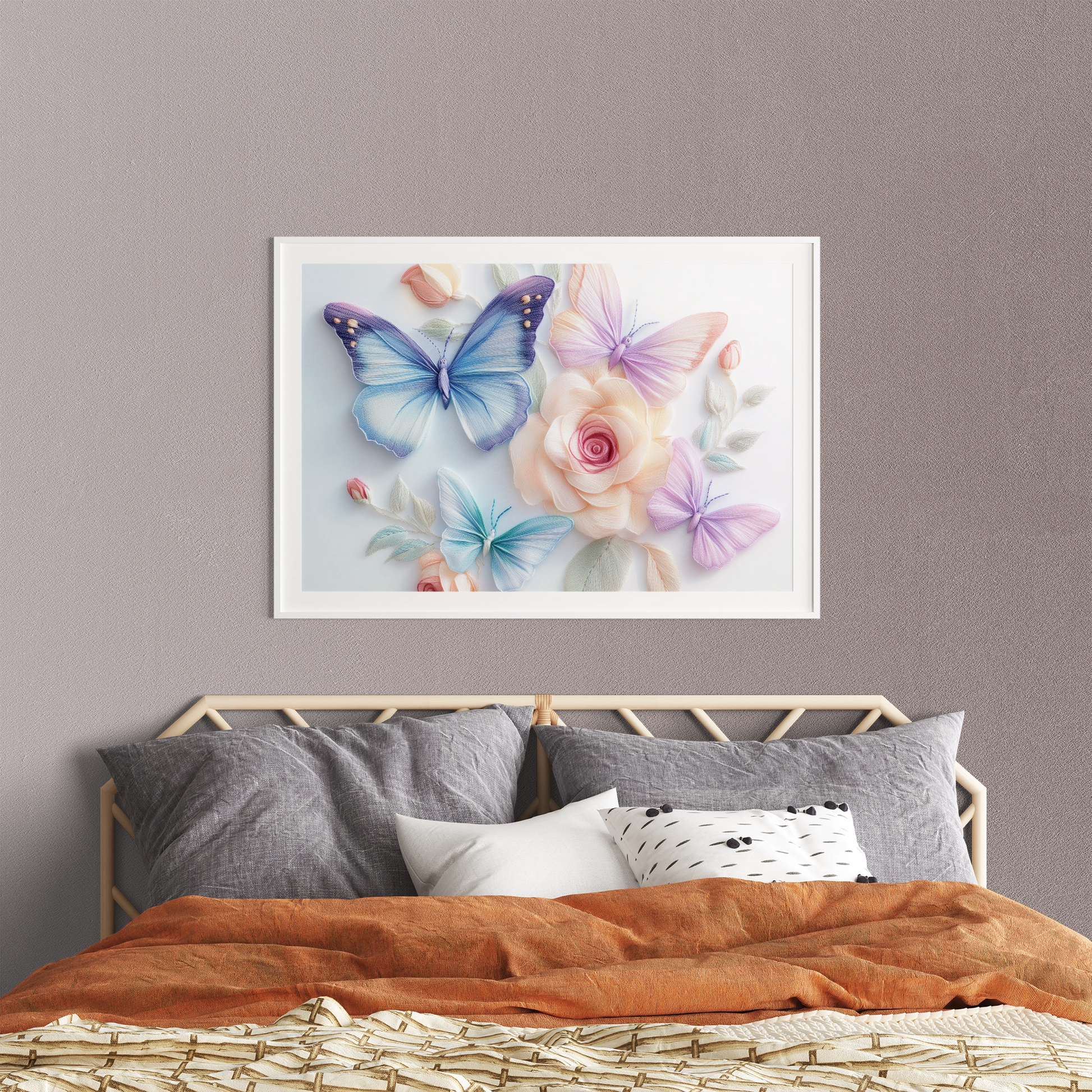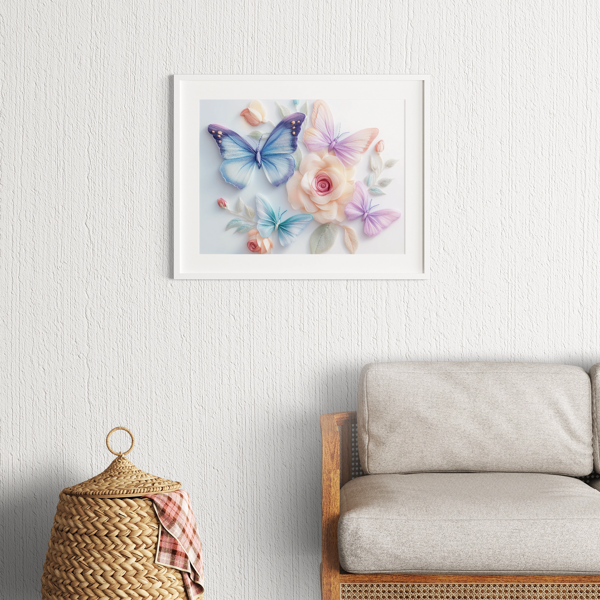 Elevate your space with our exquisite wall art painting featuring stunning 3D embroidered butterflies and roses. This masterpiece showcases intricate needlework in soft pastel colors, set against a crisp white background for maximum visual impact. The delicate butterflies appear to flutter among the beautifully crafted roses, creating a sense of depth and movement. Perfect for adding a touch of elegance to any room, this unique artwork combines the charm of traditional embroidery with contemporary 3D techniques. Whether displayed in a living area, bedroom, or nursery, this piece brings a serene and sophisticated atmosphere to your decor.