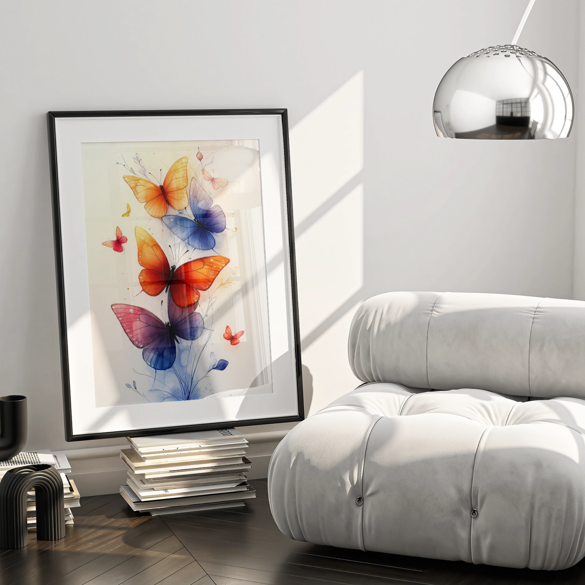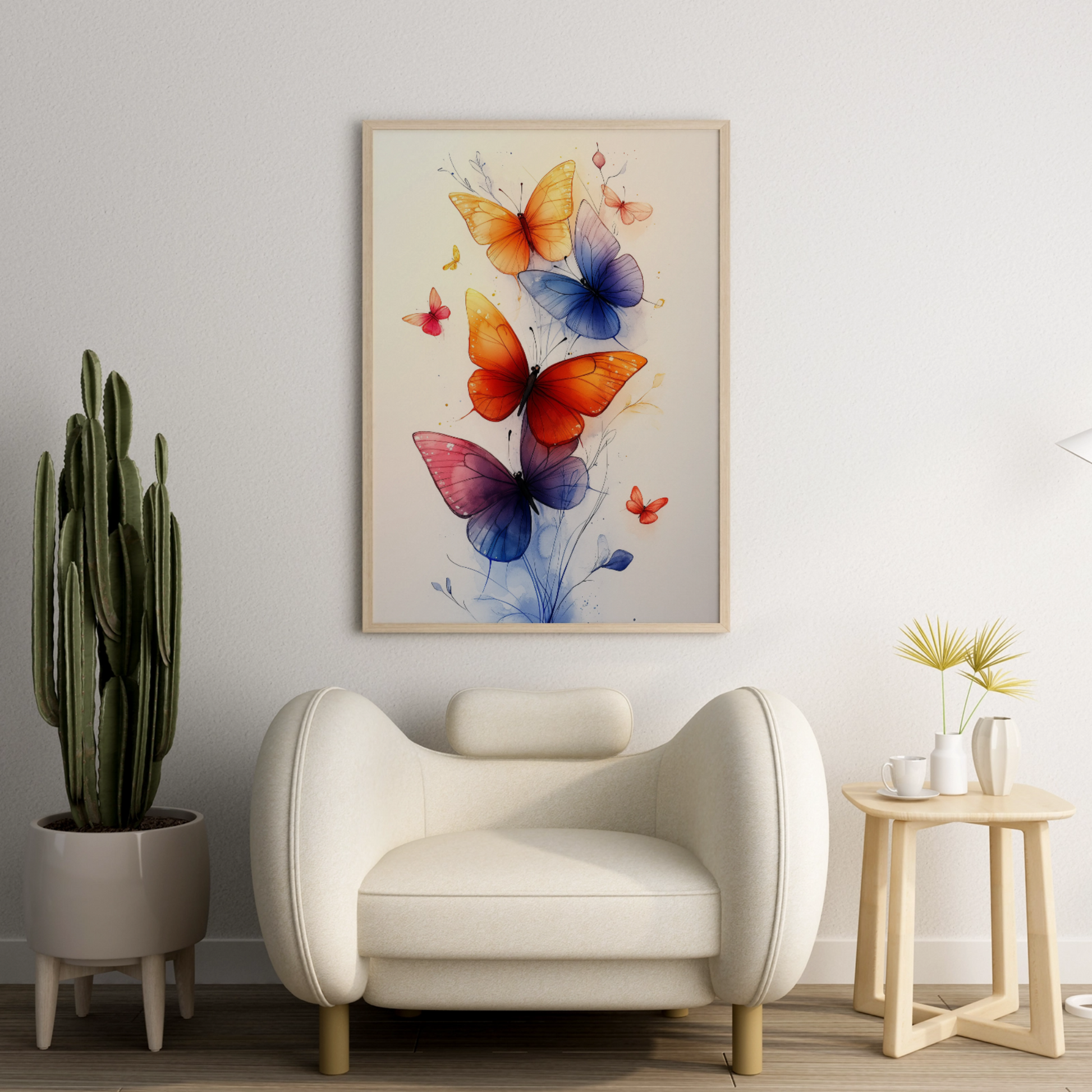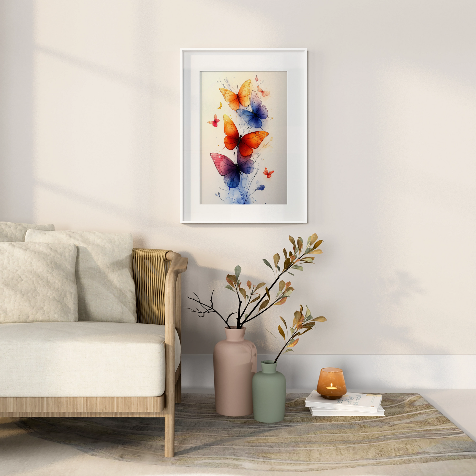 Transform your space with our stunning wall art featuring a breathtaking collection of colorful butterflies. This captivating piece showcases delicate butterflies in rich shades of orange, blue, and purple, each with intricately detailed wings and graceful antennae. Floating against a pristine white background, these elegant creatures create a mesmerizing visual symphony that brings life and movement to any room. Perfect for modern interiors, nature lovers, and art enthusiasts, this artwork captures the ethereal beauty of butterflies in a sophisticated and dynamic composition. Whether displayed in a living room, bedroom, or office, this piece will become an instant focal point that inspires wonder and adds a touch of natural elegance to your decor.