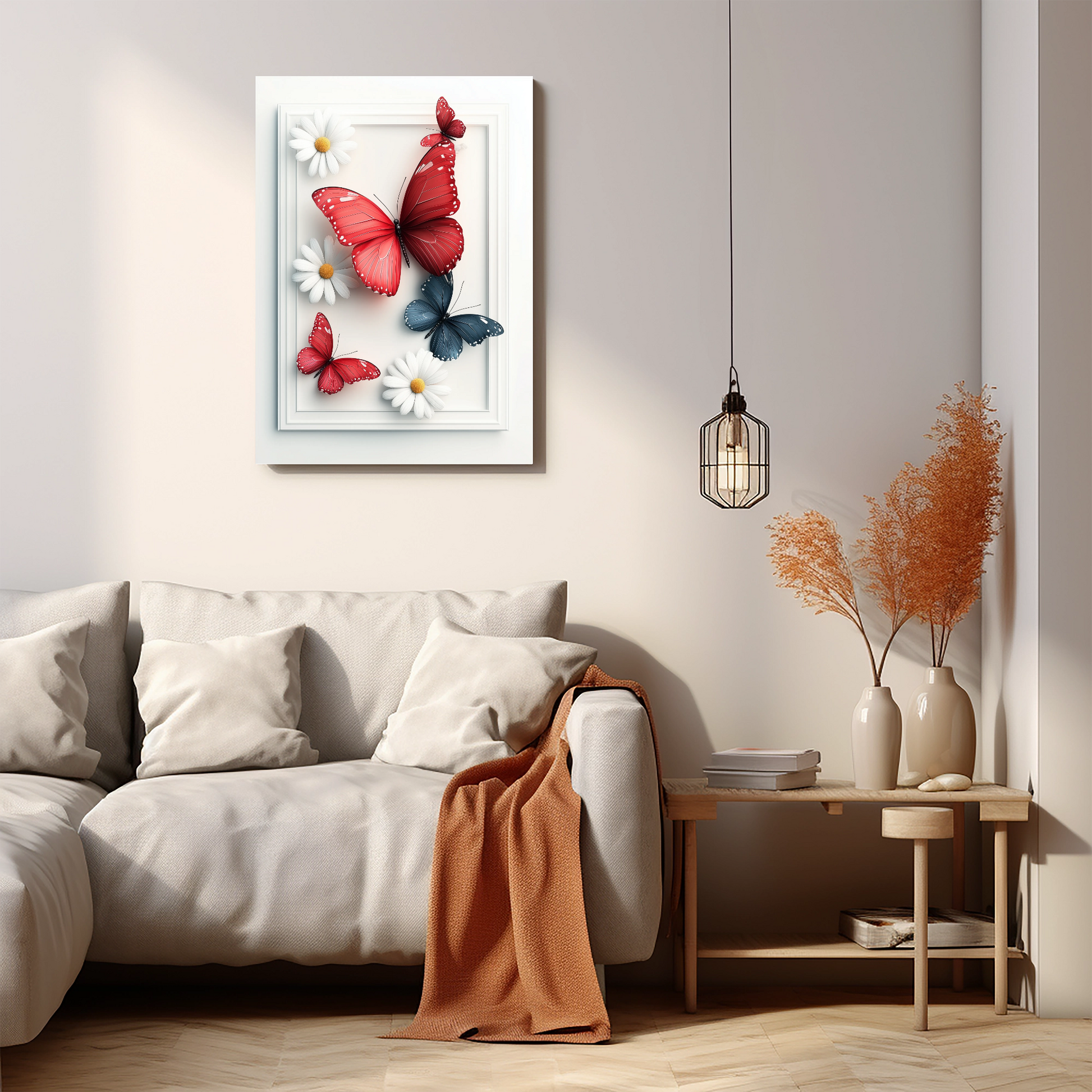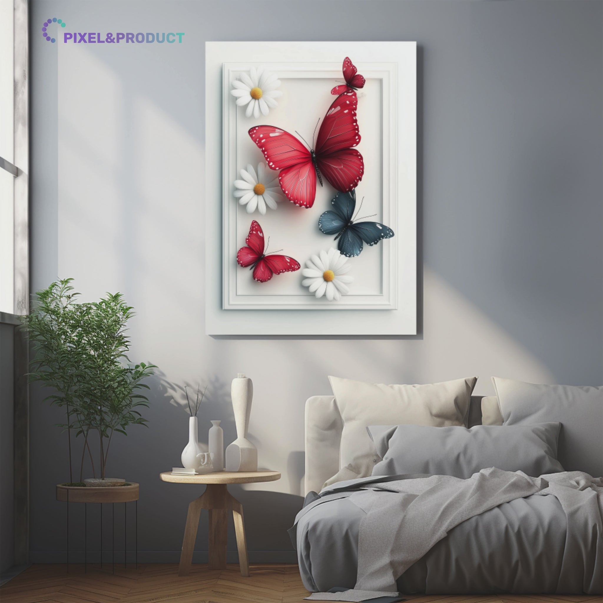 Elevate your space with our exquisite 3D wall art featuring a stunning composition of red and blue butterflies gracefully intertwined with delicate white daisies. Set against a pristine white background and framed in an elegant white 3D frame, this artwork creates a captivating visual symphony of color and nature. The intricate design brings depth and movement to your decor, with vibrant butterflies seemingly poised to take flight among soft, blooming daisies. Perfect for modern interiors, nature lovers, and art enthusiasts, this piece transforms any room into a sophisticated botanical sanctuary that celebrates the delicate beauty of butterflies and flowers.