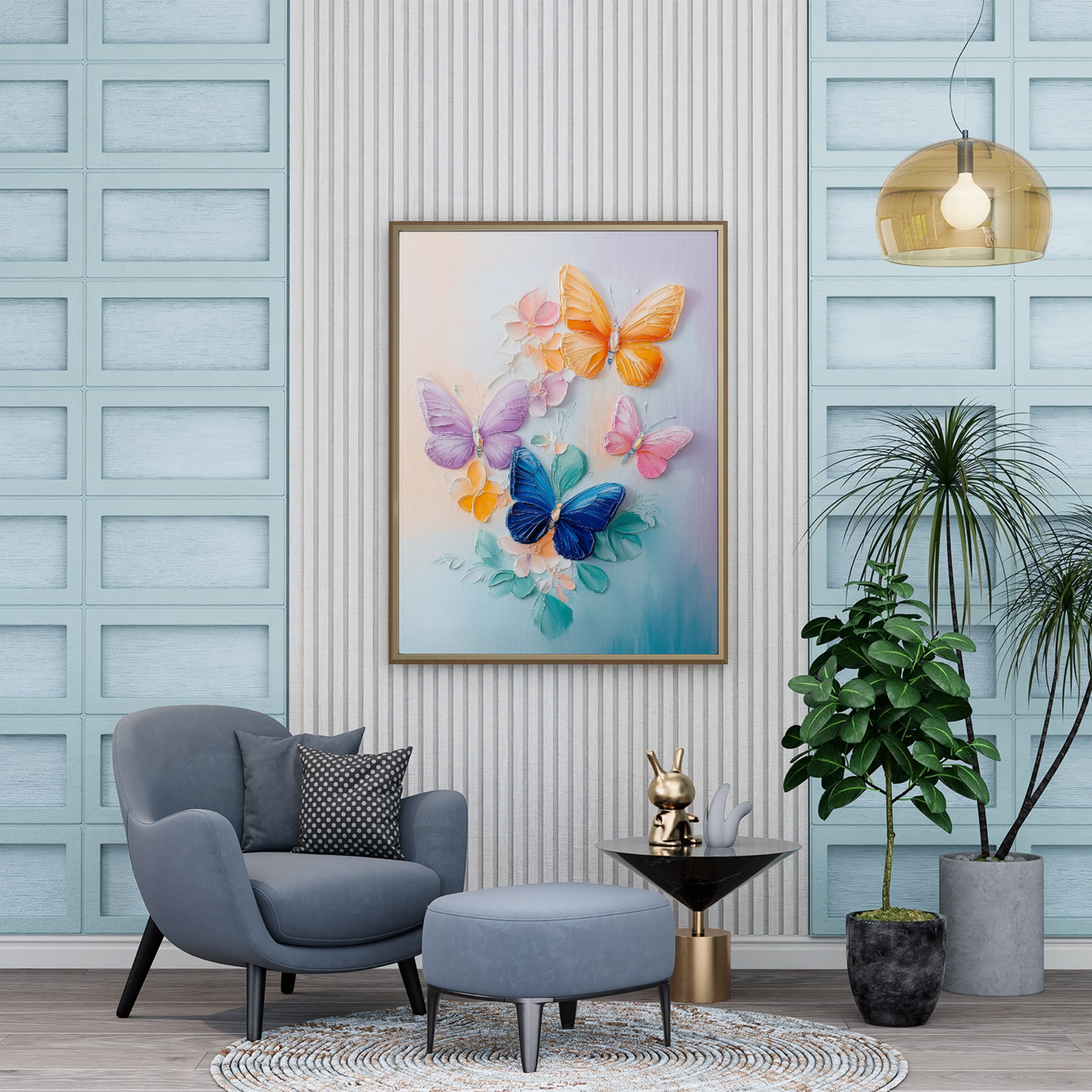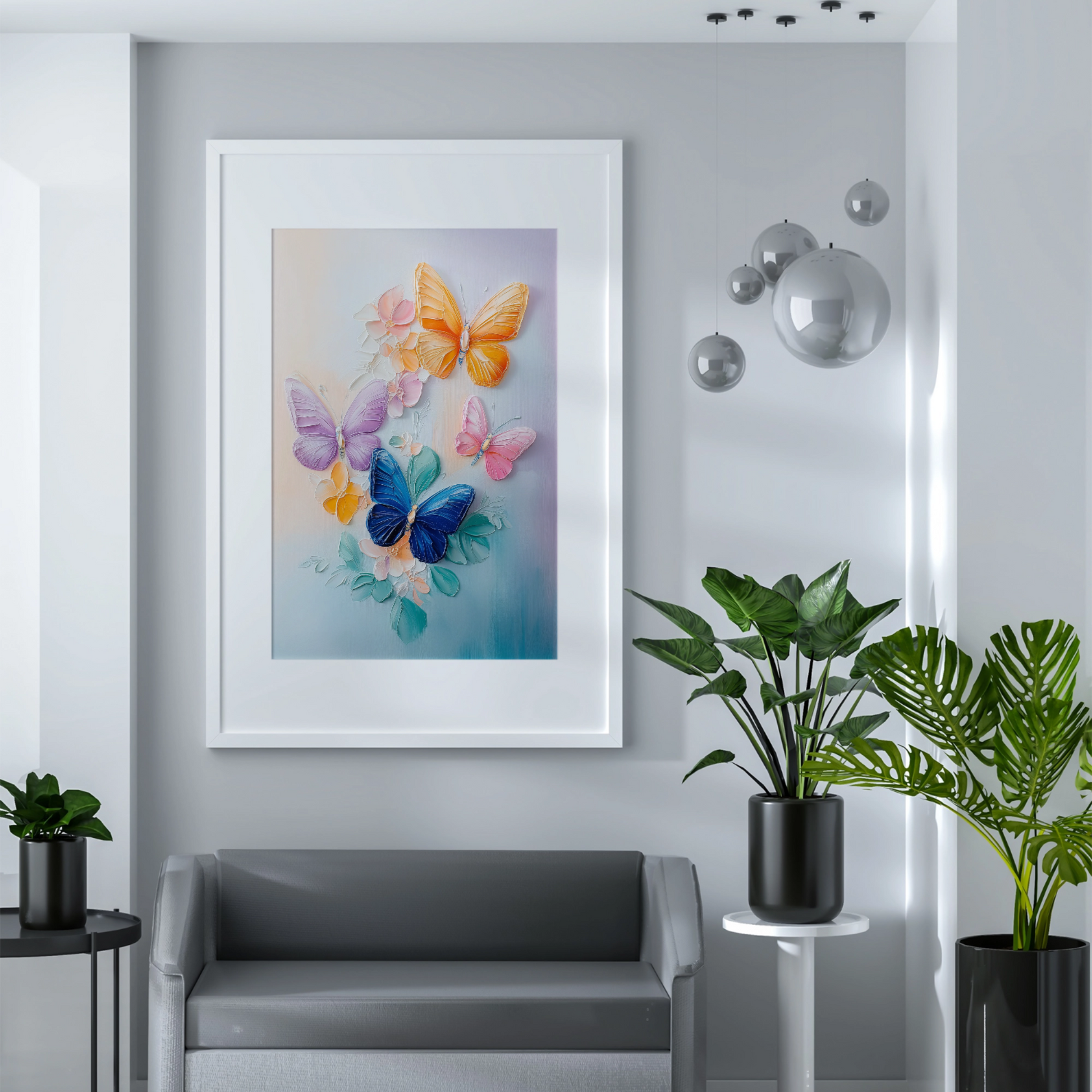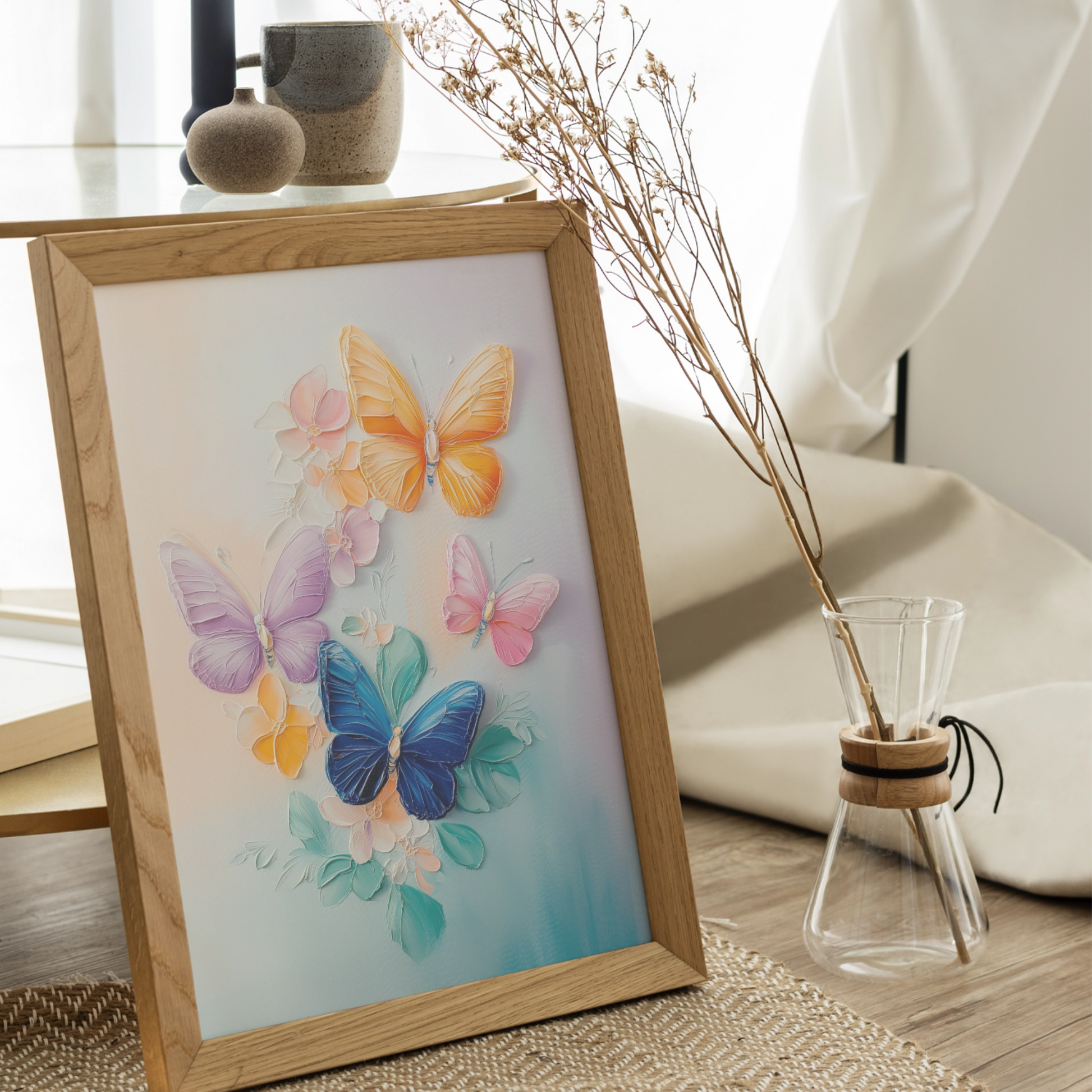 Elevate your decor with our stunning artwork featuring three butterflies of varying sizes, each adorned in rich, vibrant colors as they gracefully flutter through the air. The background is a captivating blend of abstract flowers and plants, showcasing a dynamic mix of hues that enhance the overall composition. This enchanting piece captures the essence of nature's beauty and movement, making it perfect for butterfly enthusiasts and art lovers alike. Ideal for brightening up any room, this artwork adds a touch of whimsy and color to your home or office space.