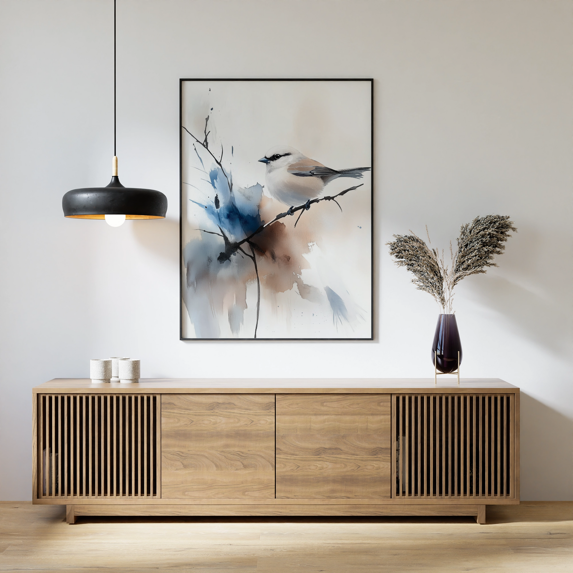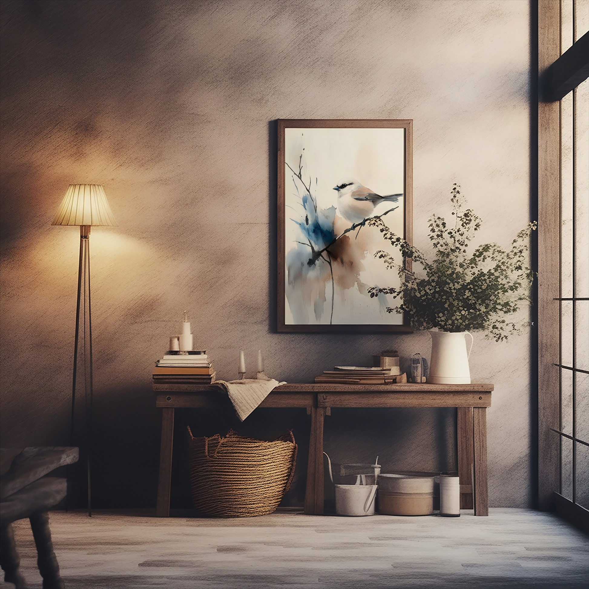 Enhance your decor with our beautiful watercolor painting featuring a tranquil sparrow perched delicately on a branch. This artwork captures the essence of serenity, showcasing the gentle hues and soft brushstrokes that define the bird's graceful form against a calming background. The subtle colors evoke a sense of peace and harmony, making it an ideal addition to any room seeking a touch of nature's tranquility. Perfect for bird lovers and art enthusiasts alike, this piece brings the beauty of wildlife indoors, creating a soothing focal point that inspires relaxation and appreciation for the natural world. Transform your space with this elegant representation of a sparrow in its serene habitat.