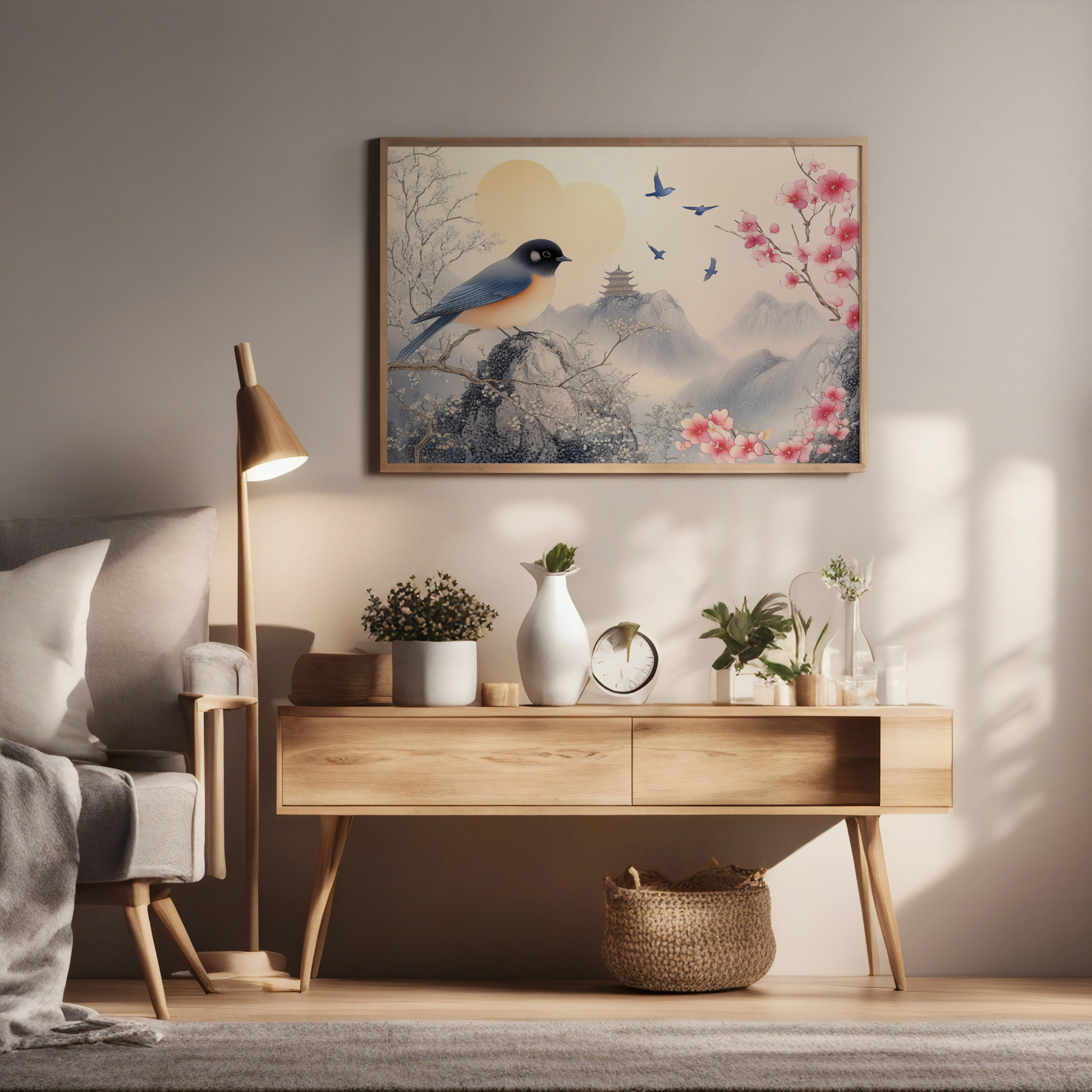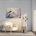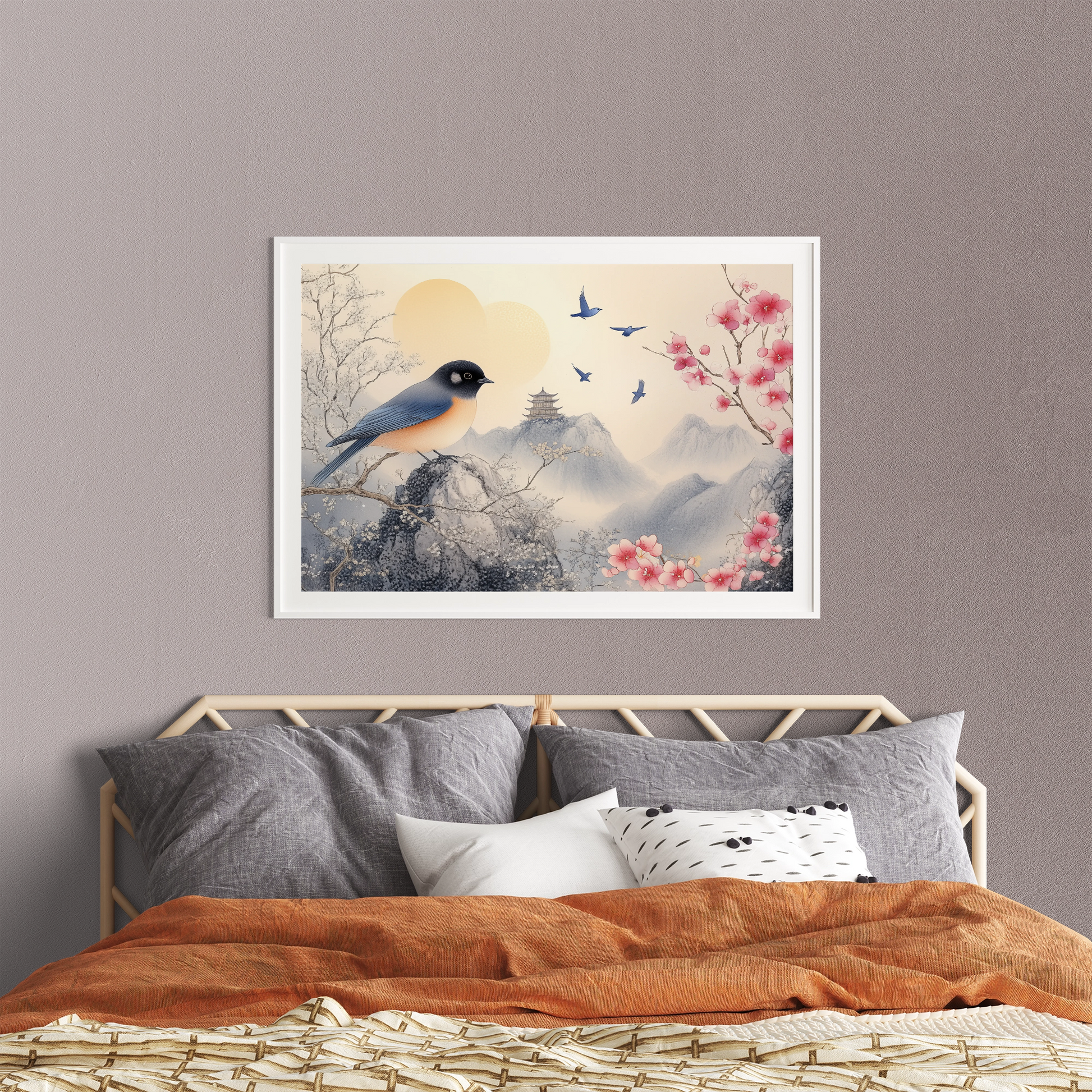 Elevate your space with our stunning wall art featuring an elegant bird perched gracefully on a branch. This captivating illustration showcases a vibrant ecosystem teeming with life, as flying birds soar through a sky adorned with soft clouds. Lush flowers surround the central figure, while majestic mountains create a breathtaking backdrop. Every intricate detail is brought to life through vivid colors and meticulous artistry, from the delicate feathers of the birds to the subtle textures of the foliage. This artwork transforms any room into a celebration of nature's beauty, perfect for those seeking to bring the outdoors in with a touch of elegance and wonder.