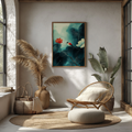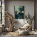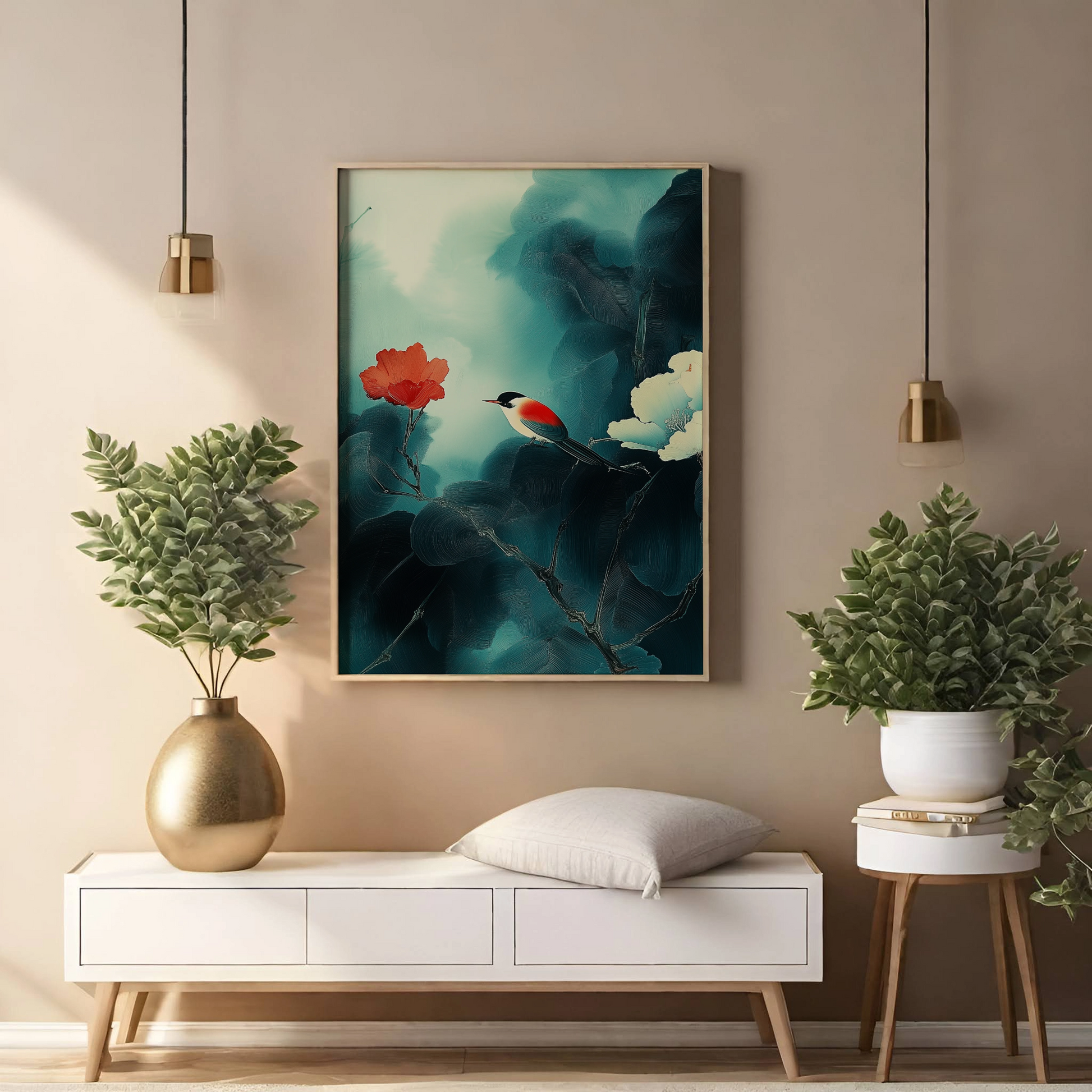 Transform your space with our striking minimalist wall art featuring a vibrant red bird perched elegantly on a branch. Set against a backdrop of lush, misty forest in deep, dark green hues, this piece captures the essence of tranquility and natural beauty. A single red flower adds a subtle touch of harmony to the composition. Inspired by minimalist design principles, this artwork creates a powerful visual impact through its bold color contrasts and simplicity. Perfect for modern interiors, meditation spaces, or offices, this captivating piece brings a sense of serenity and sophistication to any room. Elevate your decor with this elegant representation of nature's quiet moments.