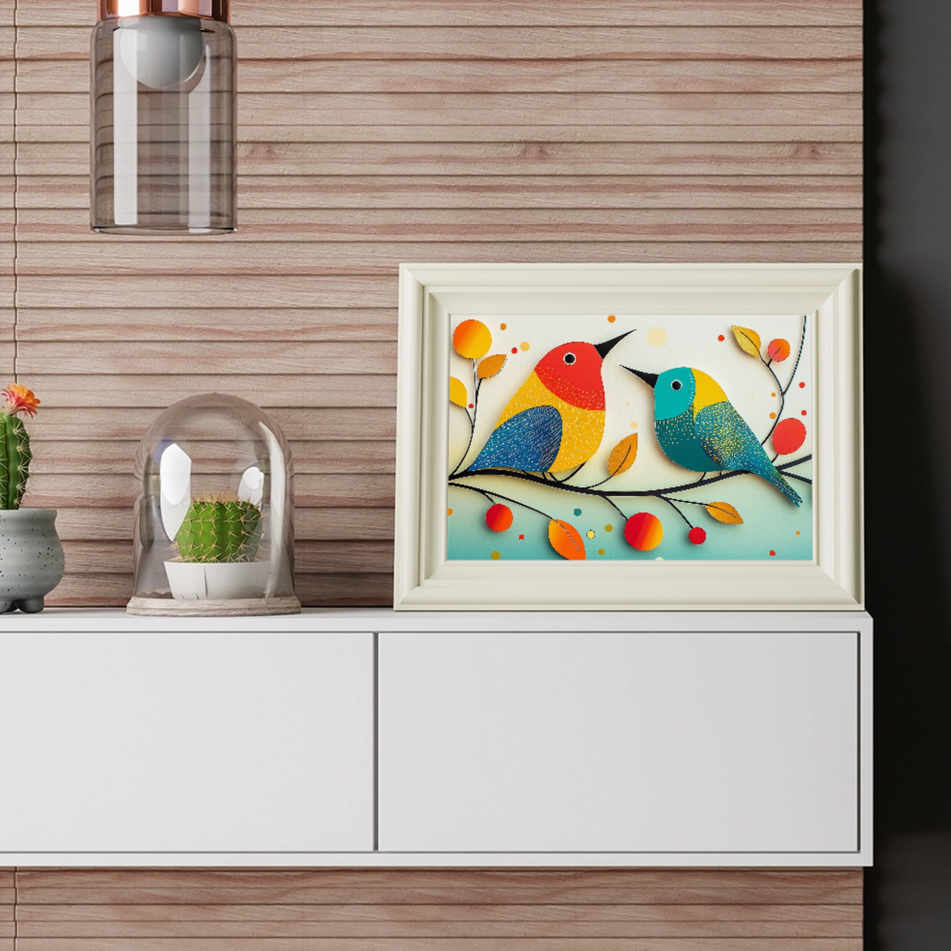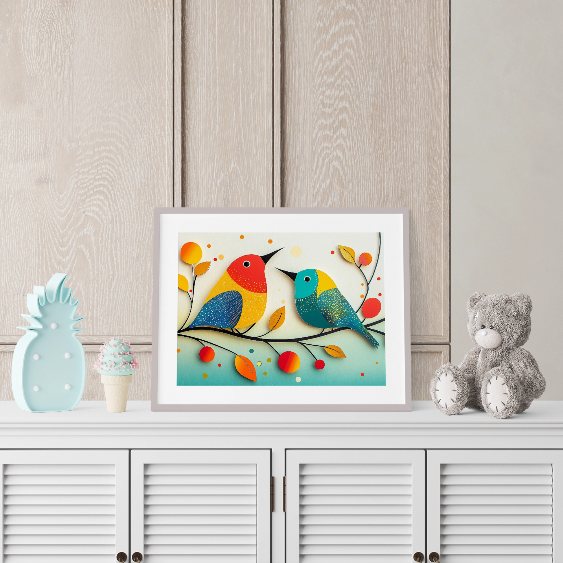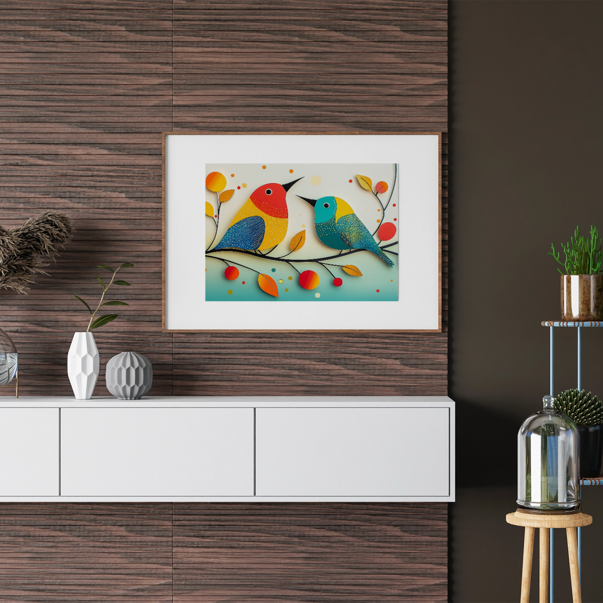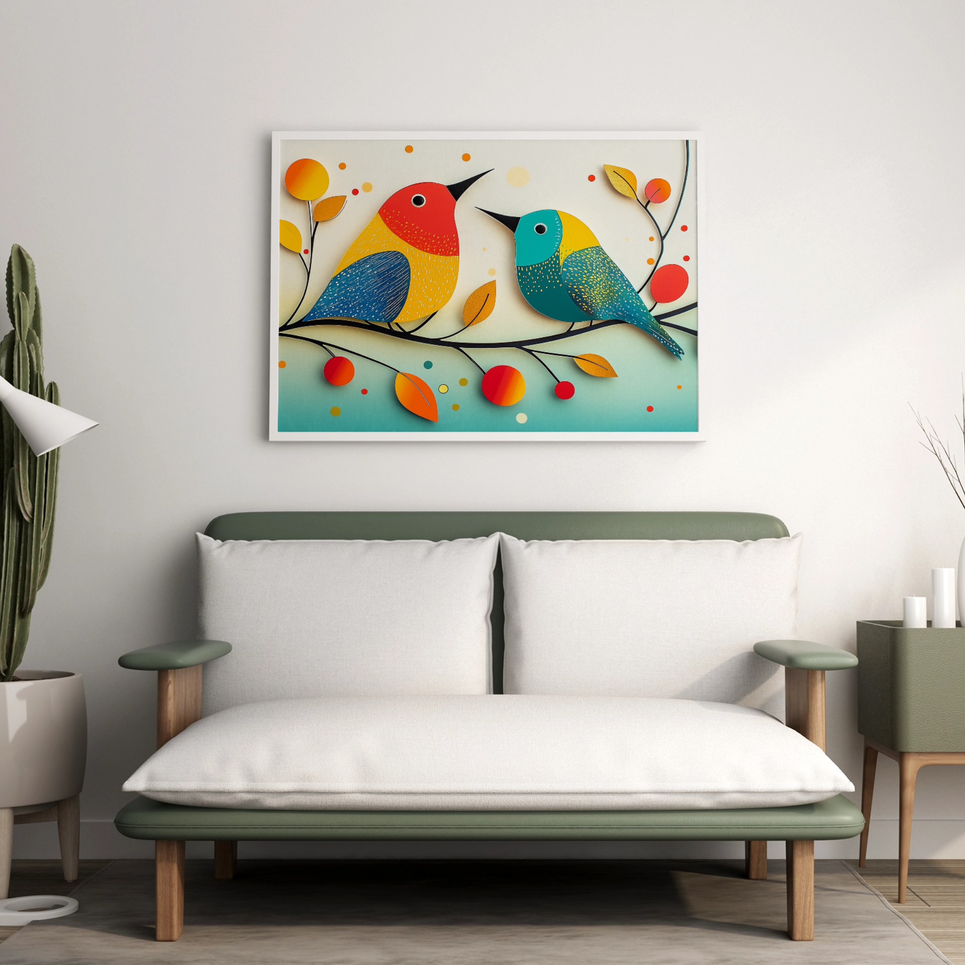 Elevate your decor with our enchanting wall art featuring two vibrant birds perched elegantly on a branch adorned with rich autumn leaves. Set against a light background sprinkled with whimsical polka dots, this artwork captures the playful essence of the season. The colorful plumage of the birds creates a striking contrast with the soft, dotted backdrop, bringing warmth and joy to any space. Perfect for nature lovers and those seeking a touch of seasonal charm, this piece transforms your room with its delightful blend of artistic design and natural beauty.