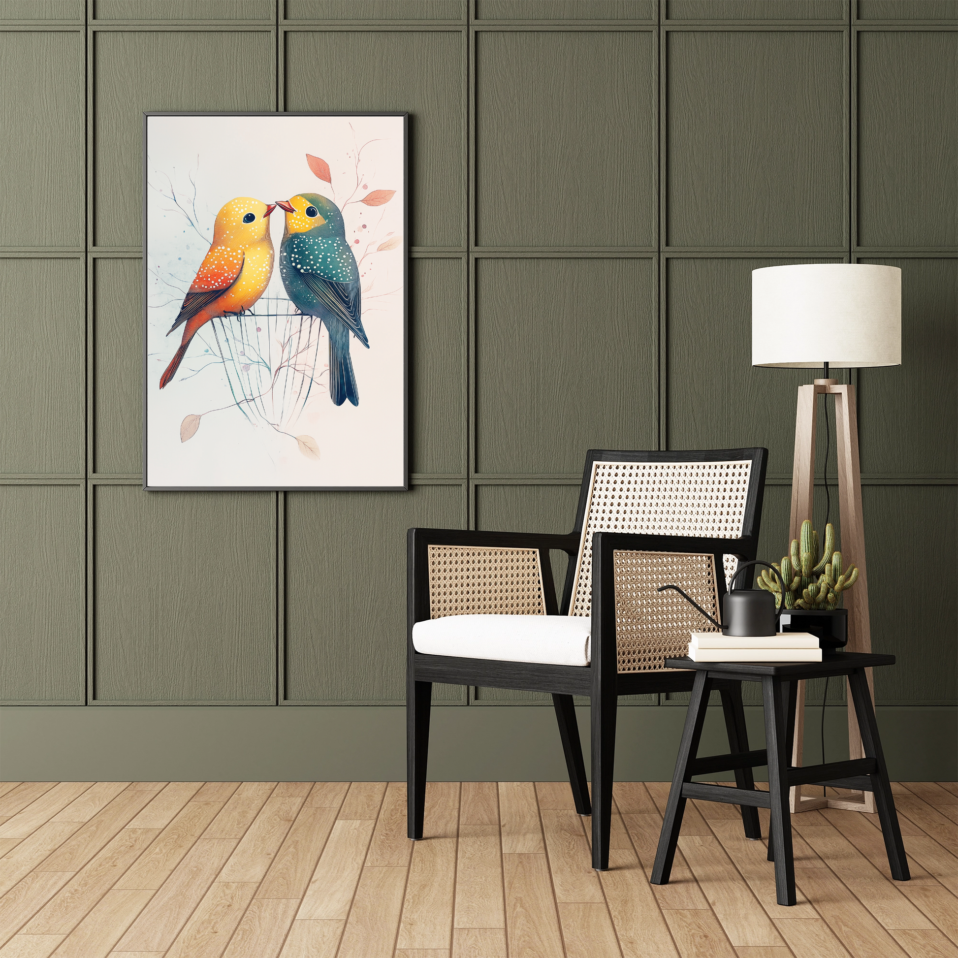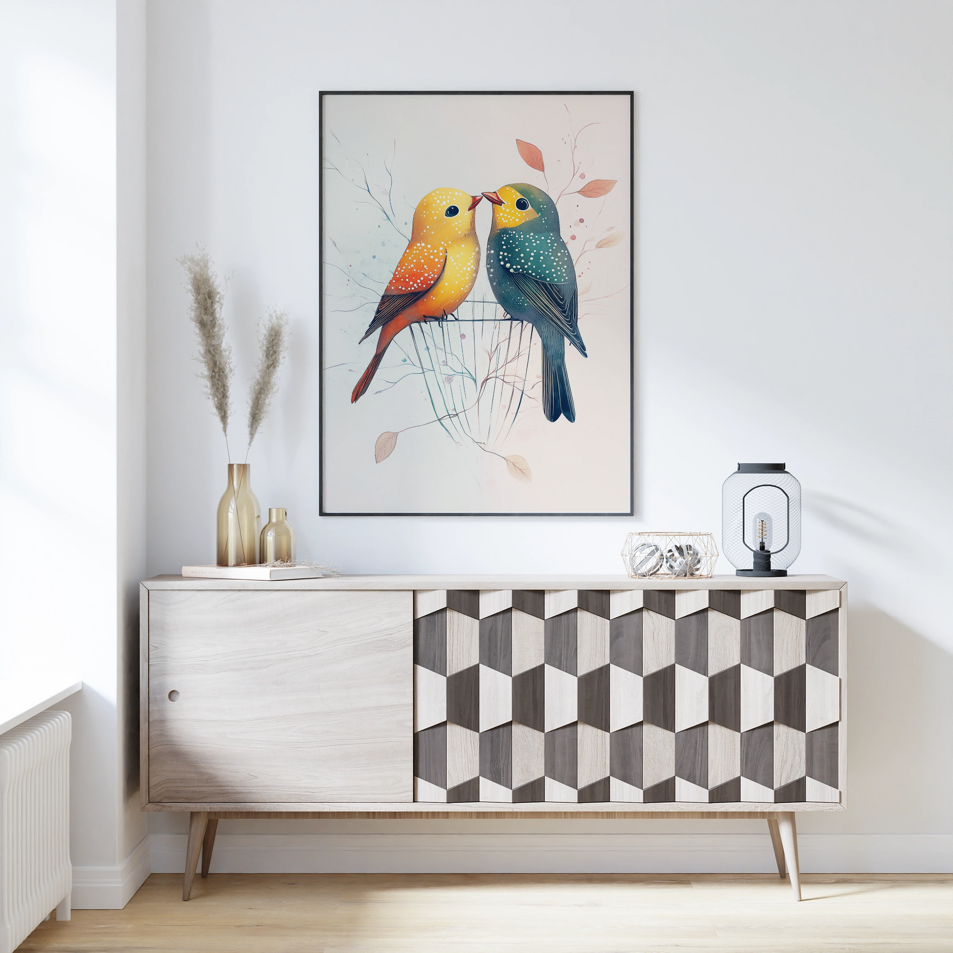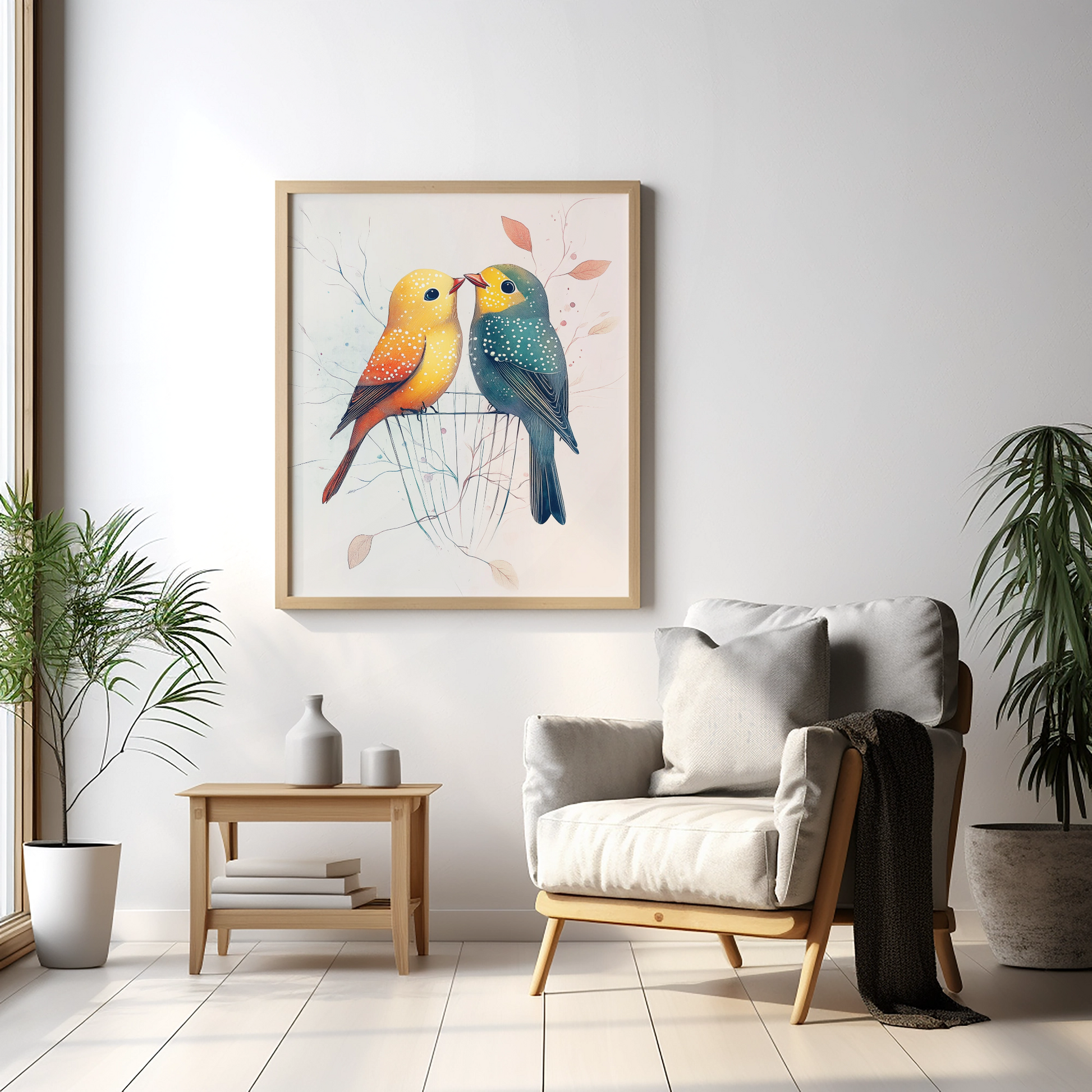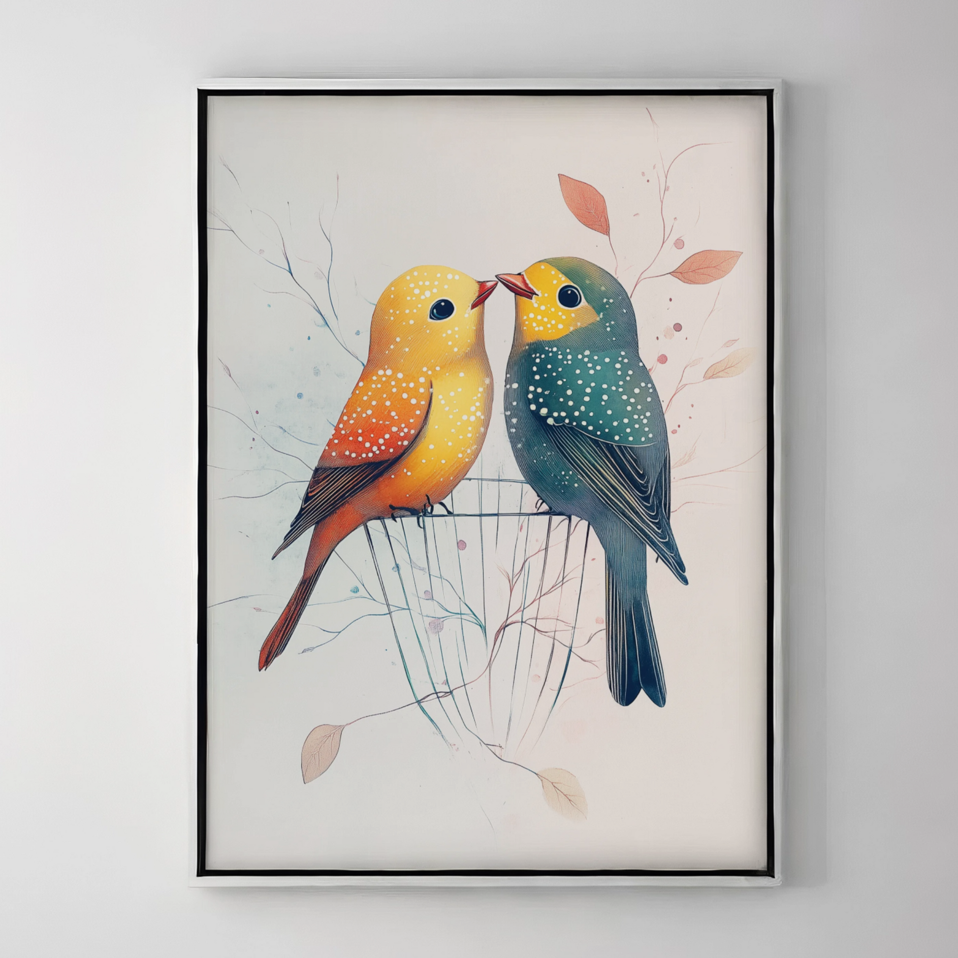 Brighten your space with our delightful wall art featuring two colorful birds perched gracefully on a wire cage. Set against a soft pastel background adorned with delicate leaves and branches, this artwork captures the essence of tranquility and nature's beauty. The vibrant colors of the birds contrast beautifully with the gentle hues of the backdrop, creating a harmonious and inviting atmosphere. Perfect for bird lovers and those seeking a touch of whimsy, this piece adds charm and character to any room. Transform your decor with this enchanting representation of avian life in a serene setting.
