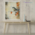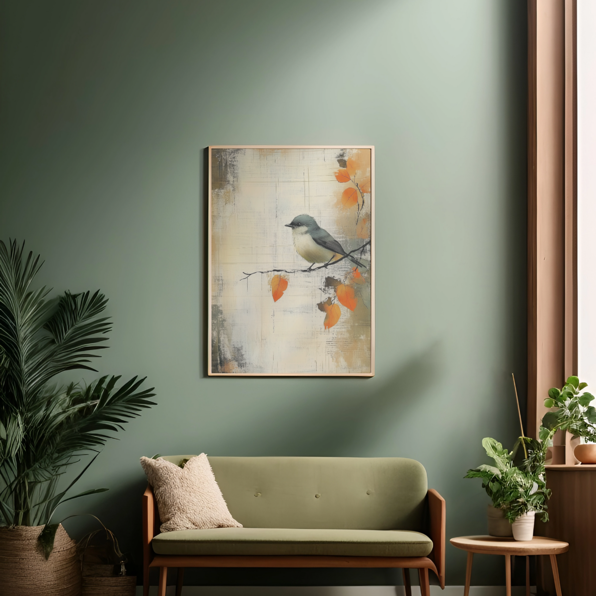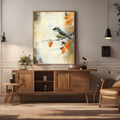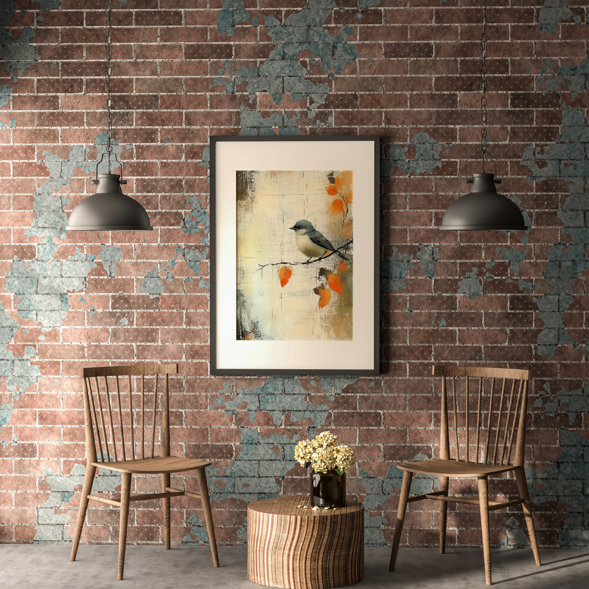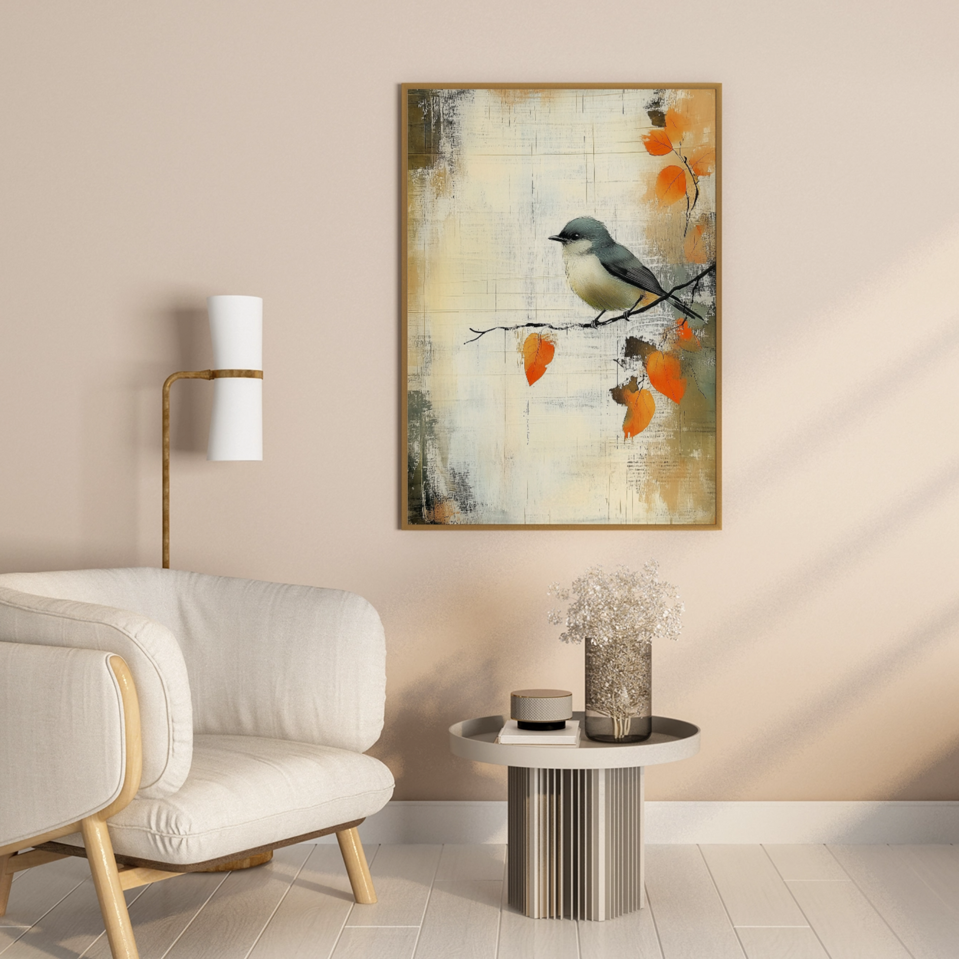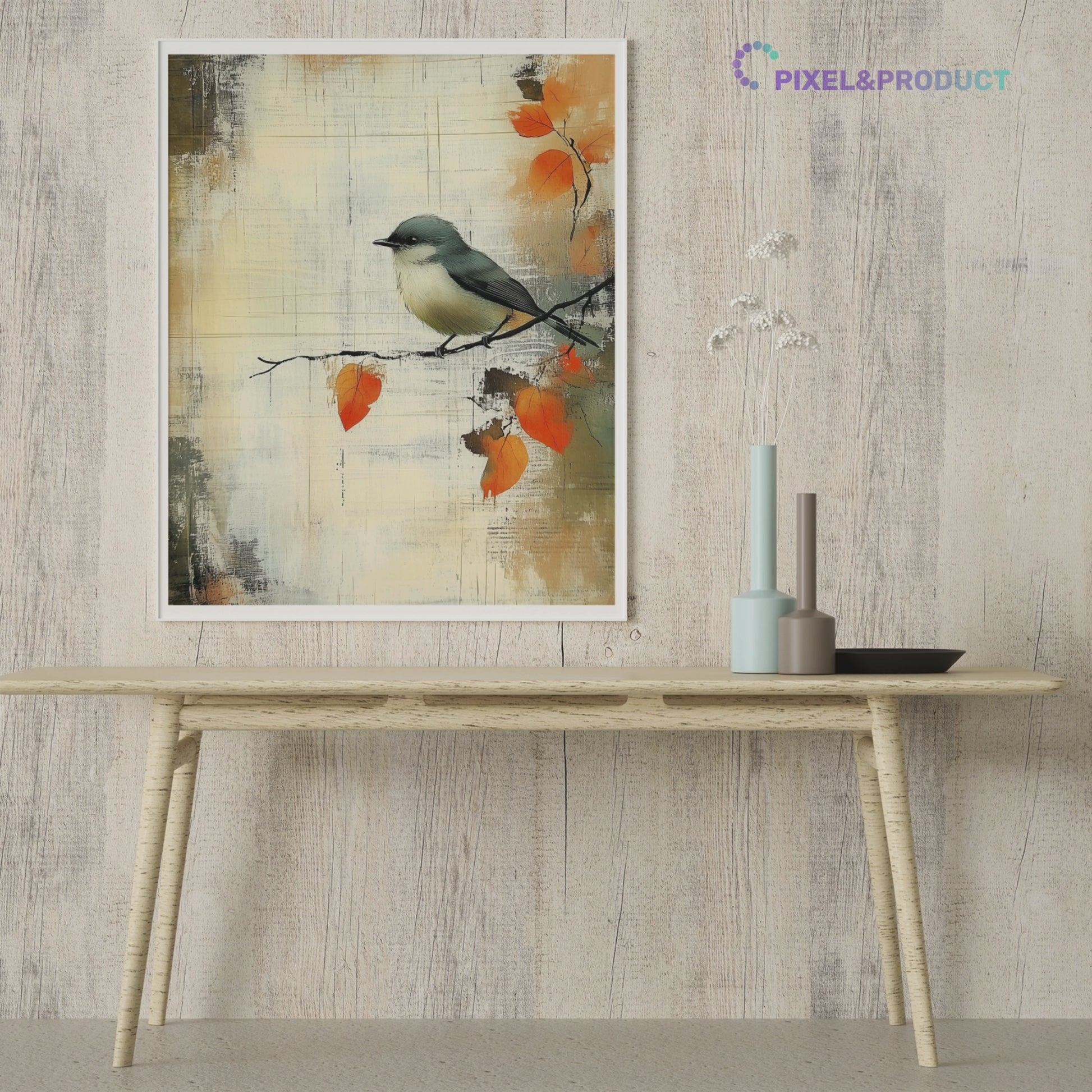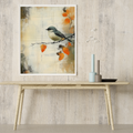 Transform your space with our enchanting wall art featuring a small gray bird perched delicately on a branch adorned with vibrant orange leaves. This beautiful watercolor illustration is set against a textured, abstract background that mimics the look of an old, weathered scrapbook sheet, complete with a distressed grunge effect. The vintage paper texture overlay adds depth and character, enhancing the lush detailing of the autumn leaves and the whimsical portrayal of the bird. Perfect for nature lovers and those who appreciate artistic charm, this artwork brings warmth and nostalgia to any room, making it an ideal accent for your home or office decor.
