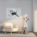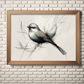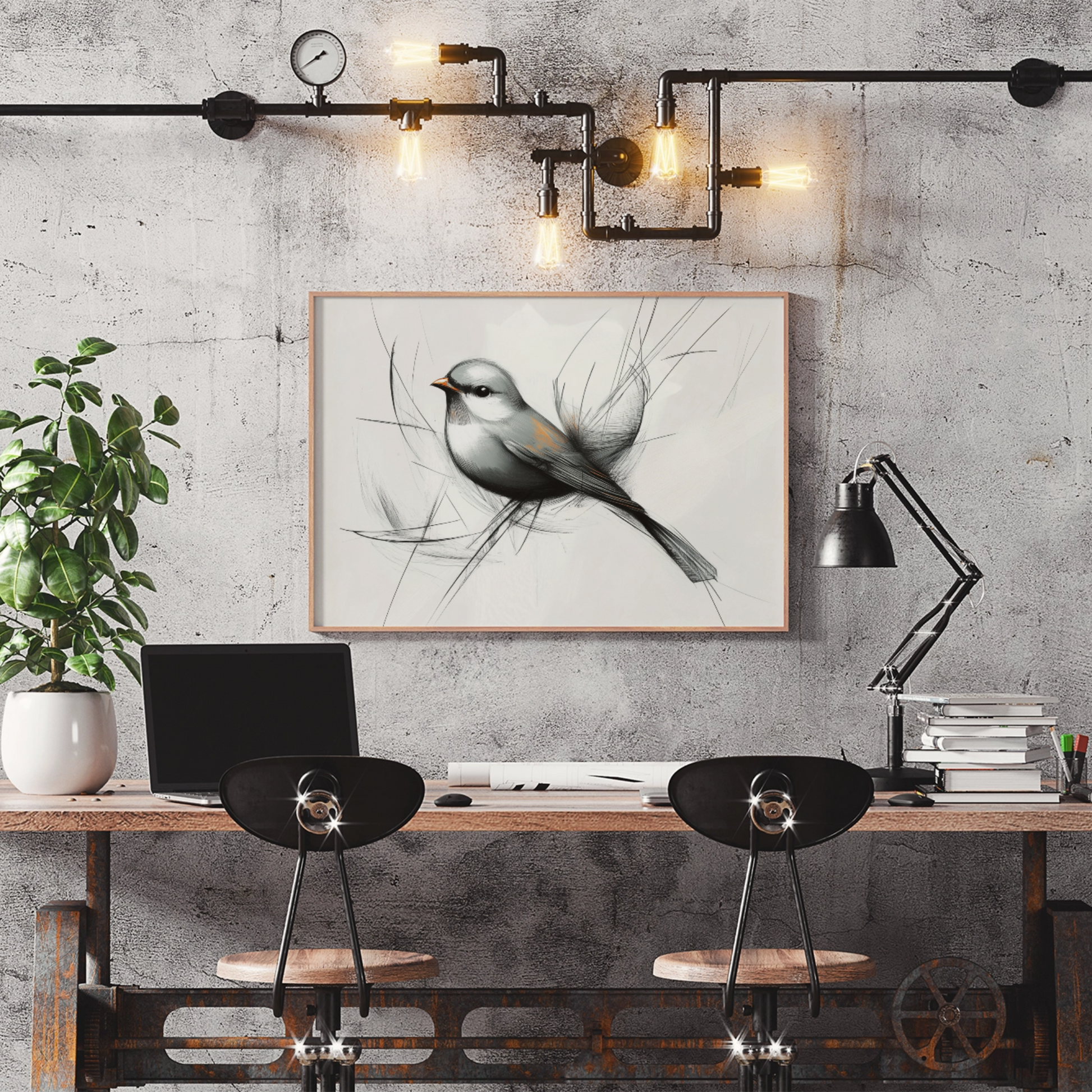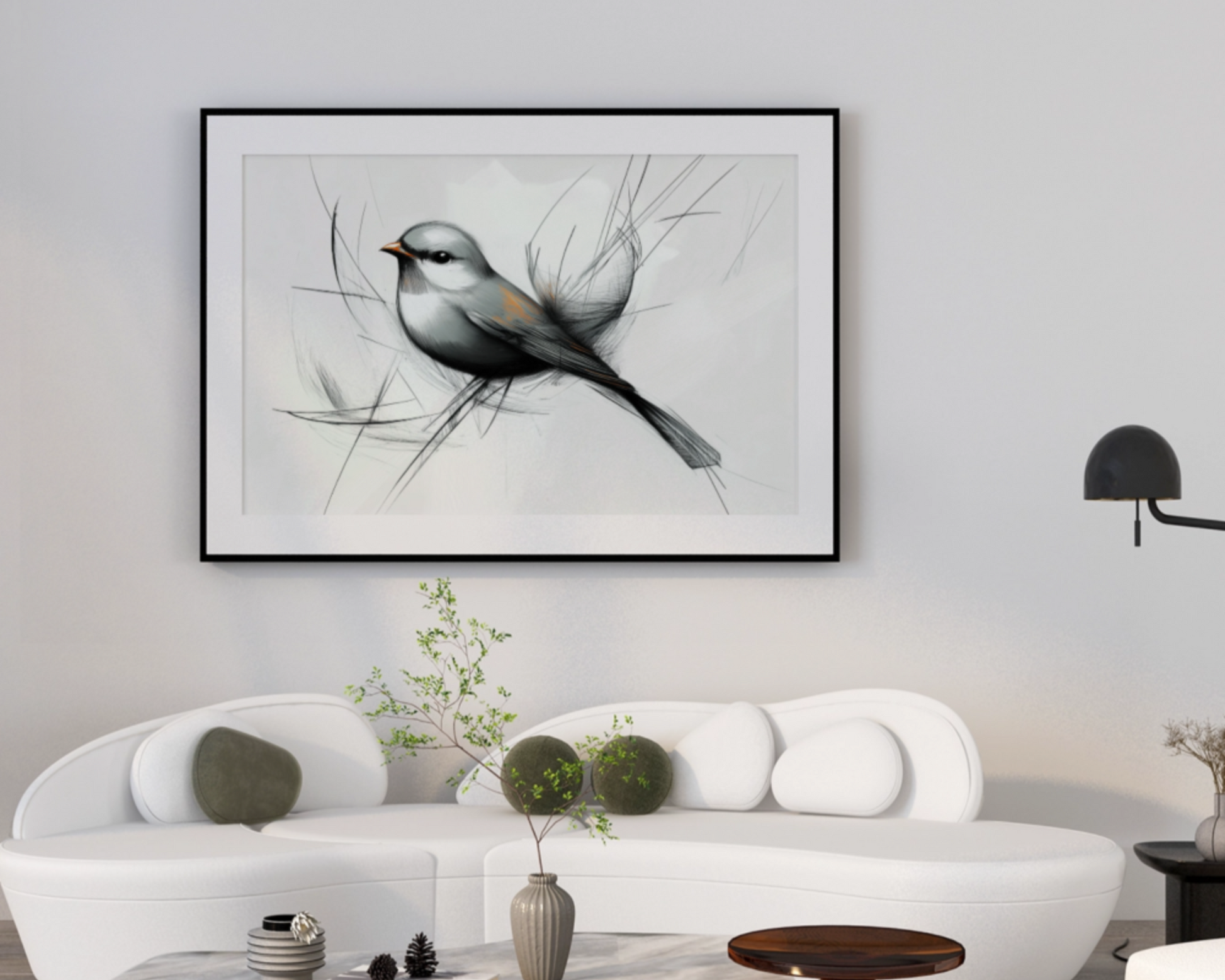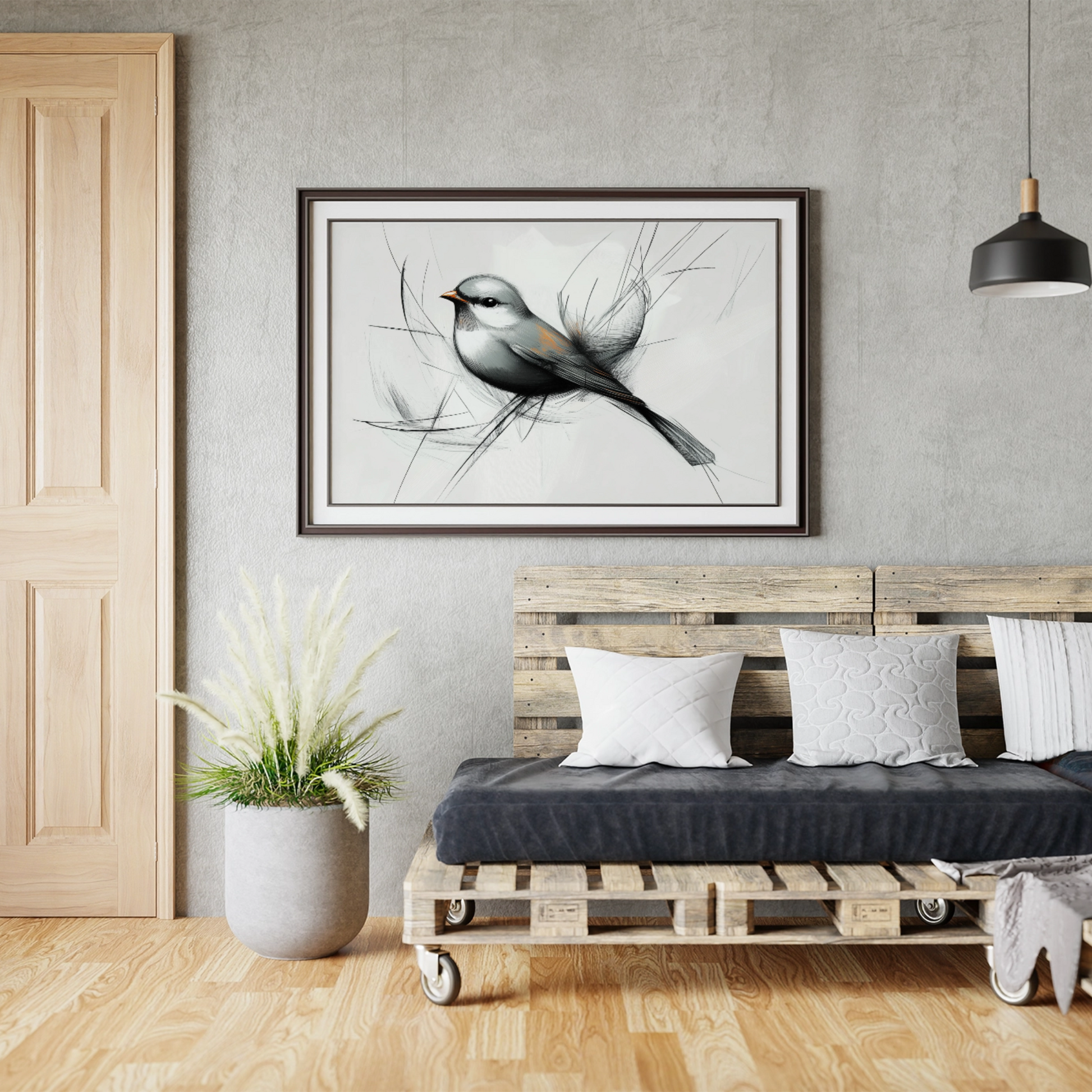Enhance your decor with our exquisite wall art featuring a small gray bird adorned with a striking red beak, perched gracefully on a branch. Set against a minimalist plain background, the artwork is complemented by abstract black lines that create a dynamic brushwork effect, adding depth and intrigue to the composition. This charming piece captures the essence of nature's beauty while incorporating modern artistic elements, making it perfect for bird enthusiasts and art lovers alike. Ideal for any room, this artwork brings a touch of elegance and whimsy to your home or office space.