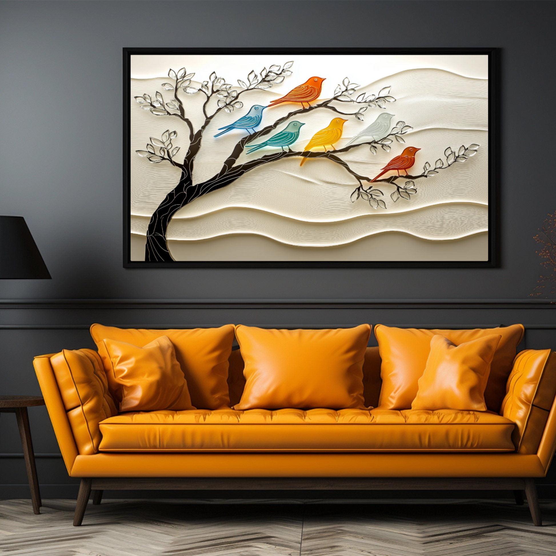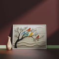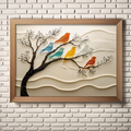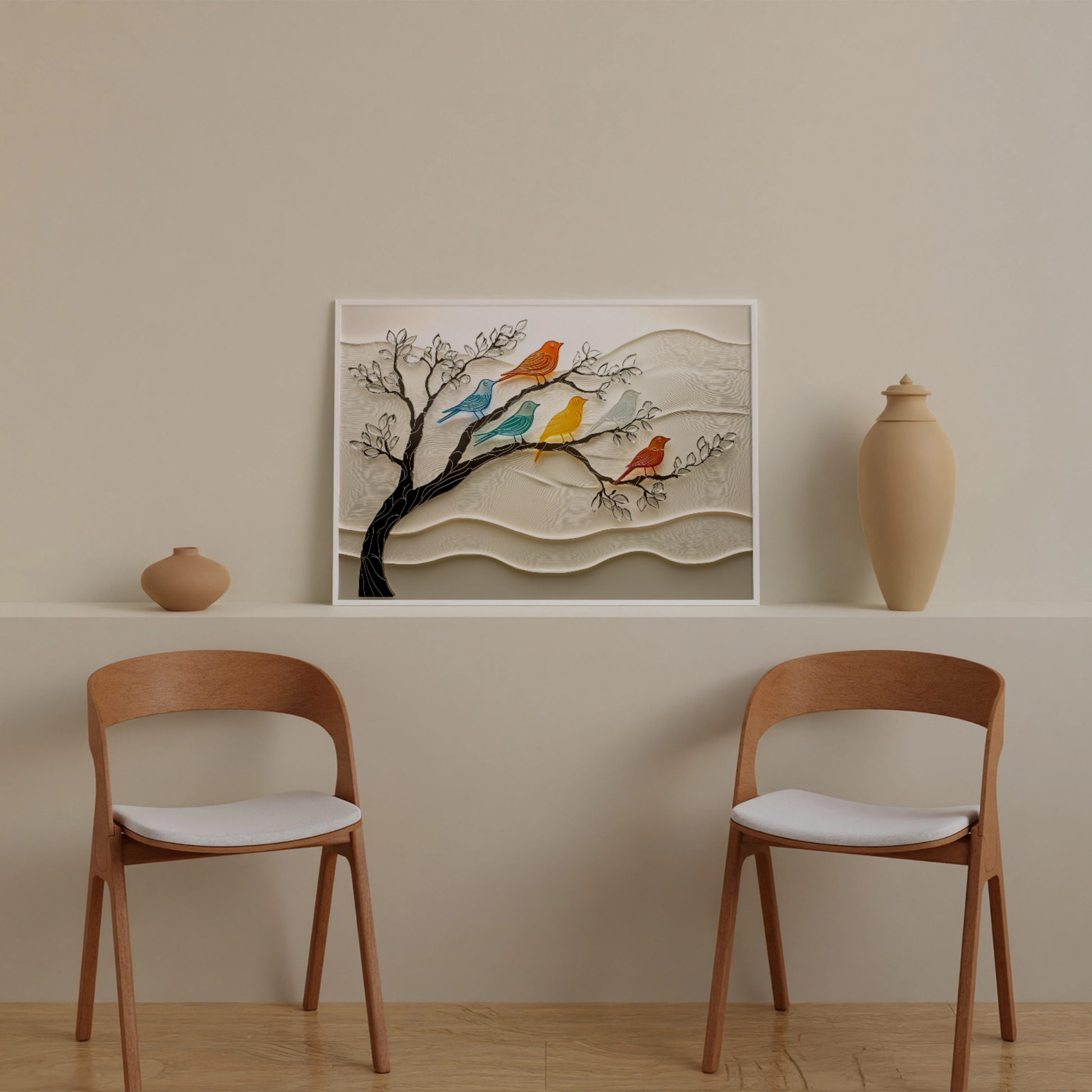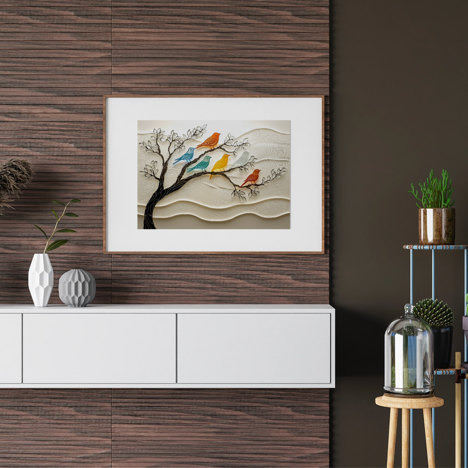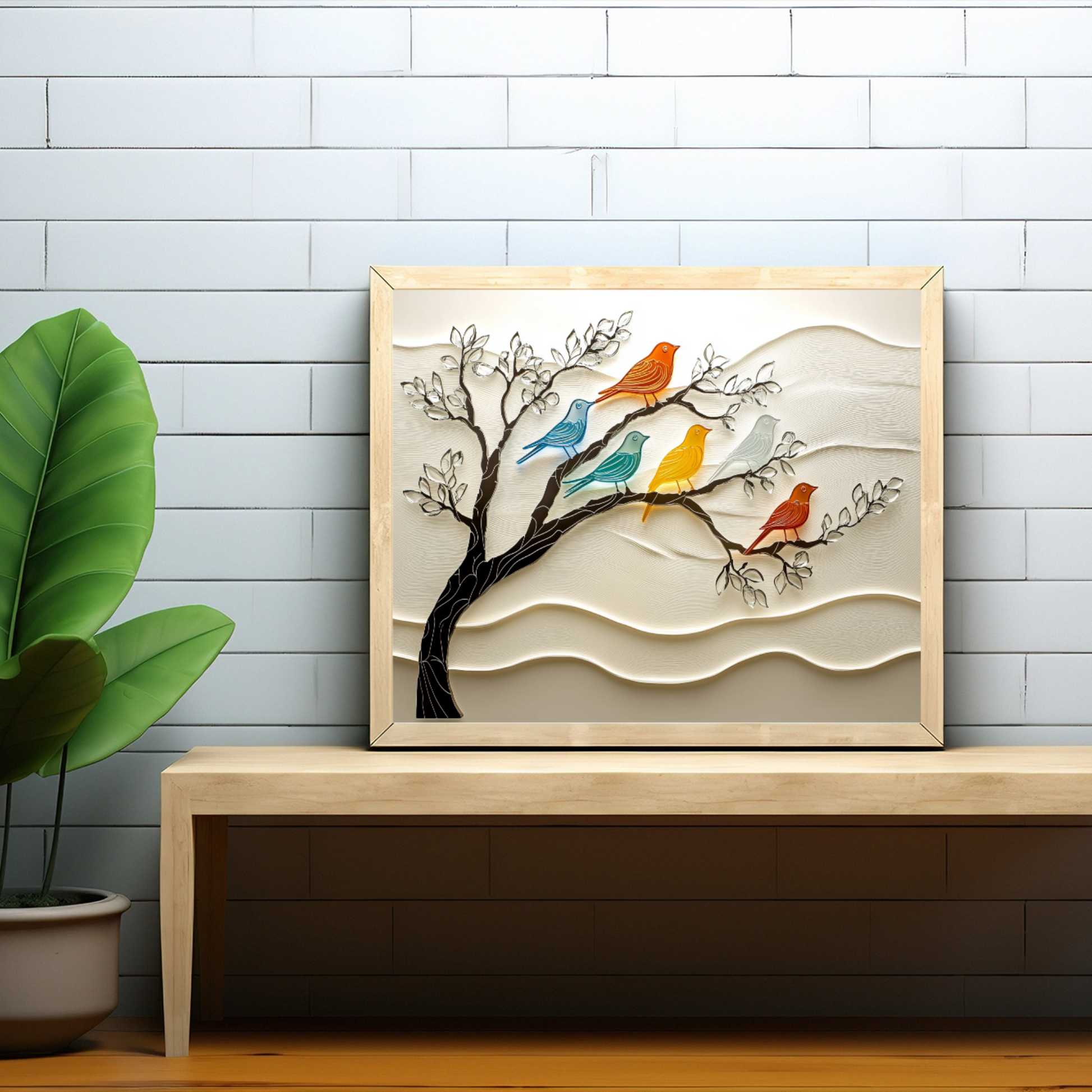 Enhance your decor with our stunning wall art featuring a uniquely crafted black metal tree limb. This artistic piece showcases a delightful row of tiny, multi-colored birds, each with long legs made of translucent sea glass, elegantly perched along the branch. The backdrop features a textured ivory line design, adding depth and sophistication to the overall composition. Perfect for nature lovers and art enthusiasts, this captivating artwork brings a whimsical touch to any room, making it an ideal focal point for your home or office space.