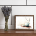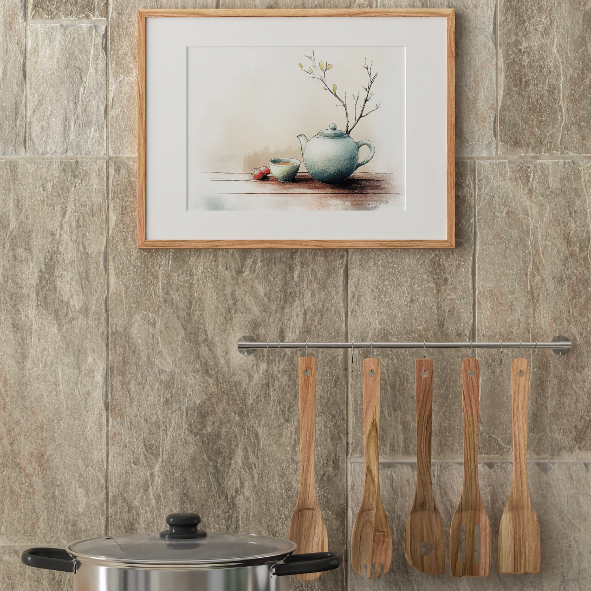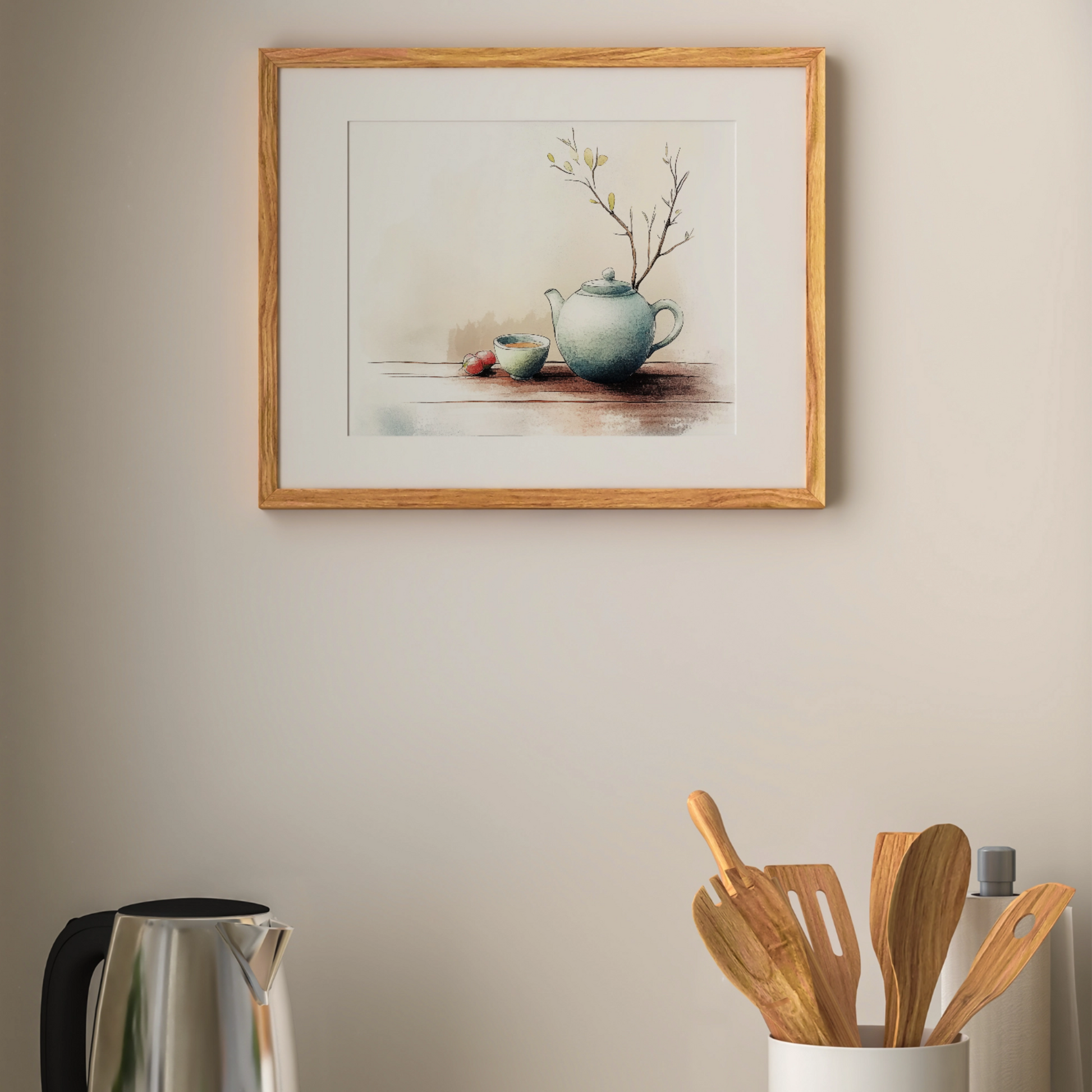 Immerse yourself in the tranquil beauty of our watercolor artwork depicting a serene tea ceremony. This charming piece features a green ceramic teapot alongside a delicate teacup, elegantly displayed on a wooden table. Set against a clean white background, the composition highlights the simplicity and grace of the tea-drinking ritual. Perfect for tea lovers and those who appreciate fine art, this painting adds a touch of sophistication to any space, making it an ideal accent for your kitchen, dining area, or office decor. Enjoy the calming essence of this delightful artwork in your home.