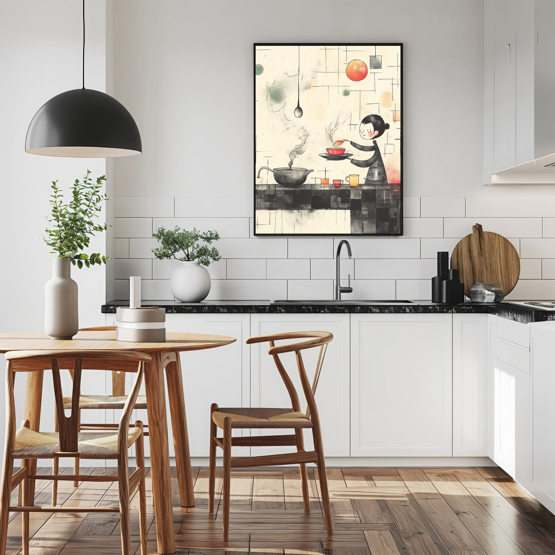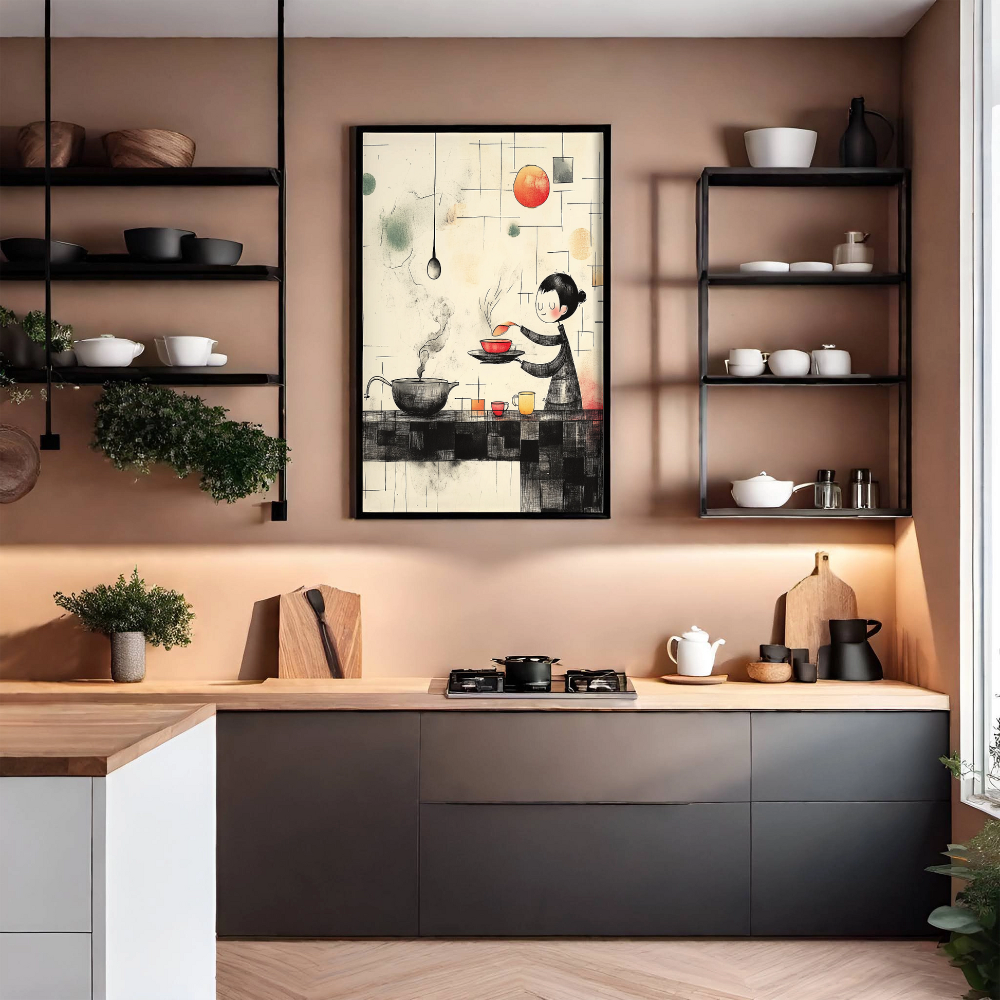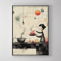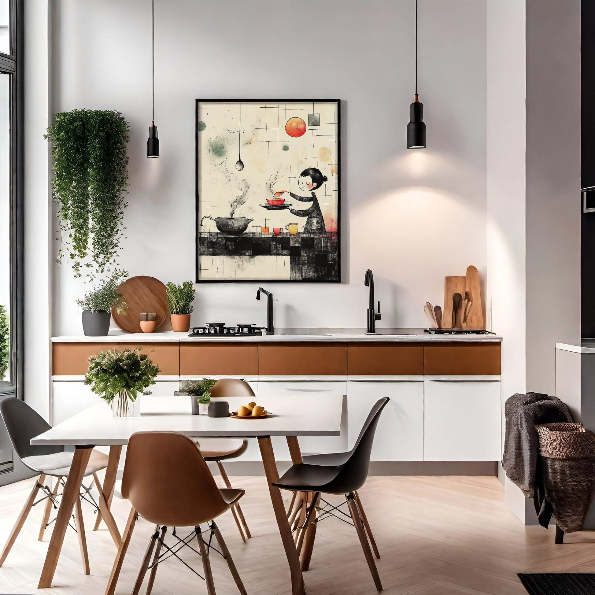 Bring a touch of modern nostalgia to your space with our vibrant wall art featuring a young girl with short black hair cooking in a stylish kitchen. This eye-catching piece combines cultural representation with retro flair, showcasing the chef against a backdrop of abstract geometric patterns. The dynamic composition captures the energy of culinary creation while the vintage-inspired elements add a unique aesthetic appeal. Perfect for food enthusiasts, art lovers, or anyone looking to add a pop of personality to their kitchen or dining area, this artwork celebrates diversity, creativity, and the joy of cooking in a visually striking manner.