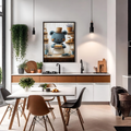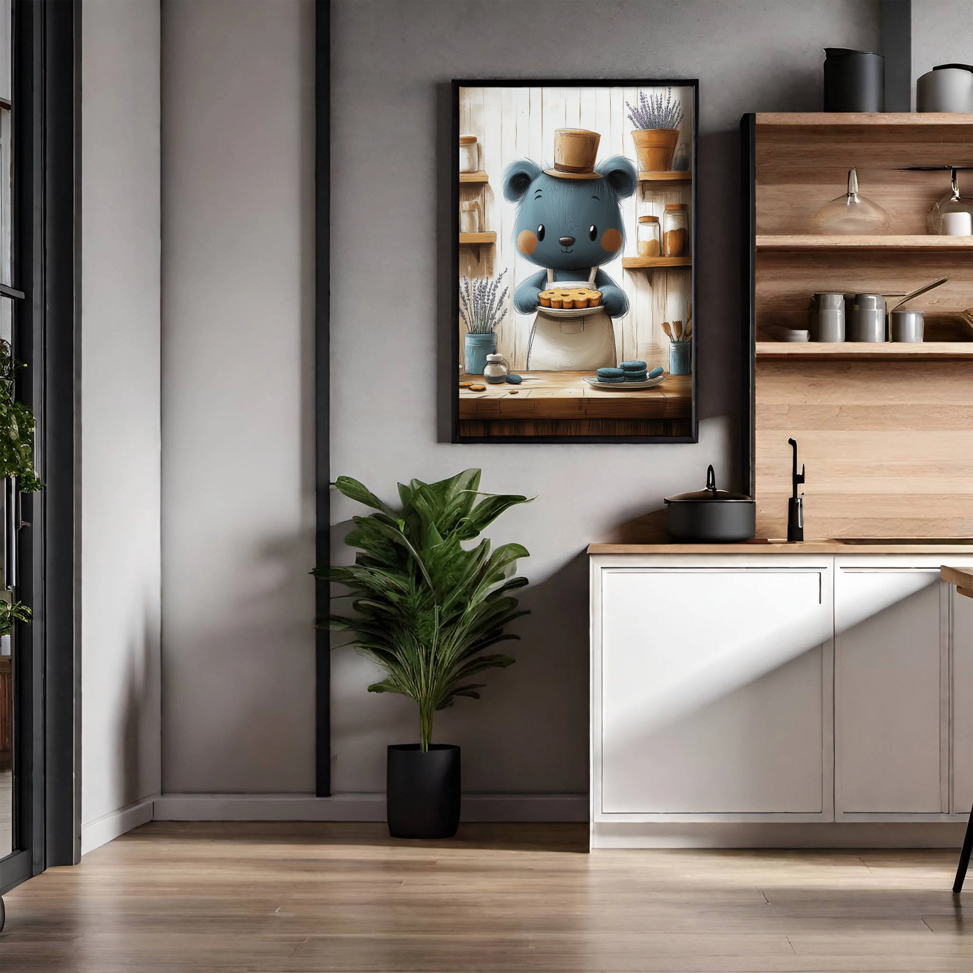 Bring warmth and charm to your space with our delightful wall art featuring an adorable blue bear-like character in a boho-inspired kitchen setting. Dressed in a charming apron and proudly holding a tray of freshly baked cookies, this whimsical character transforms your decor into a scene of culinary comfort. Surrounded by rustic wooden shelves and an array of vintage cooking utensils, the artwork captures the essence of homy, creative kitchen vibes. Perfect for food lovers, kitchen enthusiasts, and those who appreciate playful, bohemian-style illustrations, this piece adds a touch of sweetness and personality to any room.