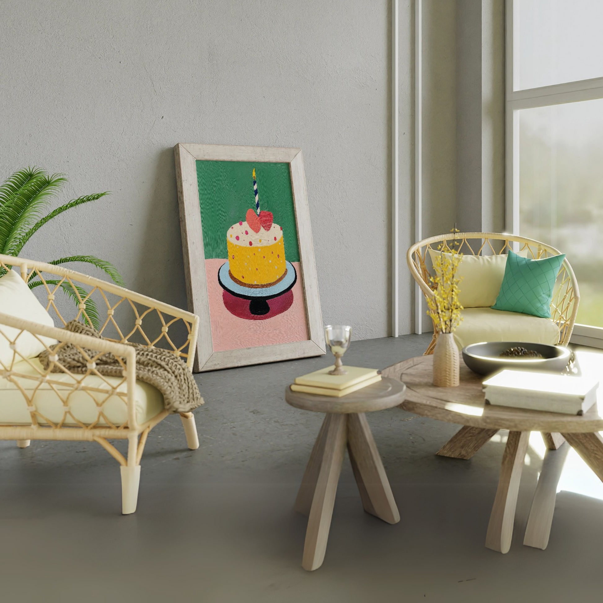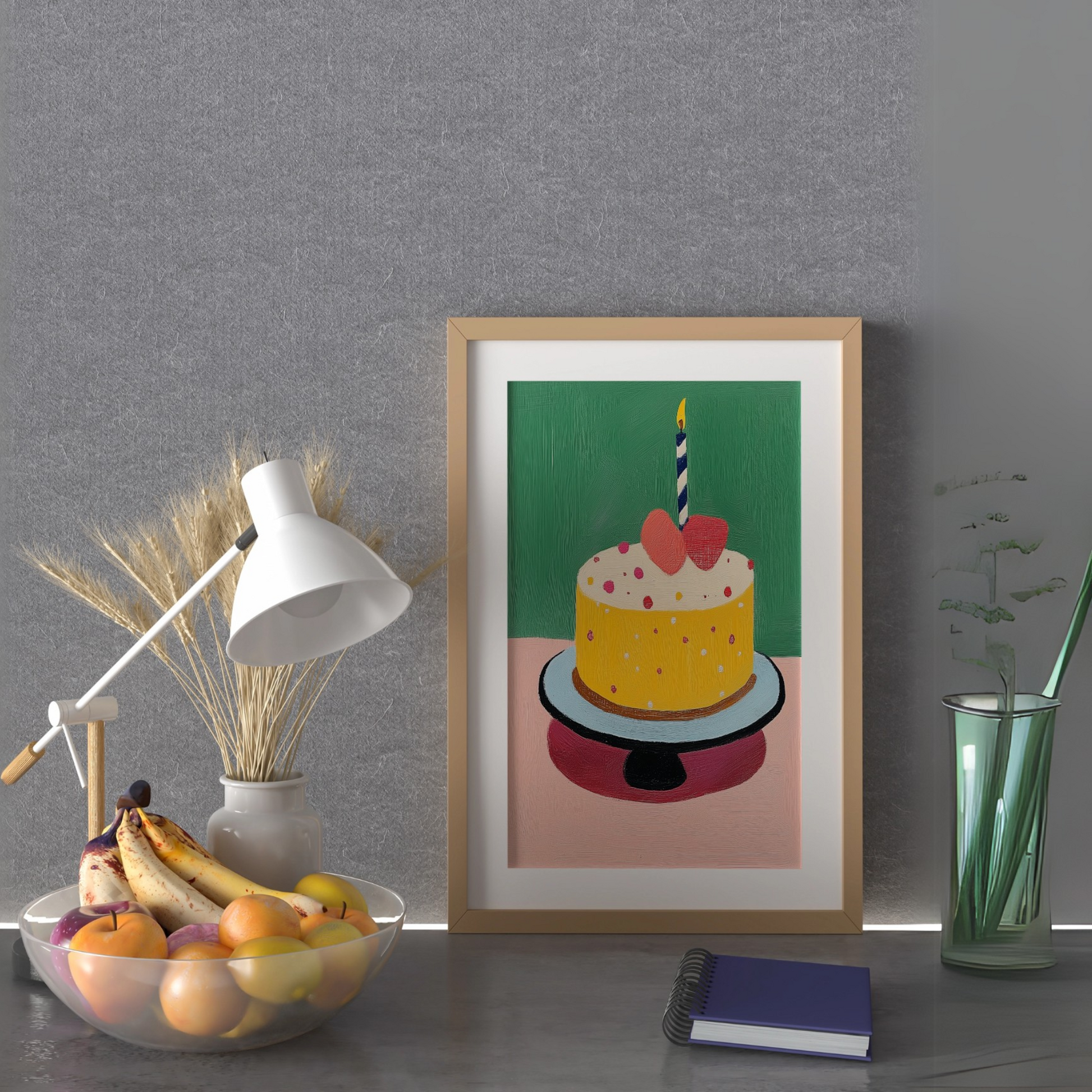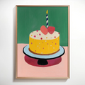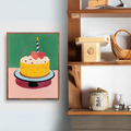 Celebrate joy and festivity with our charming wall art featuring a colorful birthday cake. This delightful piece showcases a beautifully decorated cake topped with a striking red heart, elegantly displayed on a sleek black cake stand. The vibrant colors pop against a refreshing green background, creating a lively and cheerful atmosphere. Perfect for adding a touch of whimsy to your kitchen, dining area, or party space, this artwork serves as an eye-catching focal point that embodies the spirit of celebration and love. Ideal for birthdays or any festive occasion, this piece brings warmth and happiness to your decor.
