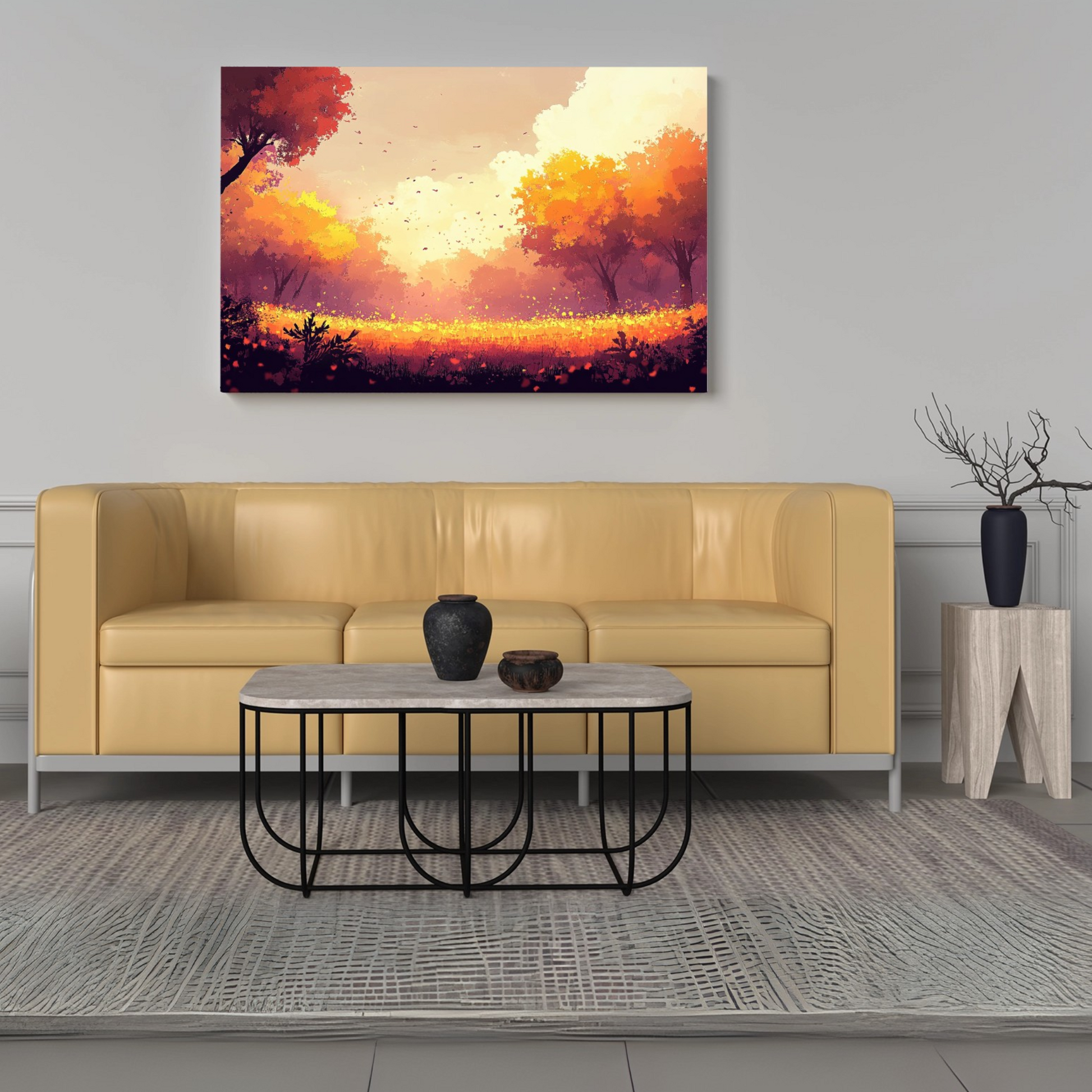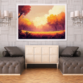 Transform your space with our breathtaking wall art capturing the essence of a stunning autumn evening. This captivating piece showcases a vibrant landscape where a rich, colorful sunset sky illuminates silhouetted trees, creating a dramatic and mesmerizing scene. The foreground features a lush grassy field that adds depth and texture to the composition, inviting viewers to immerse themselves in the beauty of the season. Perfect for nature lovers and those who appreciate landscape art, this artwork serves as a stunning focal point that brings the warmth and magic of autumn into any room, evoking feelings of tranquility and natural wonder.