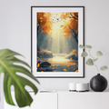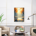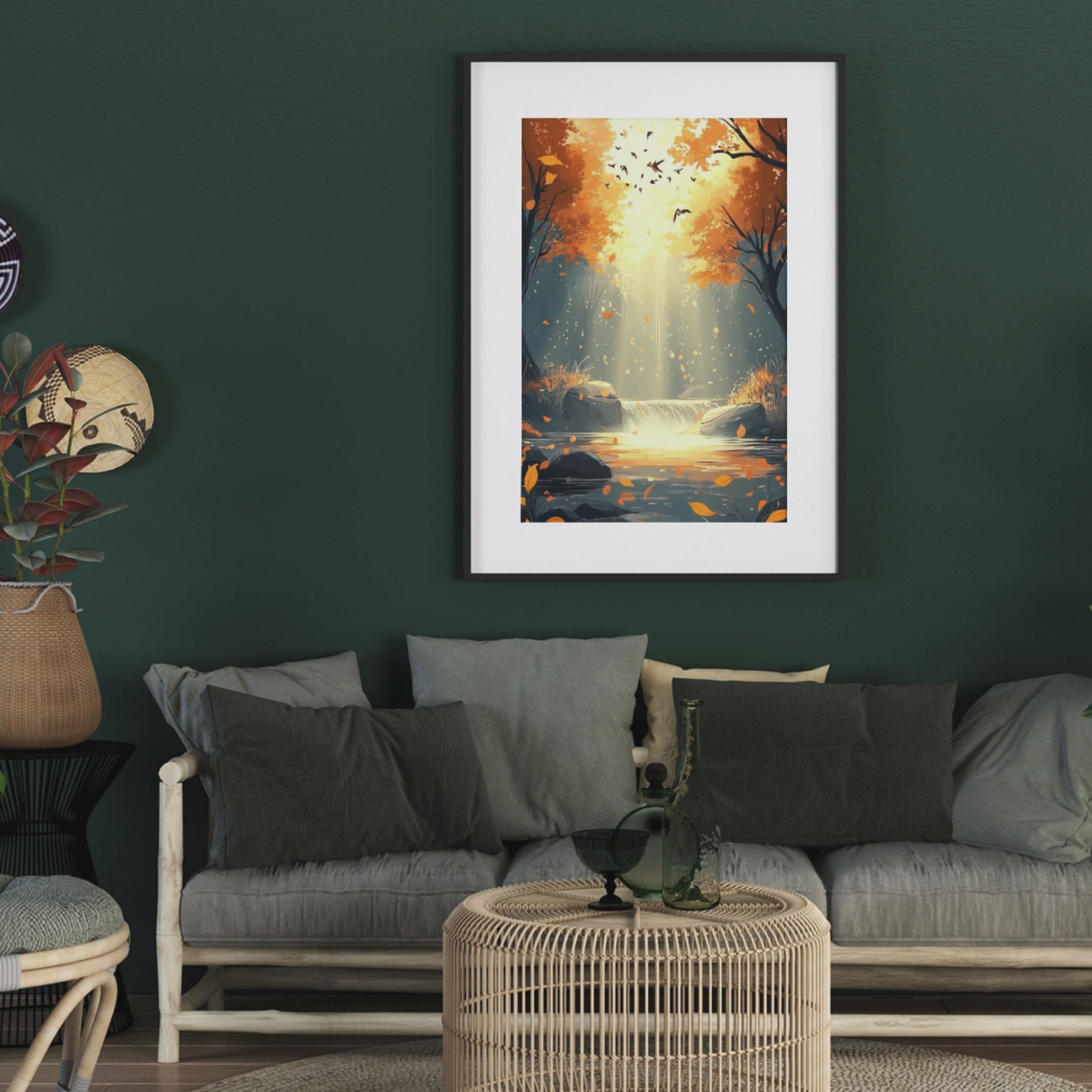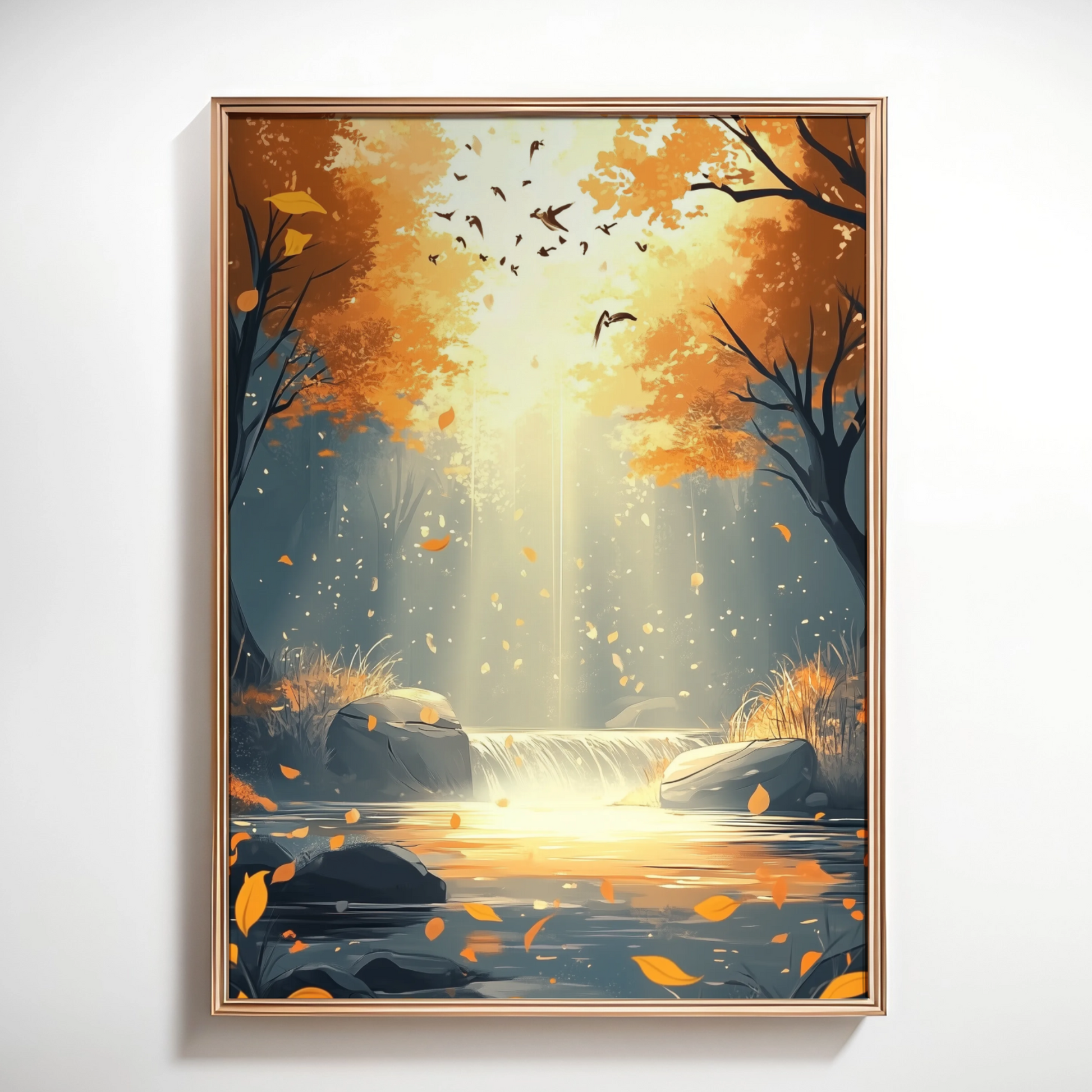Elevate your space with our breathtaking wall art capturing the essence of a serene autumn forest landscape. This stunning piece features a majestic waterfall cascading through a vibrant scene of orange and yellow foliage, creating a warm and inviting atmosphere. Graceful birds soar through the sky, adding movement and life to the composition. Perfect for nature lovers and those seeking a touch of tranquility, this artwork brings the magic of autumn into your home or office. Its rich colors and dynamic scenery make it an ideal focal point that evokes the peaceful beauty of a forest in fall.
