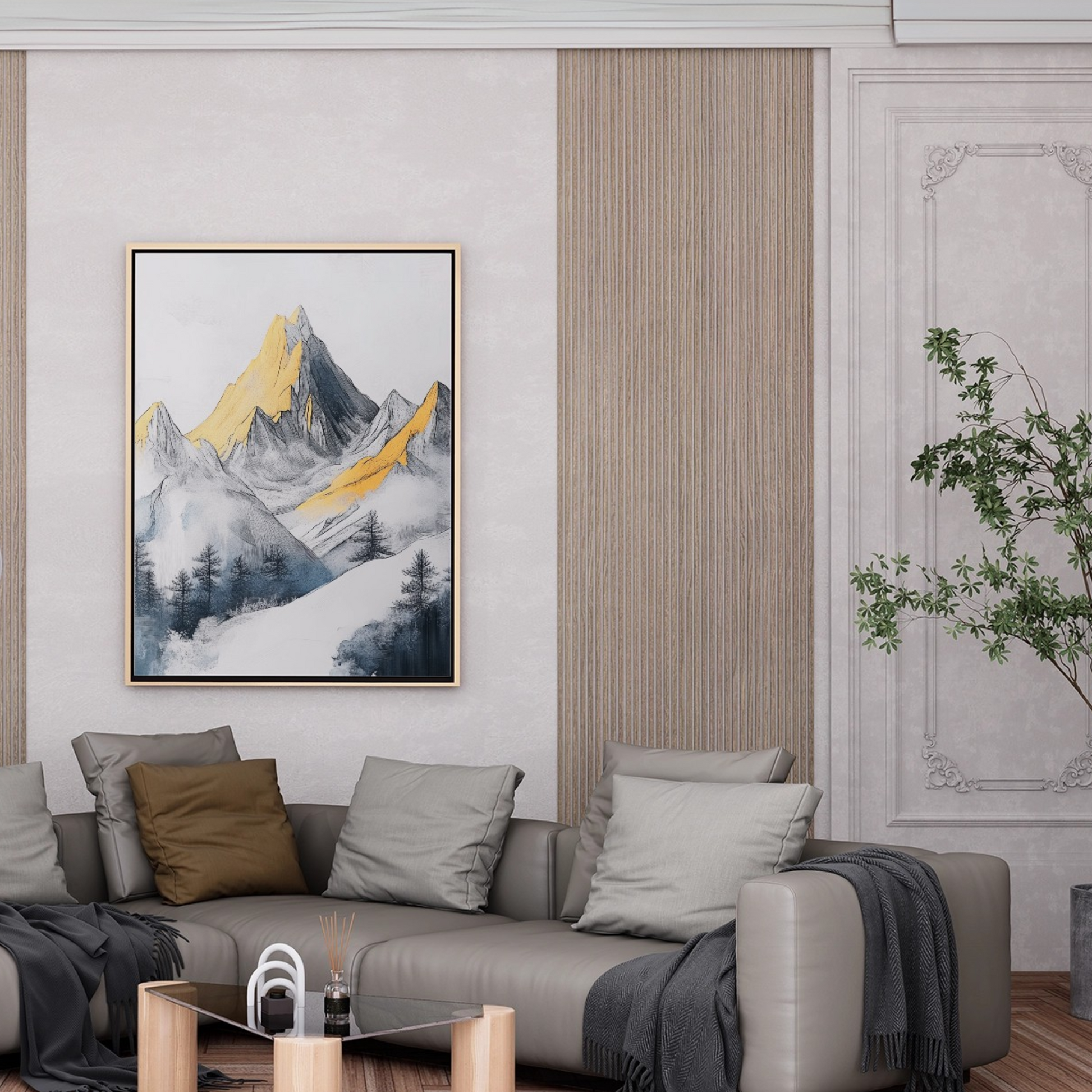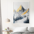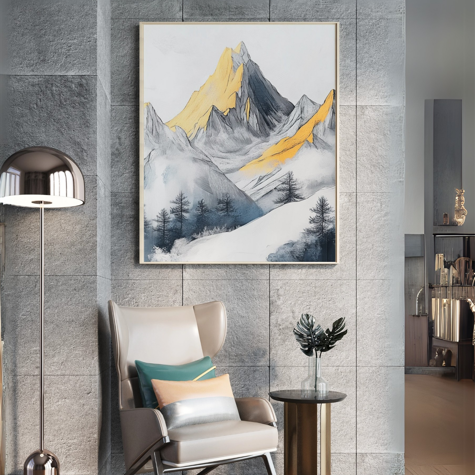 Bring the awe-inspiring beauty of a majestic mountain range into your space with our stunning wall art. This captivating piece showcases jagged, snow-capped peaks dramatically rising against a cloudy sky, their rugged silhouettes softened by the warm glow of sunlight. The foreground features a serene forest of pine trees, adding depth and contrast to the scene. Perfect for nature enthusiasts and adventure lovers, this artwork captures the essence of alpine grandeur, creating a focal point that transports you to the heart of the wilderness. Elevate your home or office decor with this breathtaking mountain landscape, inviting a sense of tranquility and wonder into any room.