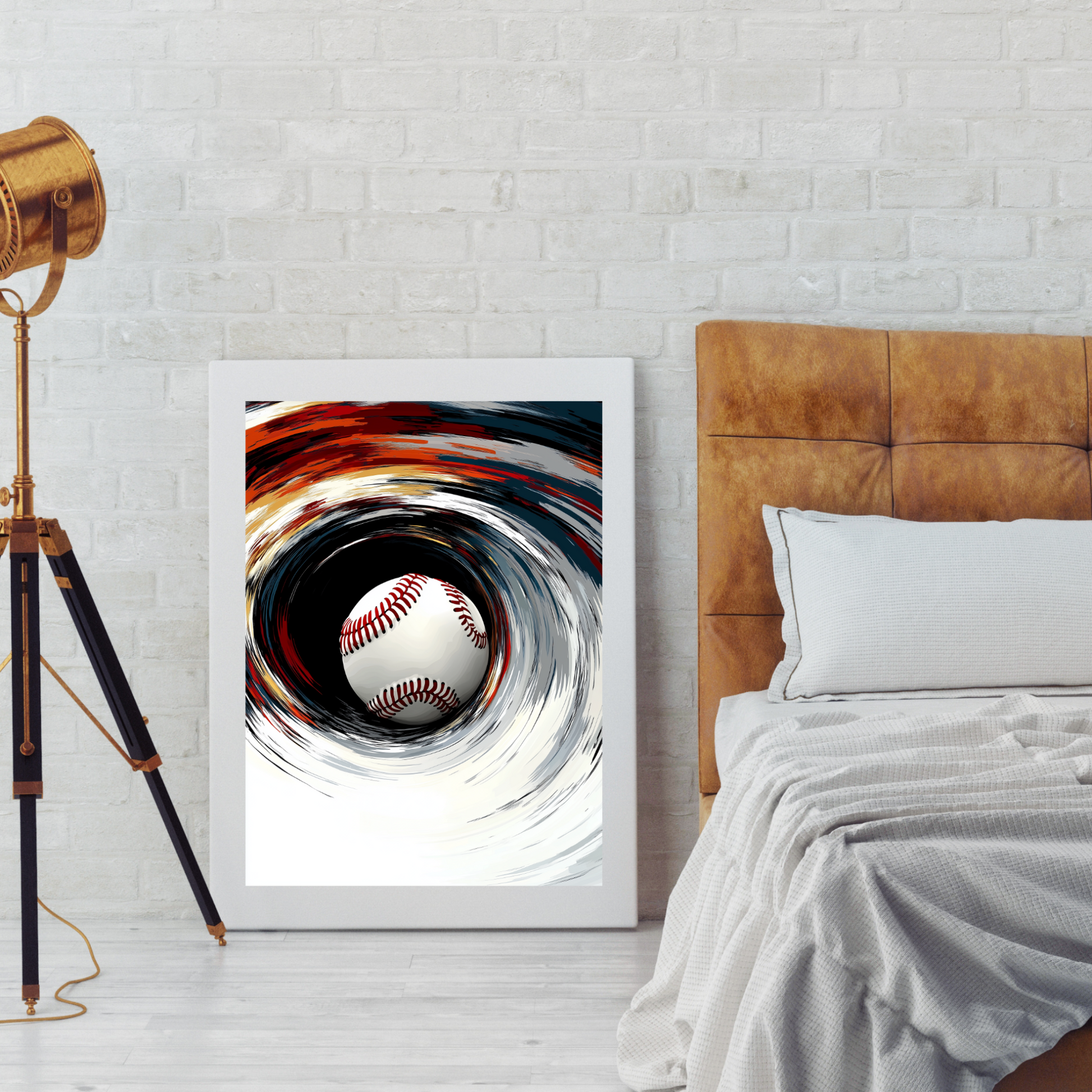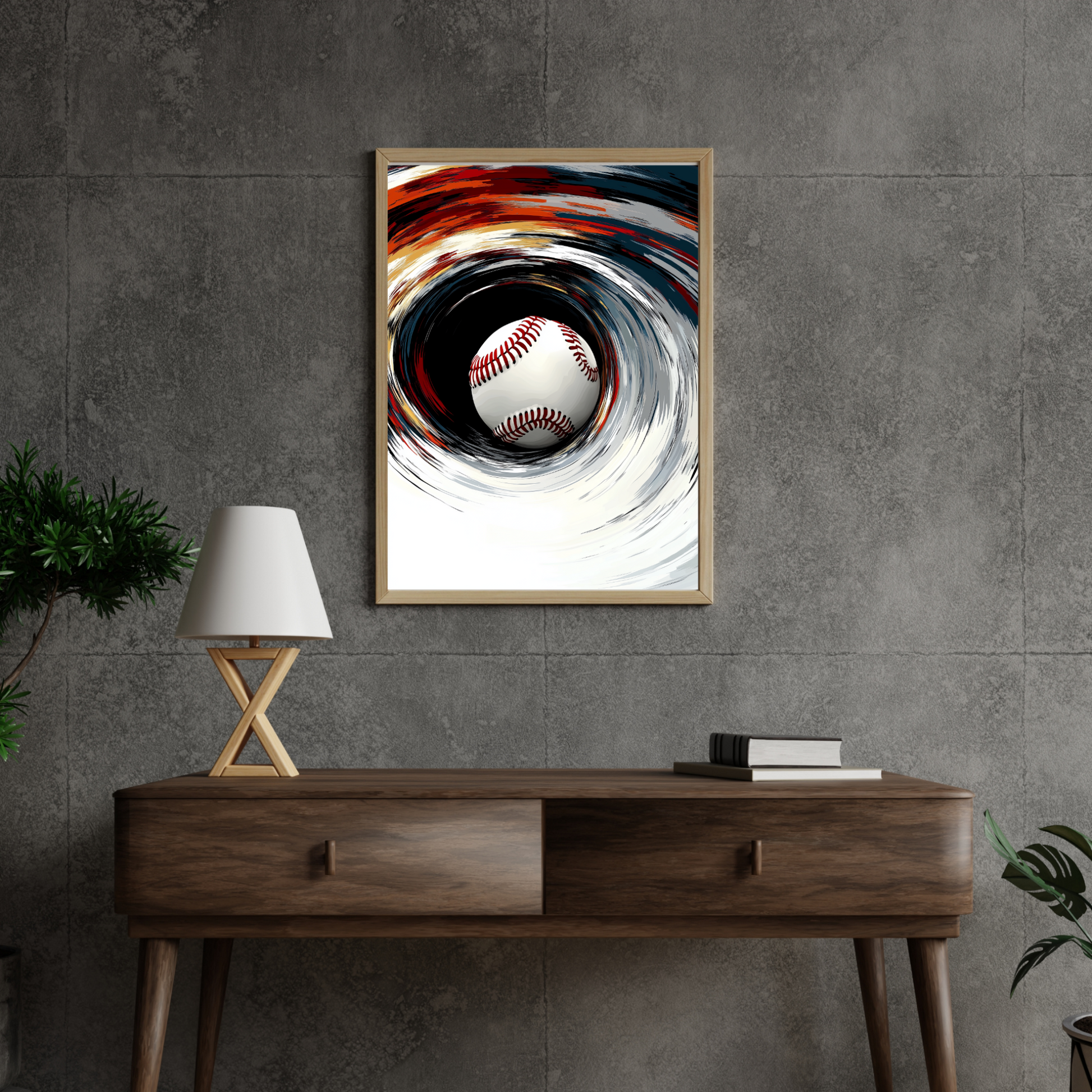 Elevate your space with our electrifying wall art featuring a high-intensity baseball design. This dynamic vector-style piece captures the raw power of a pitch, showcasing an aggressive baseball curving from the right into the center of the image. A striking grey and white vapor trail emphasizes the ball's incredible speed, while bold lines and a monochromatic color scheme create an intense, energetic atmosphere. Perfect for sports enthusiasts and those who appreciate modern, high-impact design, this artwork brings the excitement of America's favorite pastime to your walls, making it an ideal focal point for any room, from man caves to office spaces.