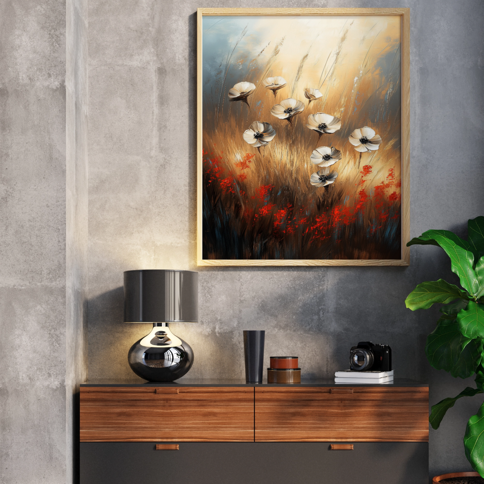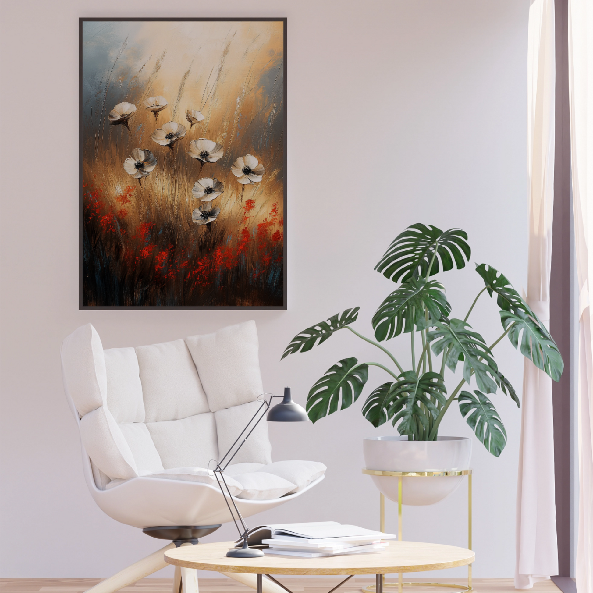 Blooming Contrast: White and Red Flowers in Warm-Toned Brushstroke Field. High Resolution Digital Download 300 DPI
