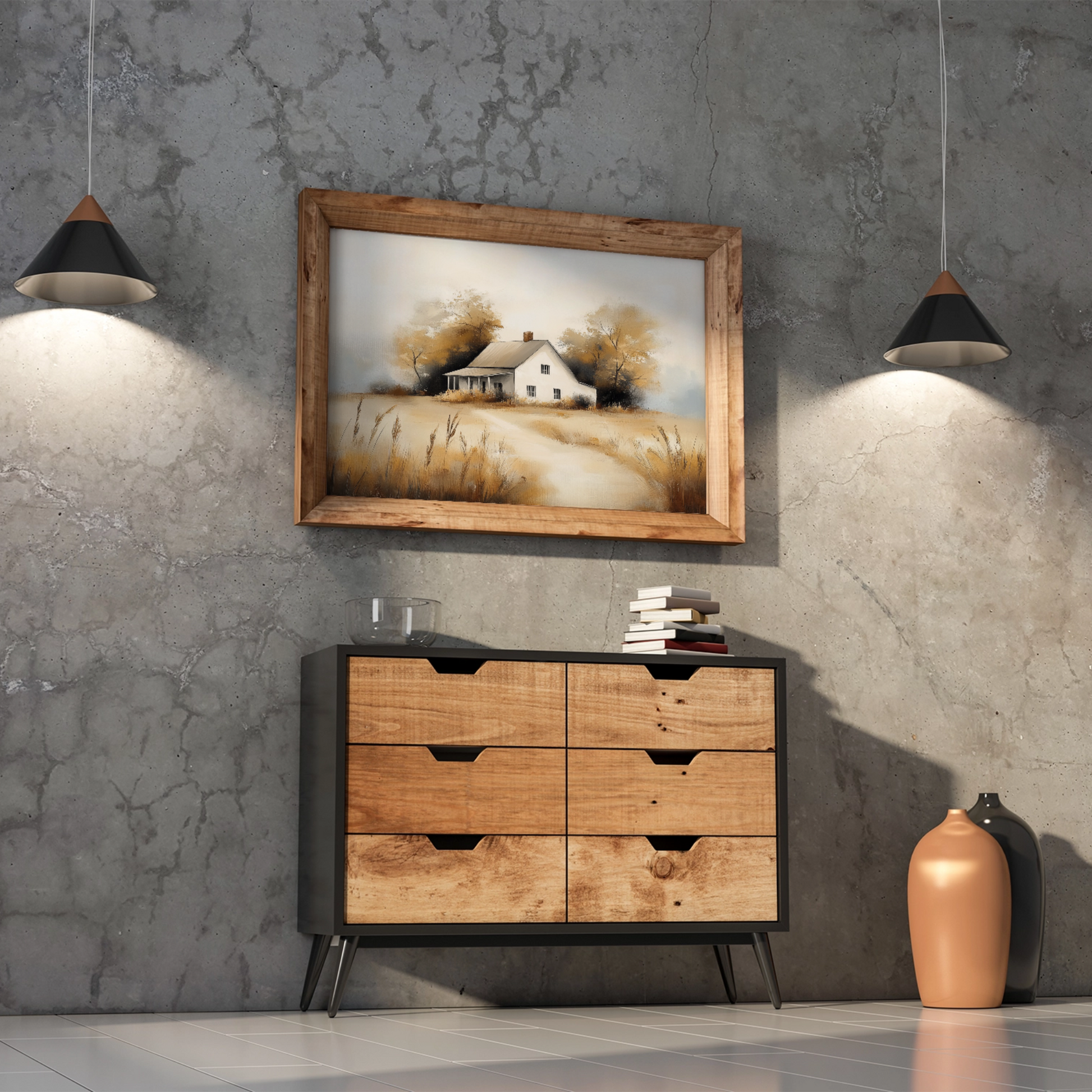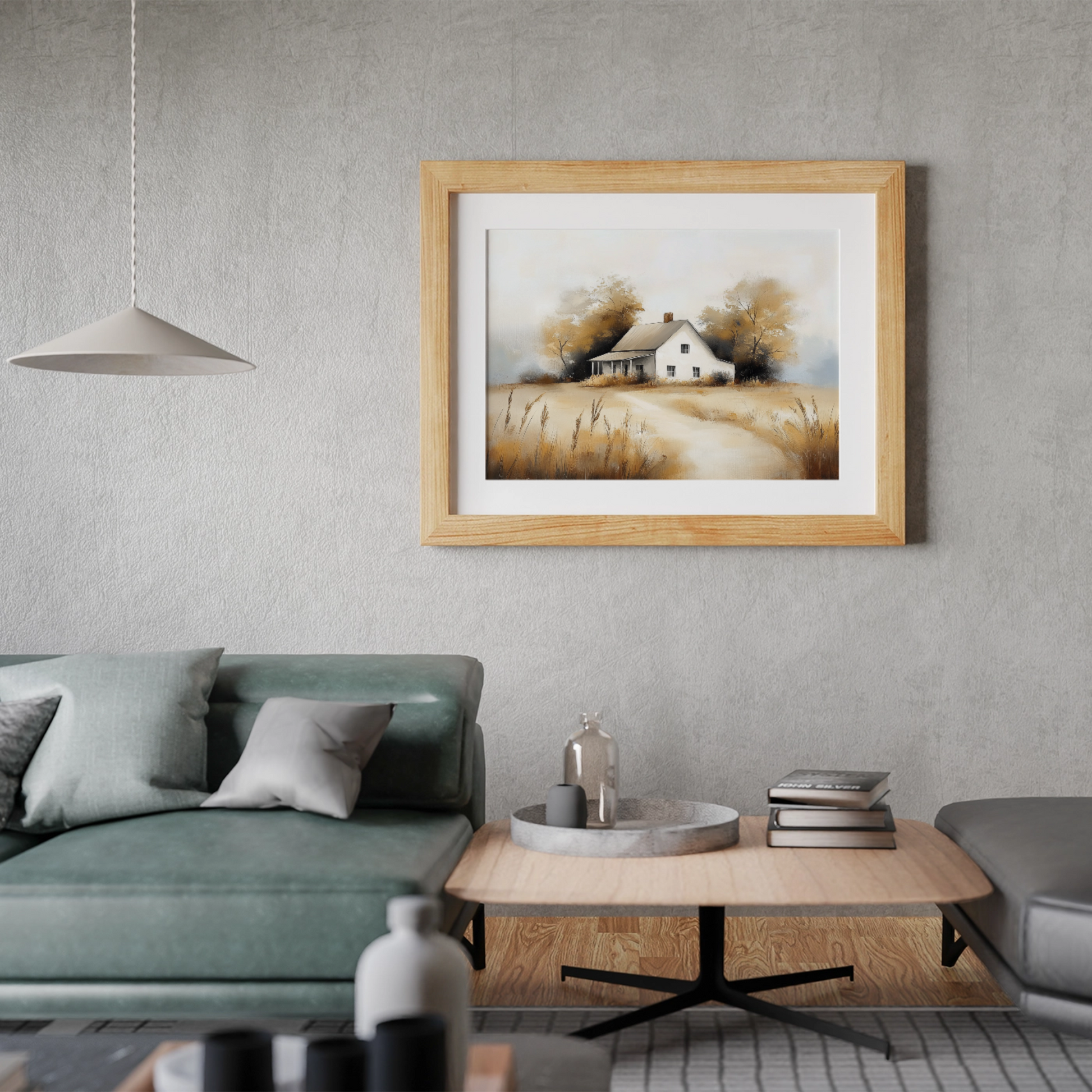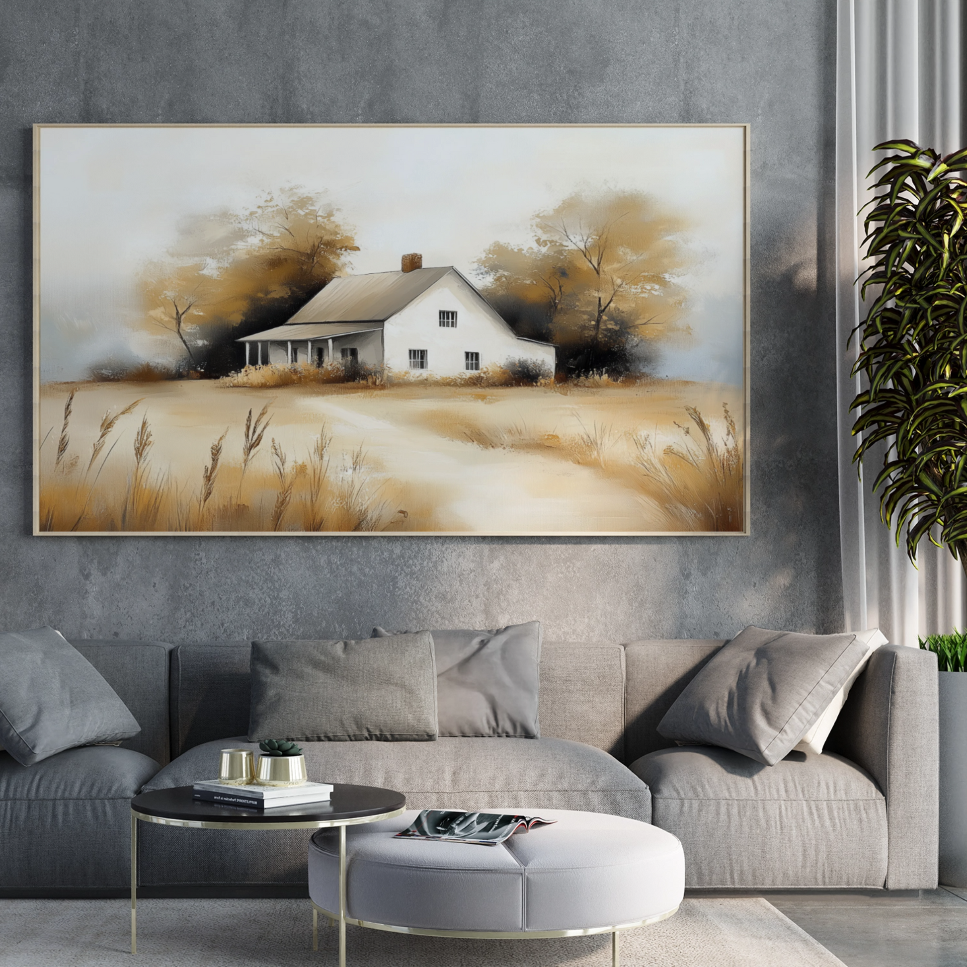 Bring the serene beauty of rural autumn into your space with our minimalist oil painting. This captivating artwork features an old white farmhouse nestled in a picturesque countryside setting. The scene is elegantly simplified, showcasing the essence of fall with warm-hued trees and a field of tall grass in the foreground. Perfect for those who appreciate rustic charm and minimalist design, this piece adds a touch of pastoral tranquility to any room, making it an ideal focal point for your home or office decor.