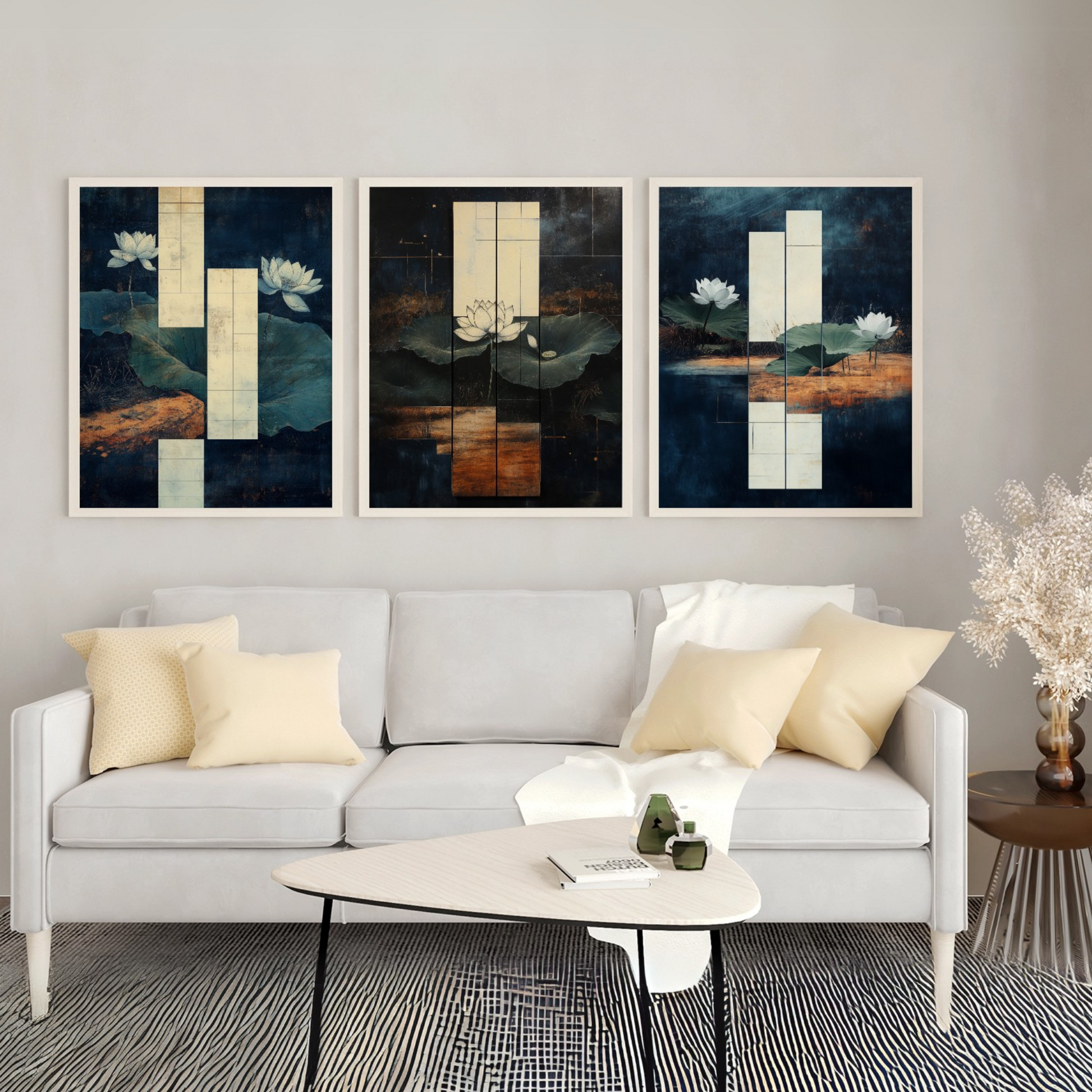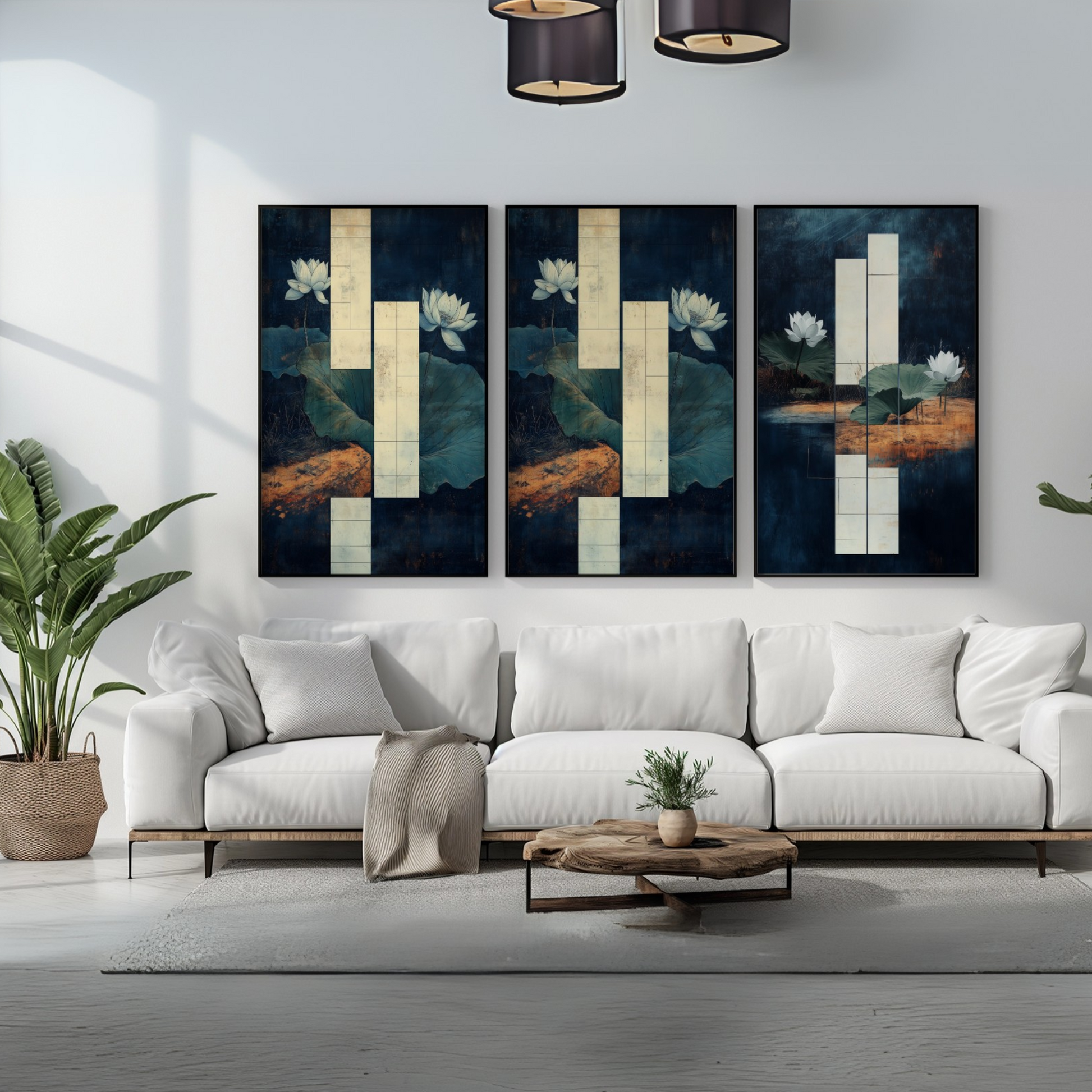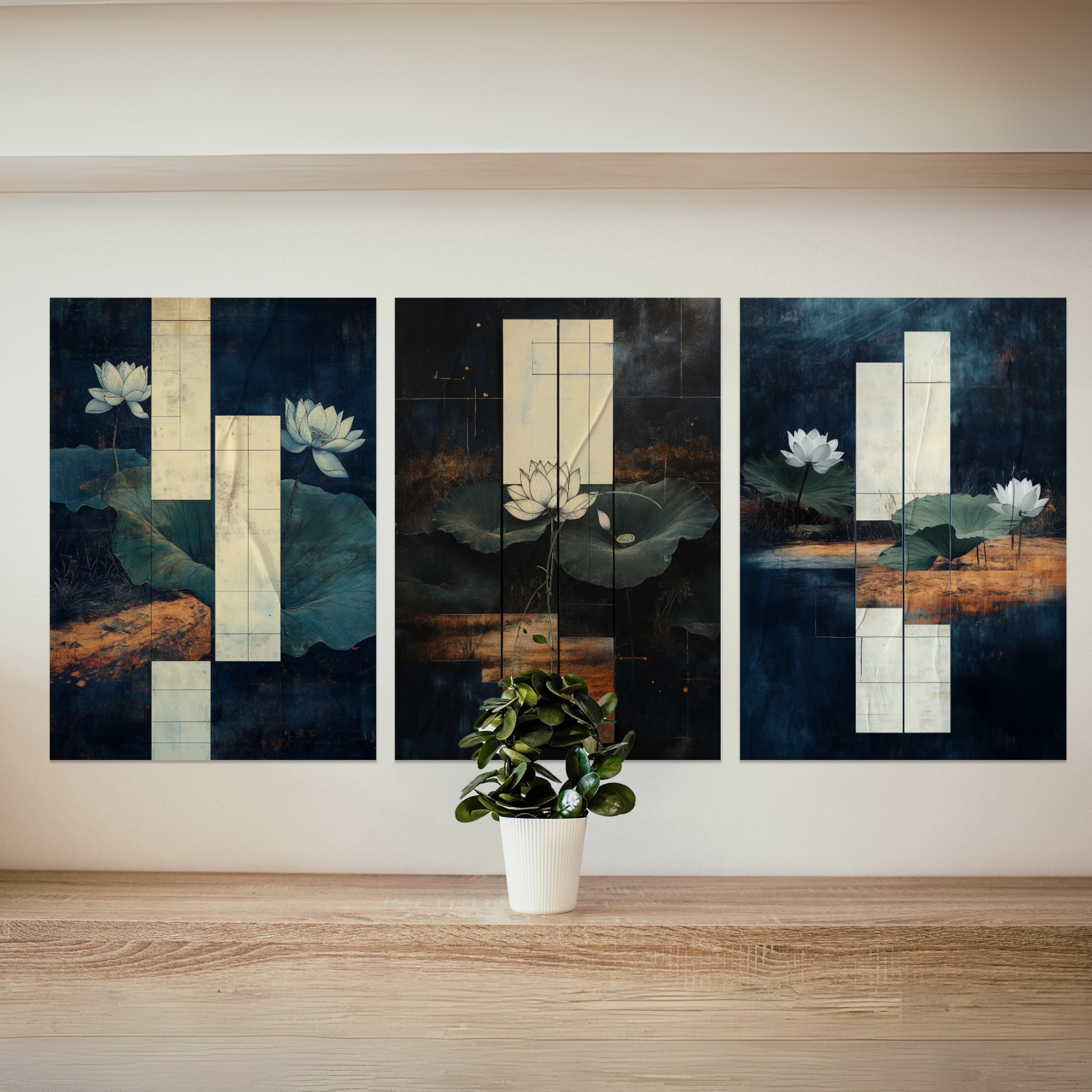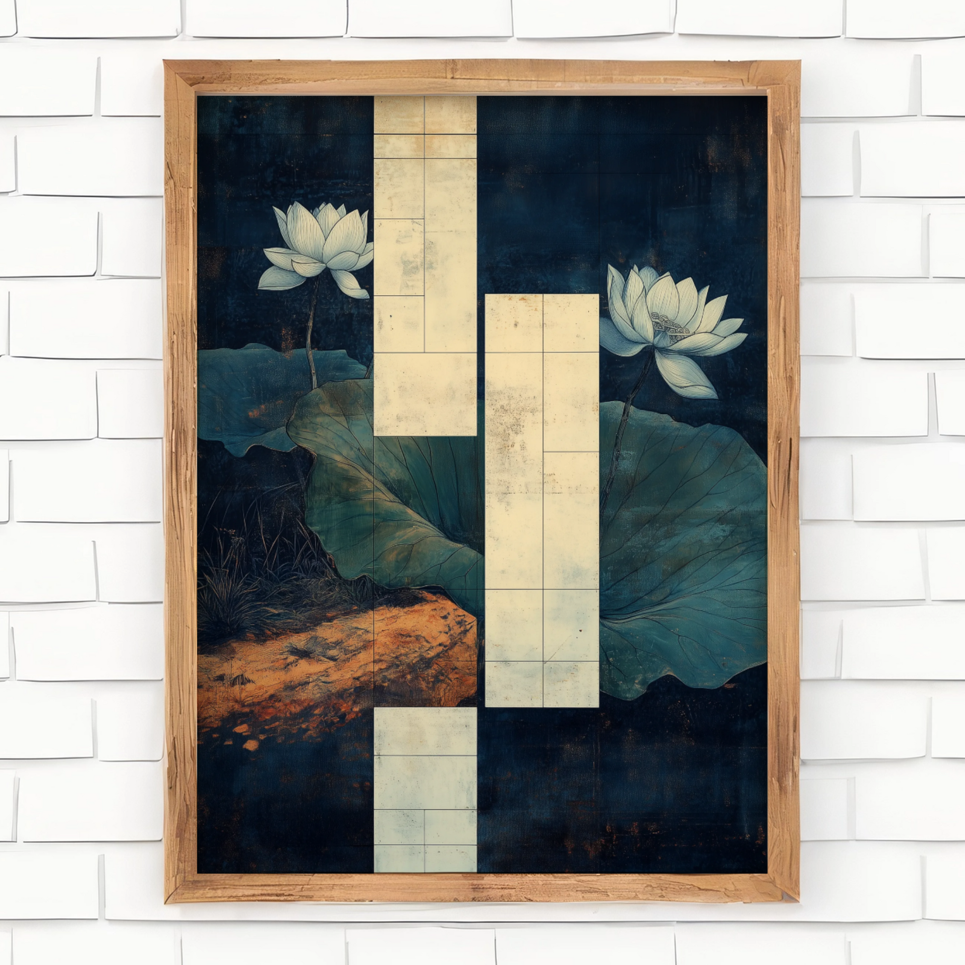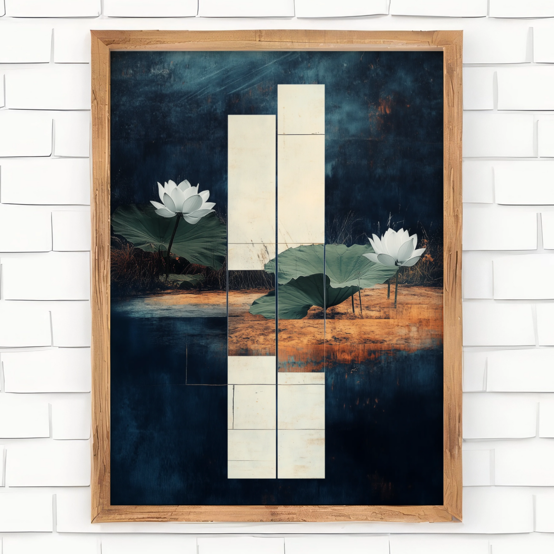 Transform your space with our exquisite wall art featuring a graceful white lotus flower. This elegant painting captures the serene beauty of a pristine lotus blossom floating on a tranquil dark pond, surrounded by lush green lily pads. The striking contrast between the luminous white petals and the deep, mysterious waters creates a captivating focal point that embodies peace and purity. Perfect for those seeking to bring a touch of zen-like tranquility to their home or office, this artwork serves as a stunning centerpiece that evokes the calm and beauty of nature's water gardens.