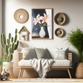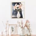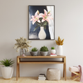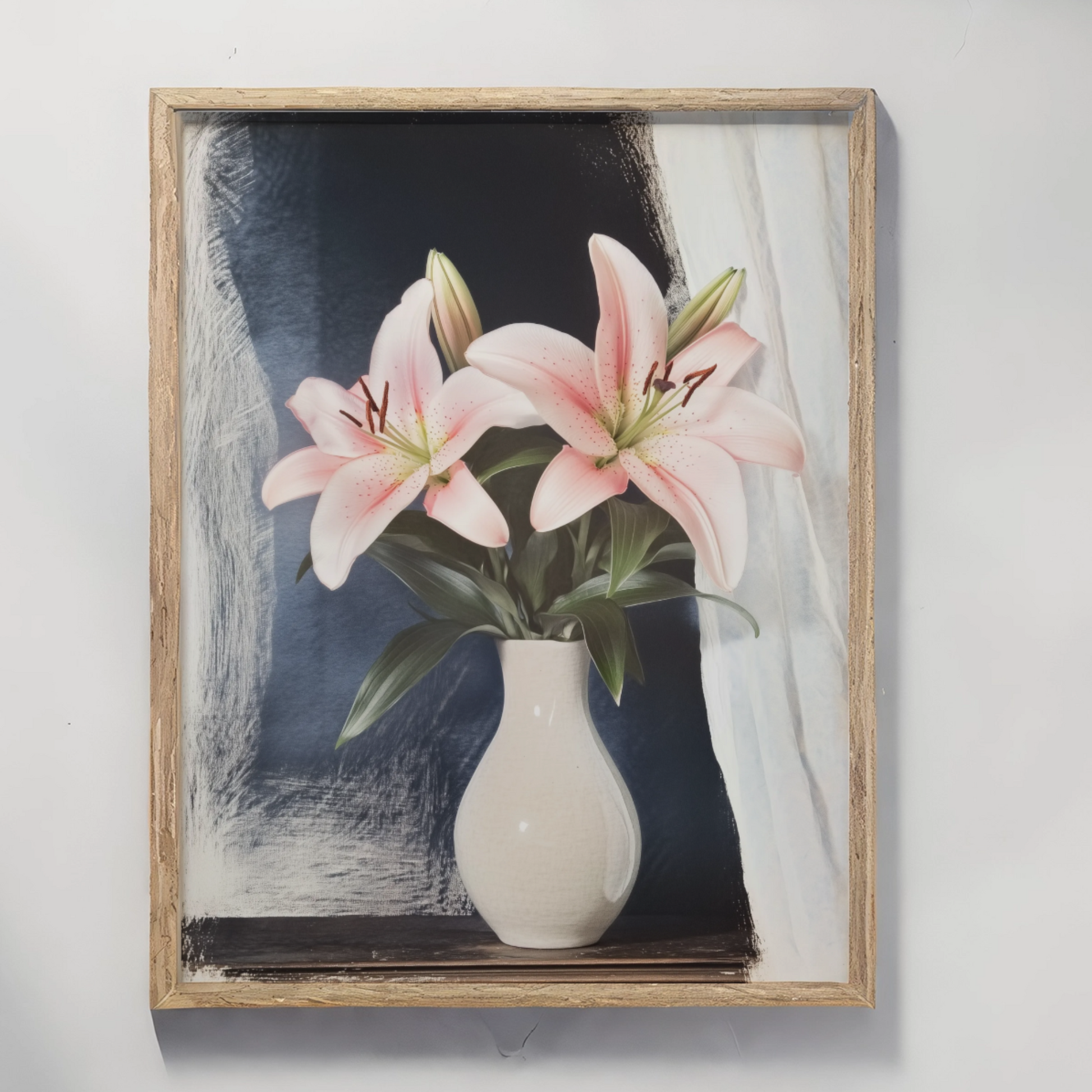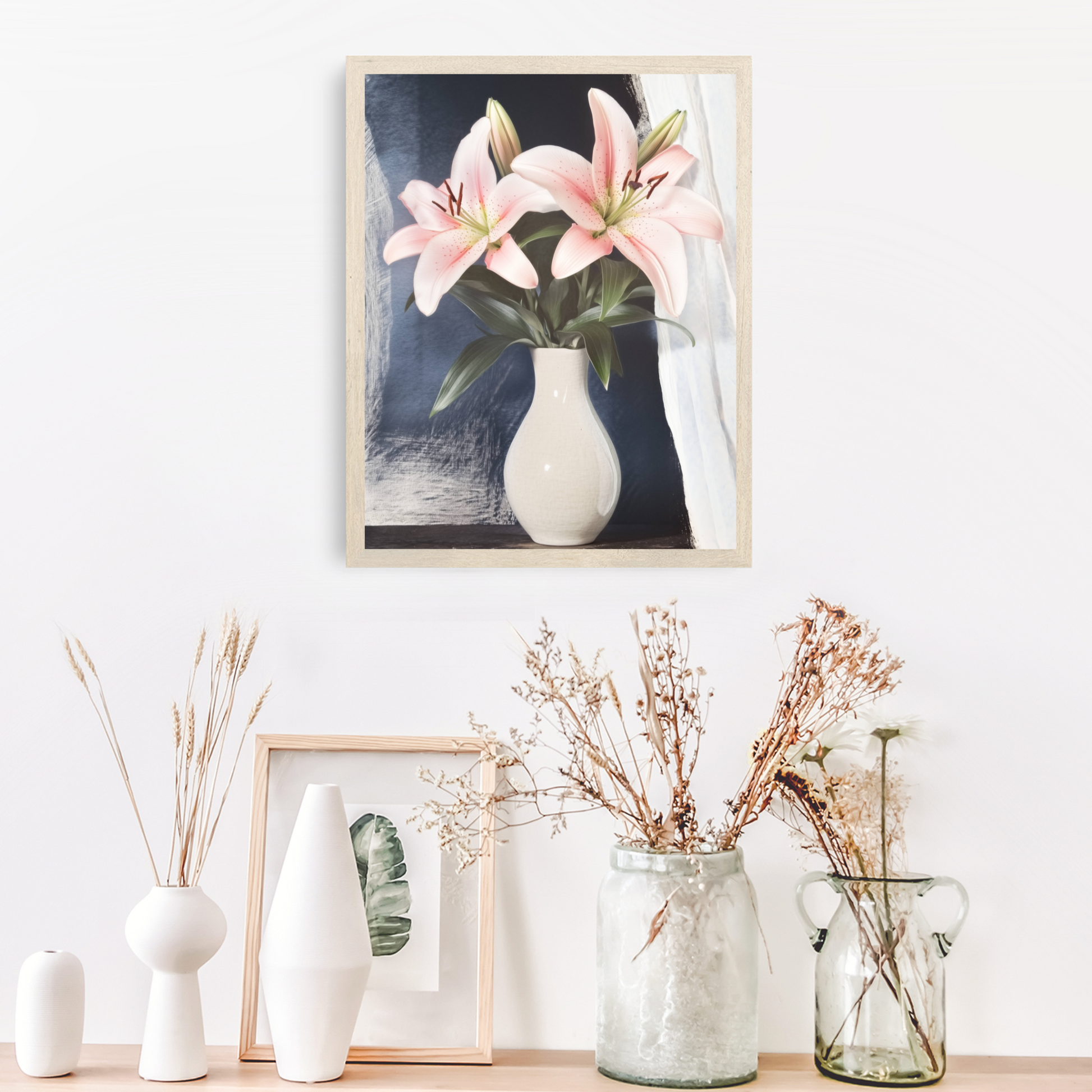 Immerse yourself in the captivating beauty of our still life art print. This evocative piece showcases a vase of delicate pink lilies perched on a rustic wooden shelf, bathed in soft light filtering through a curtain's edge. The interplay of light and shadow creates a somber, misty atmosphere, enhanced by a palette of light amber, dark indigo, white, and olive hues.While the shadowy stillness evokes a sense of tranquil contemplation. Perfect for those who appreciate subtle elegance and atmospheric art, this print brings a touch of ethereal charm to any space.