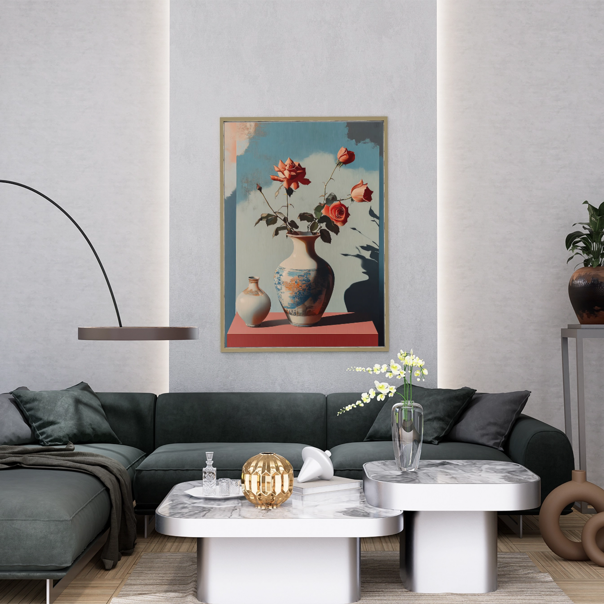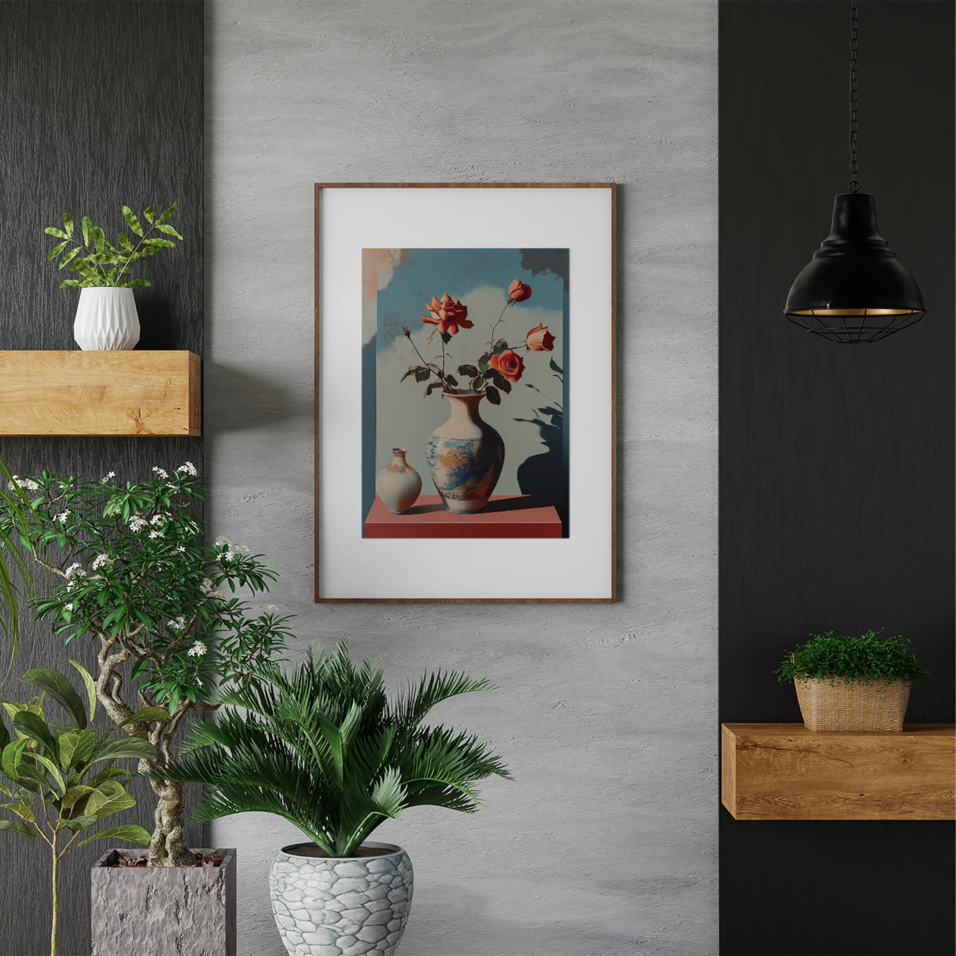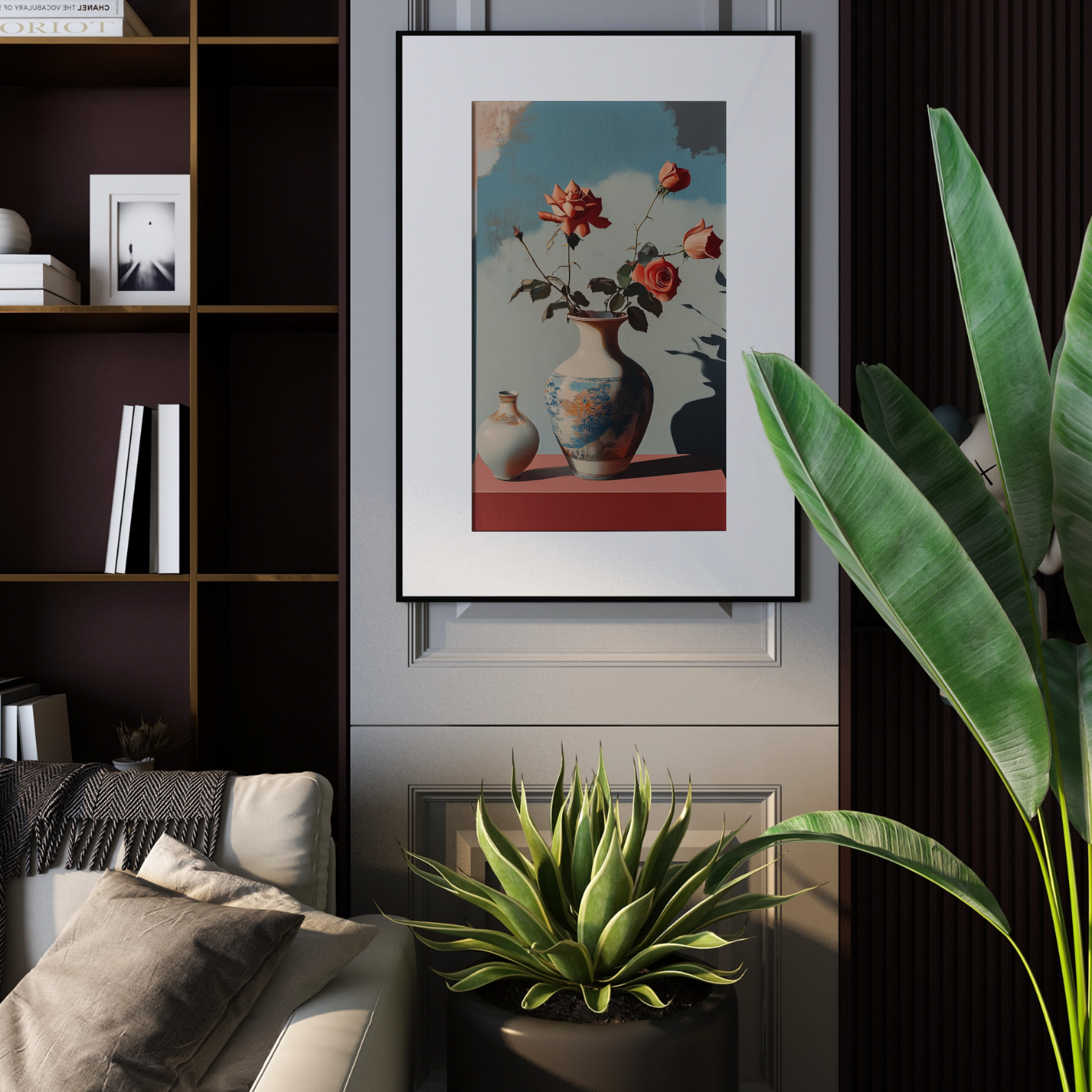 Immerse yourself in the captivating world of surrealism with our unique poster featuring a vase of roses. This striking artwork blends the dreamlike qualities of surrealist art with the subdued. The ethereal composition transforms a simple still life into a thought-provoking visual experience. Elevate your space with this sophisticated piece that seamlessly merges classic floral motifs with avant-garde artistic expression, creating a focal point that sparks conversation and contemplation.