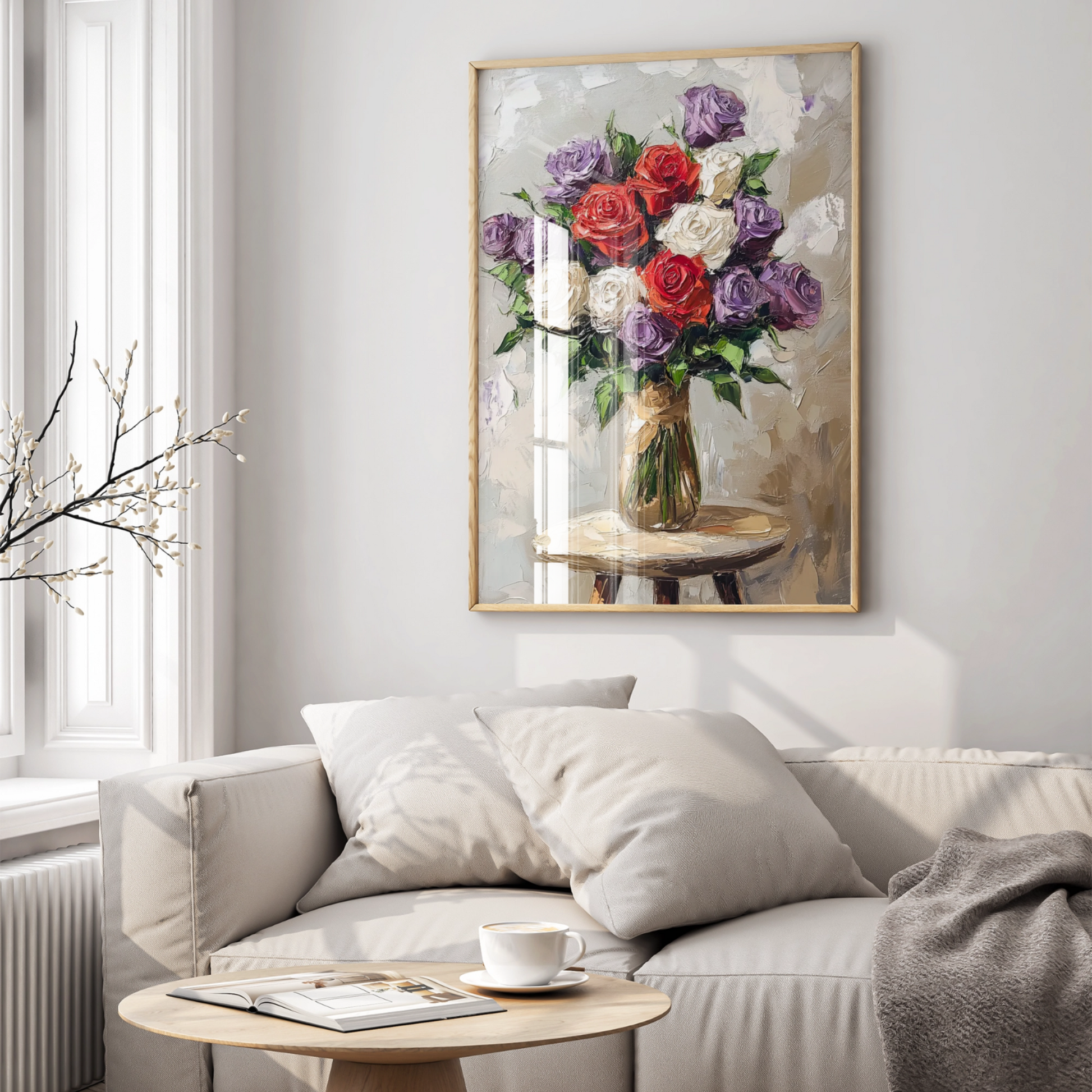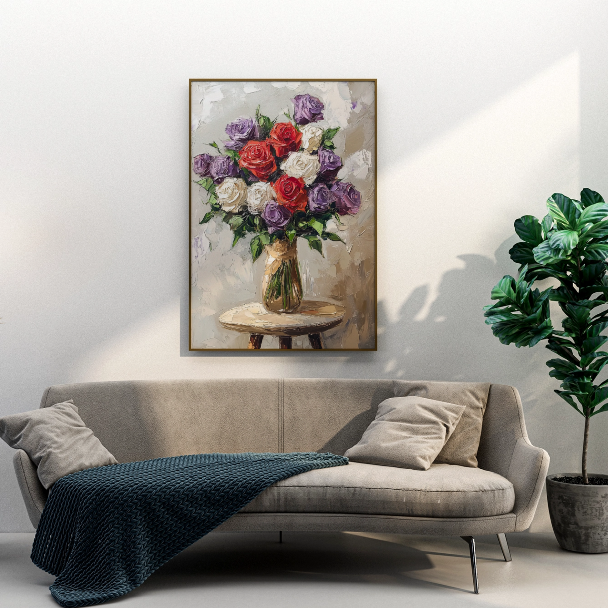 Vibrant Floral Impasto: Purple and White Roses on Intimate Side Table. High Resolution Digital Download 300 DPI