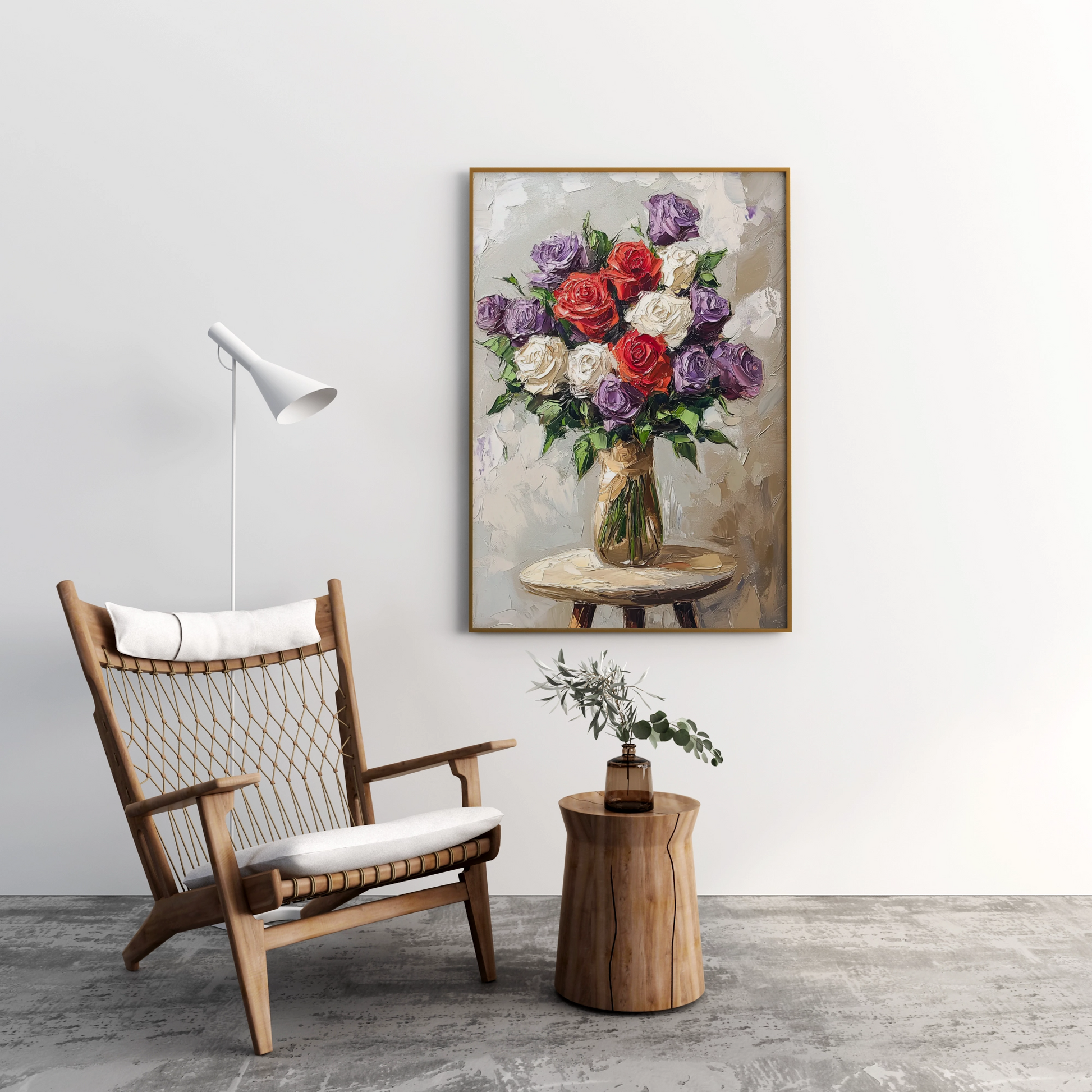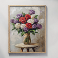 Elevate your art collection with our stunning impasto painting featuring a captivating vase of purple and white roses. This textured masterpiece brings depth and dimension to the classic floral still life, showcasing bold brushstrokes and rich color variations. Positioned delicately on a small table, the artwork creates an intimate and dynamic visual experience. Perfect for art enthusiasts who appreciate bold, tactile painting techniques and sophisticated botanical compositions, this piece transforms any space with its vibrant energy and artistic expression.