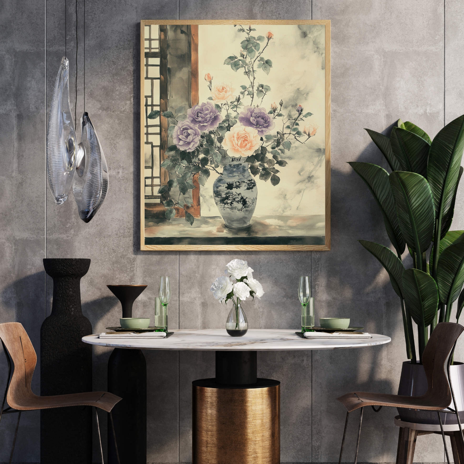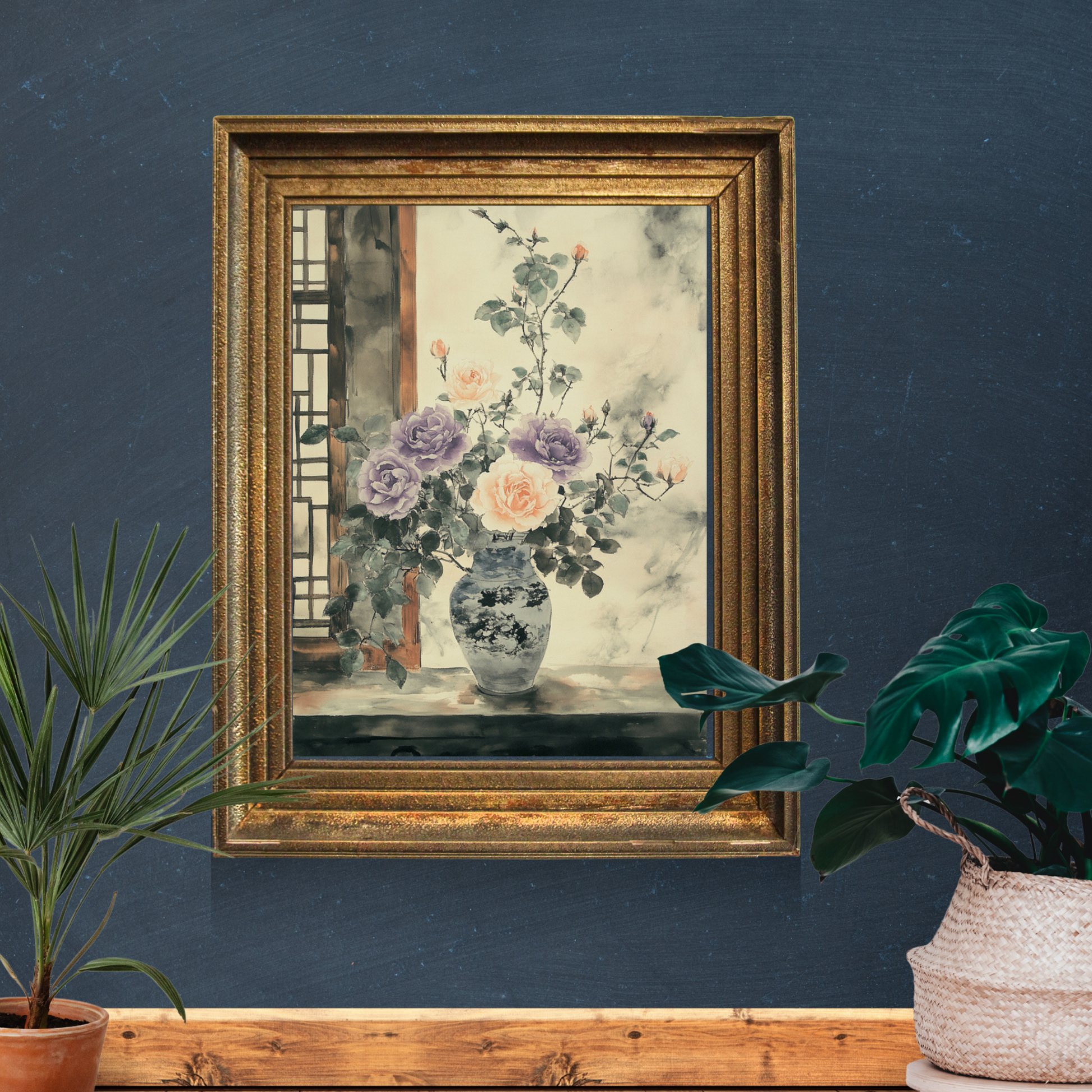 Immerse yourself in the delicate beauty of our East Asian ink and wash painting featuring a mesmerizing vase of purple and orange roses. Positioned gracefully next to an open window, this artwork captures the essence of traditional Asian painting techniques with its fluid, minimalist approach. The subtle color palette and expressive brushstrokes create a sense of tranquil elegance, blending the vibrancy of roses with the serene simplicity of ink wash art. Perfect for those seeking a sophisticated, culturally inspired piece that brings a touch of meditative beauty to any space.