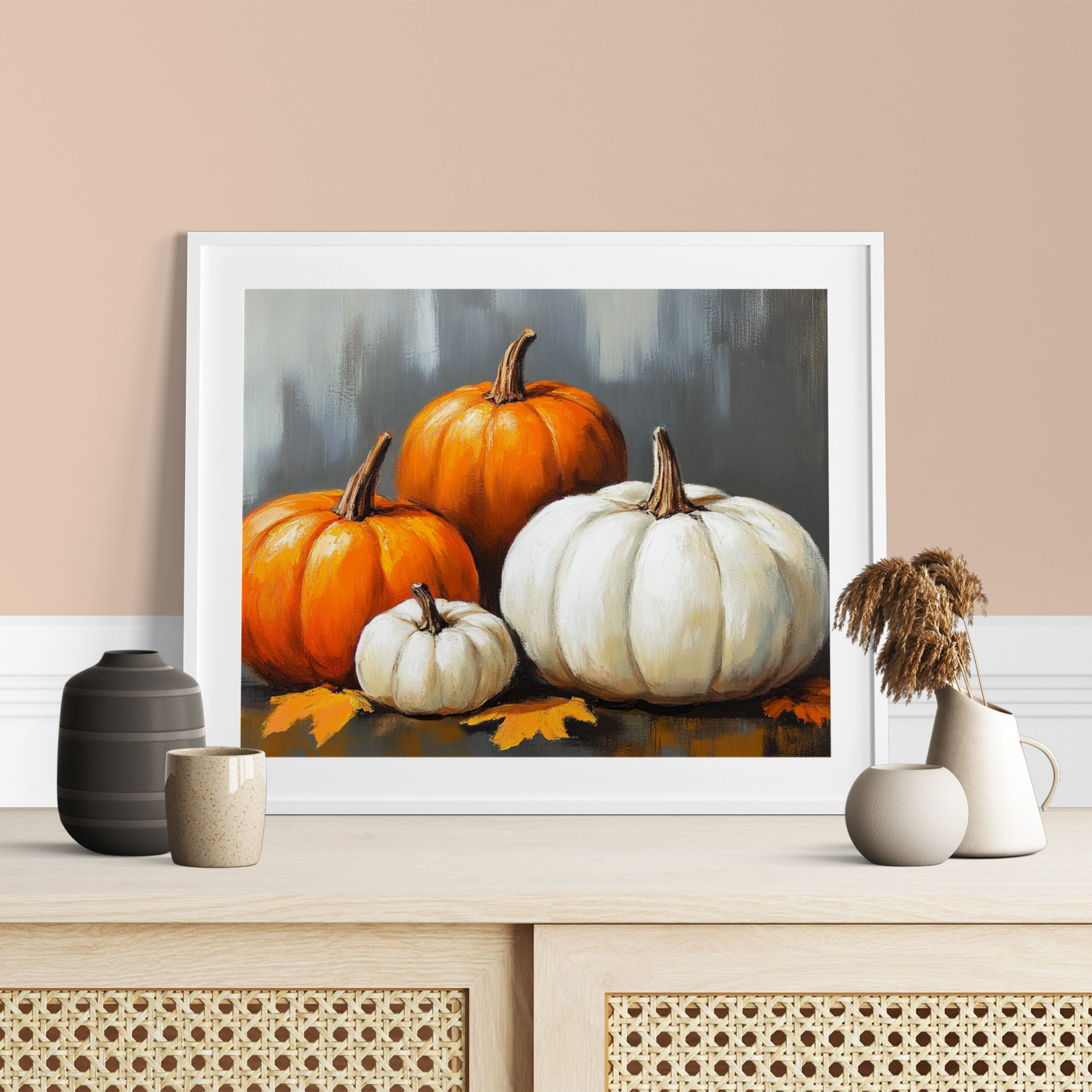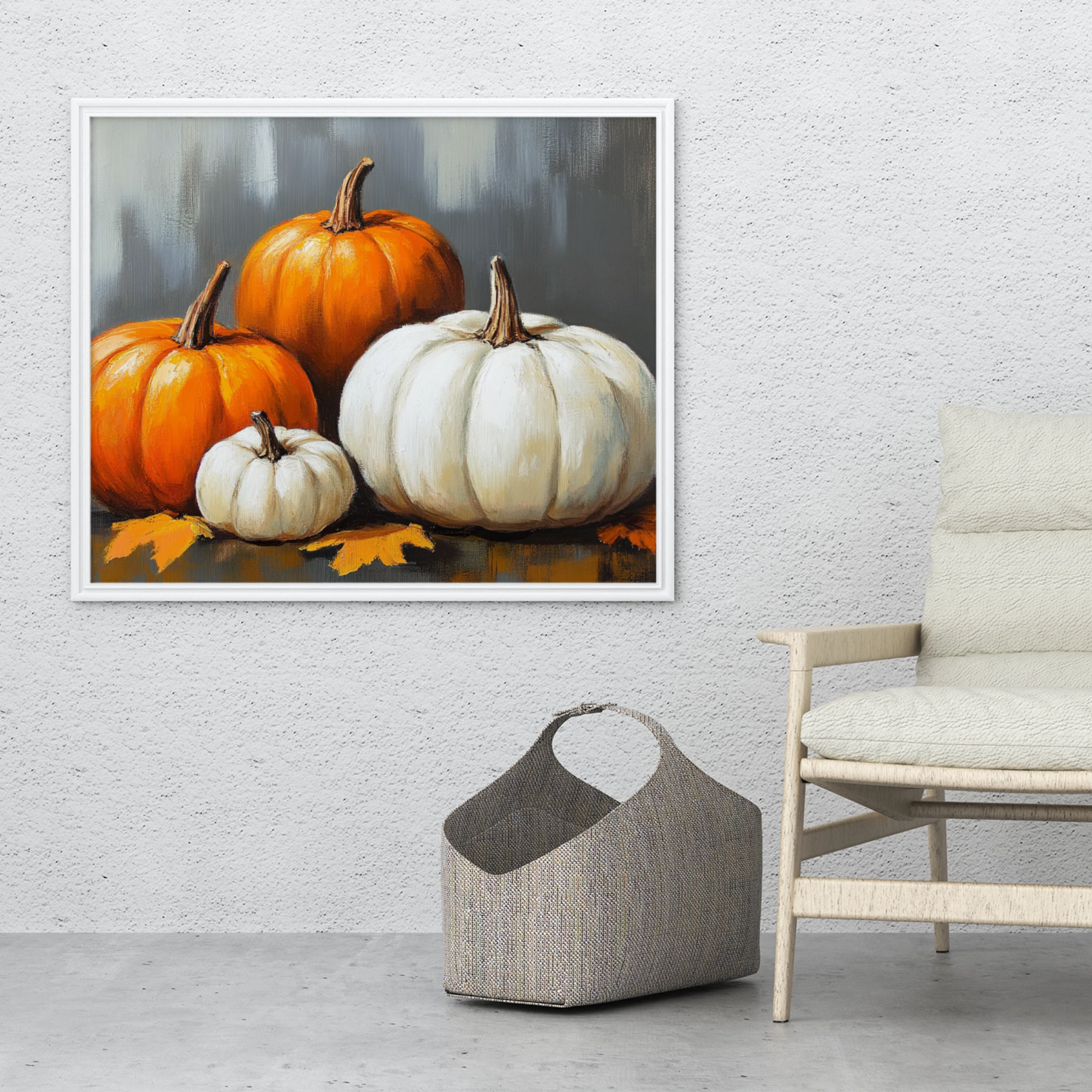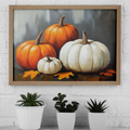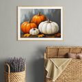 Bring the essence of autumn into your home with our captivating rustic-style painting of pumpkins. Set against a rich, dark gray background, this artwork showcases the warmth and charm of the harvest season. The visible brush marks add depth and texture, creating a tactile quality that invites closer inspection. This piece effortlessly blends rustic charm with contemporary style, making it an ideal focal point for any room seeking a touch of autumnal elegance.