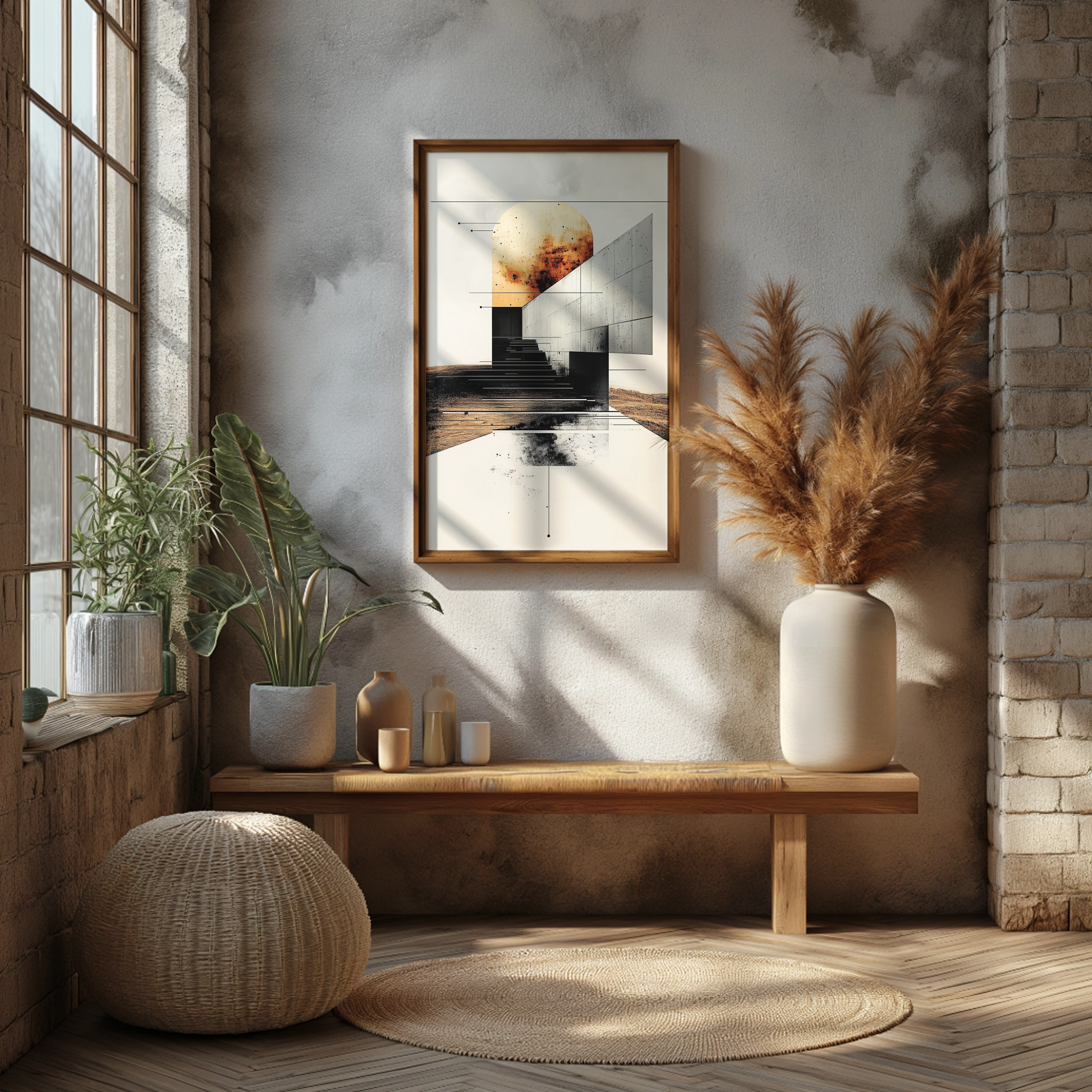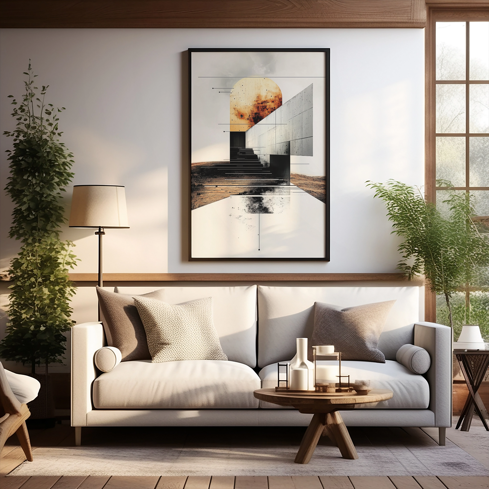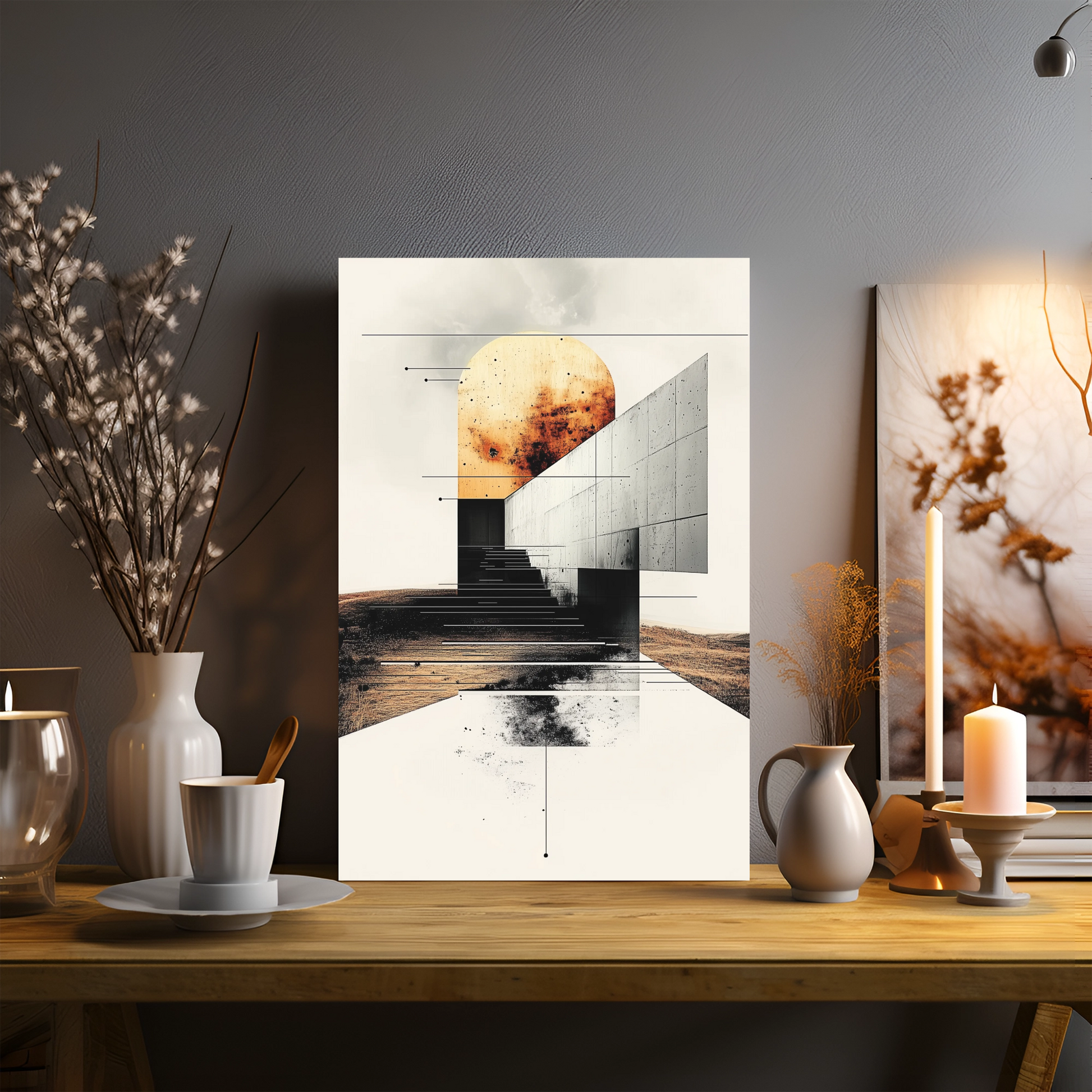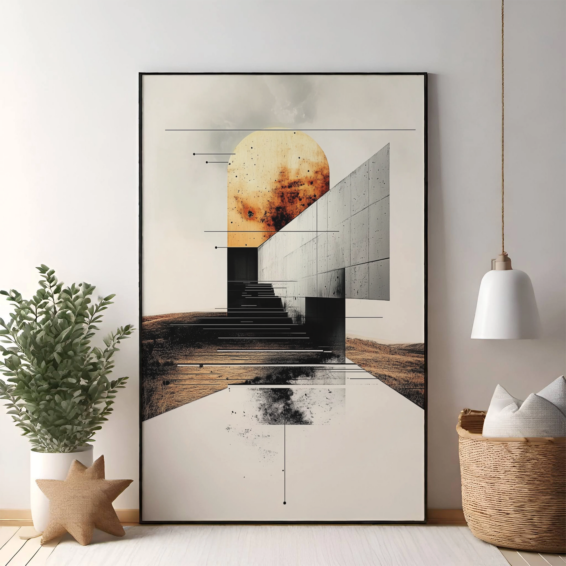 Immerse yourself in the captivating world of our minimalist abstract drawing, featuring a mesmerizing large, glowing orange sphere. This striking artwork leads the eye to a sleek, geometric building, all set against a stark, rocky landscape. The surreal composition creates a dreamlike atmosphere, perfect for those who appreciate modern, thought-provoking art. Ideal for contemporary spaces, offices, or galleries, this piece adds a touch of mystery and intrigue to any environment. Let this minimalist masterpiece transform your space with its unique blend of geometric precision and ethereal ambiance.