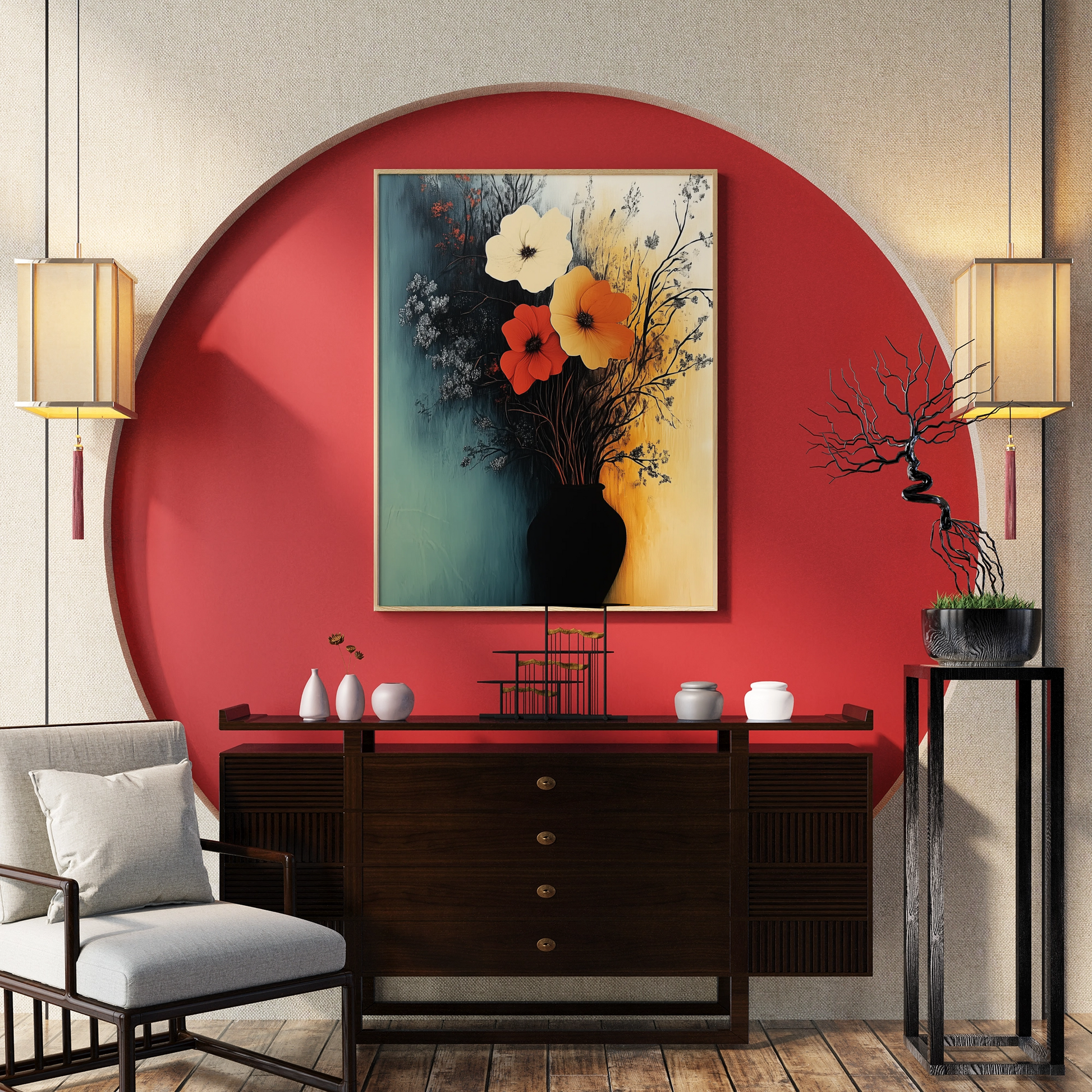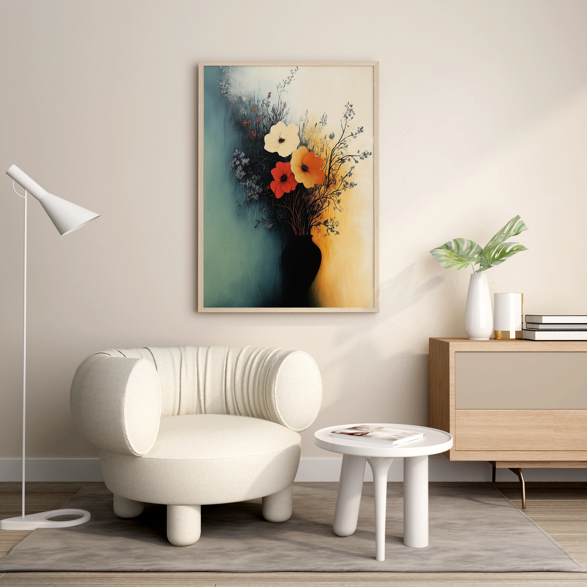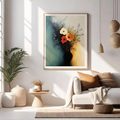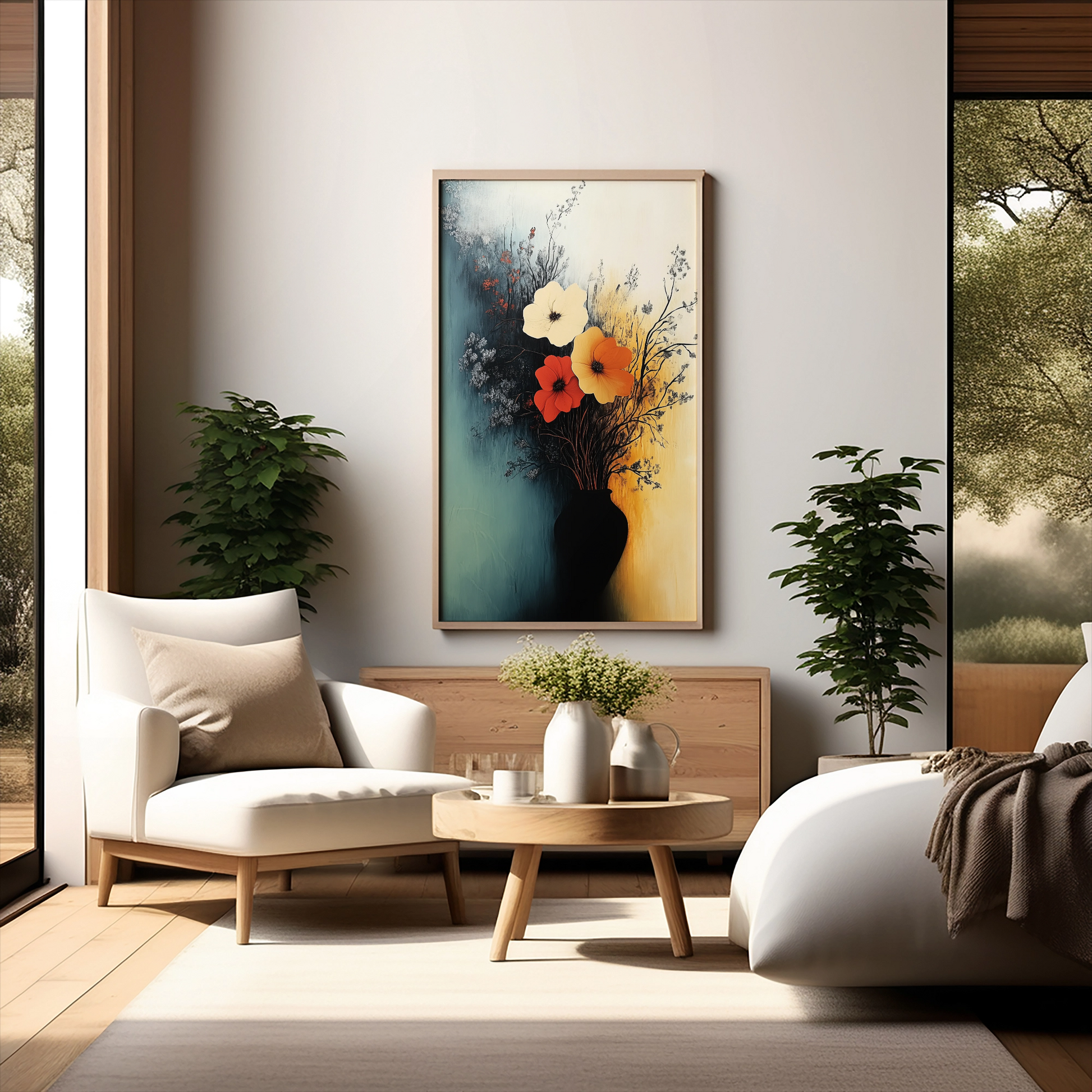Elevate your space with our stunning artwork featuring a vibrant bouquet of colorful flowers. This captivating piece showcases an array of red, orange, and white blooms that pop against a dramatic, abstract background. The dark canvas is brought to life with dynamic brushstrokes in soothing blues, lush greens, and sunny yellows, creating a harmonious contrast that draws the eye. Perfect for art enthusiasts and interior design lovers, this painting adds a touch of elegance and energy to any room. Whether displayed in a living area, bedroom, or office, this floral masterpiece brings the beauty of nature and the excitement of abstract art together in one unforgettable visual experience.