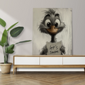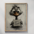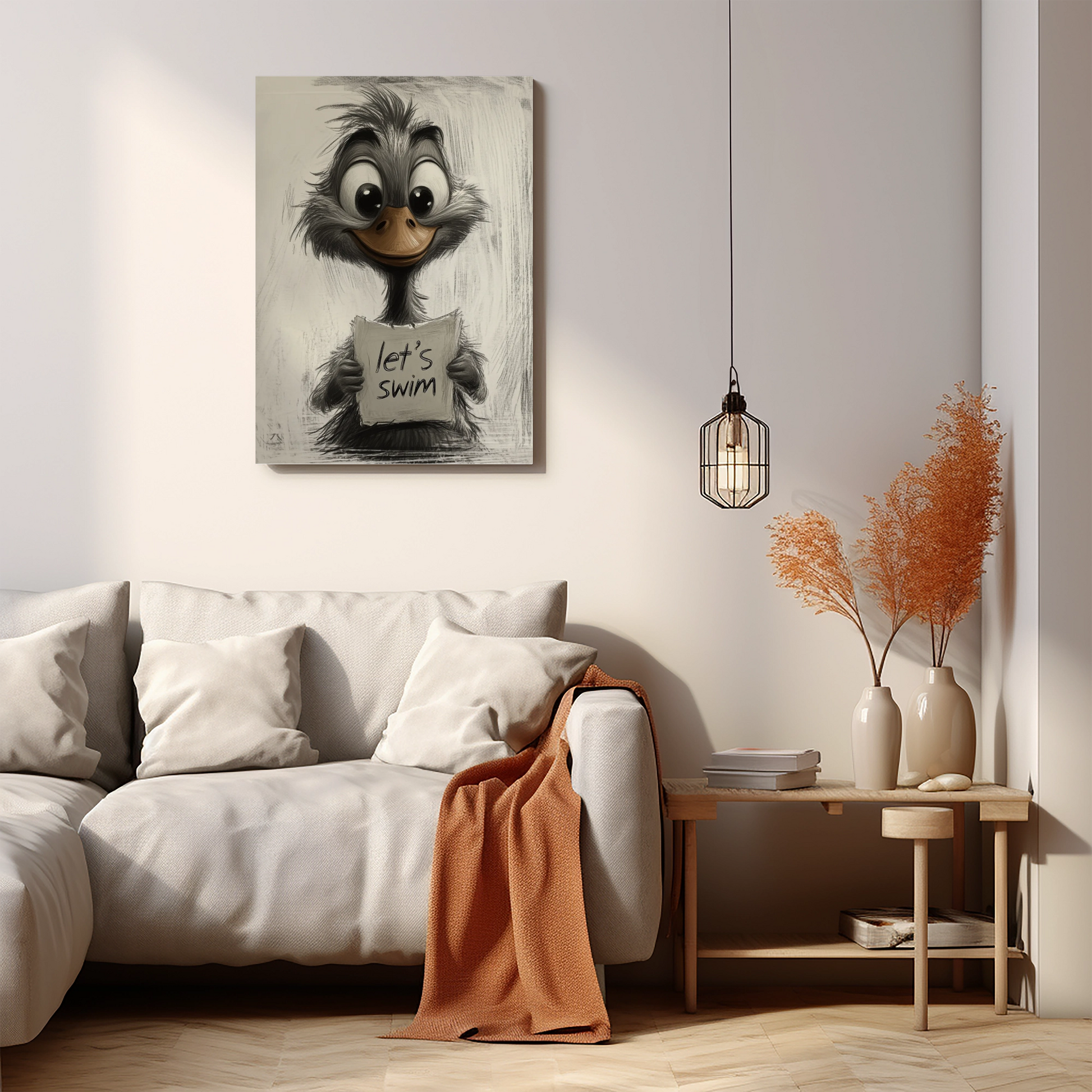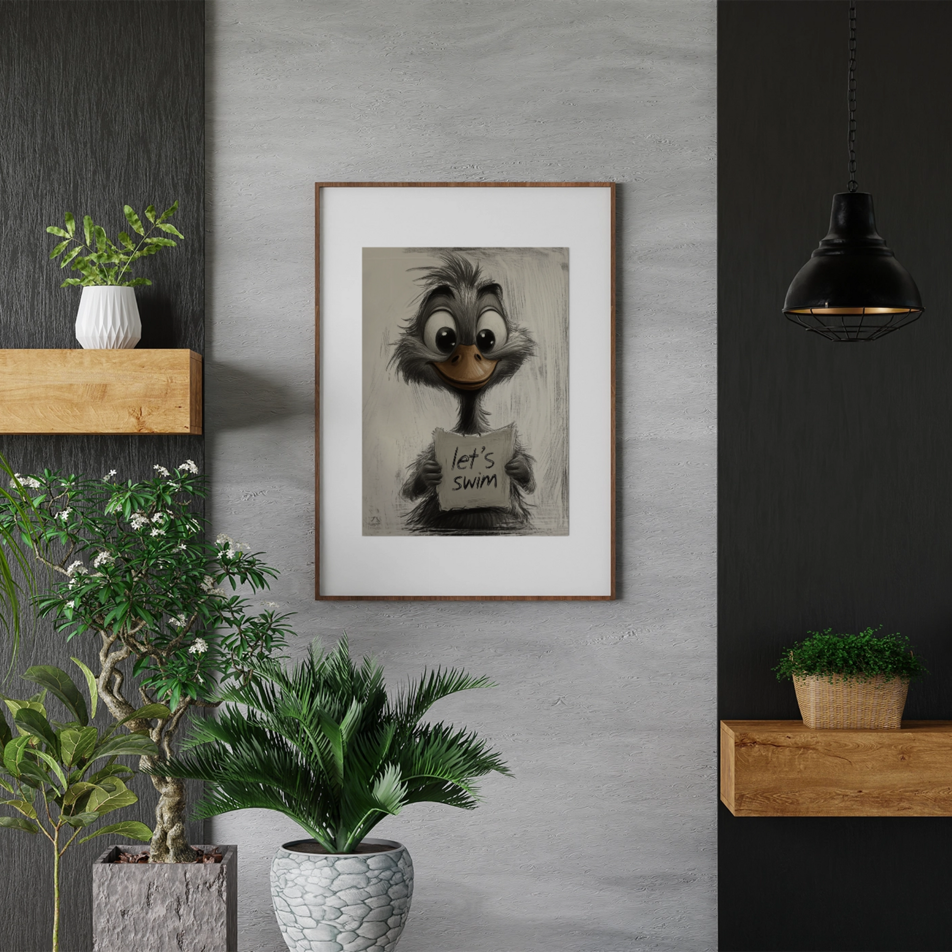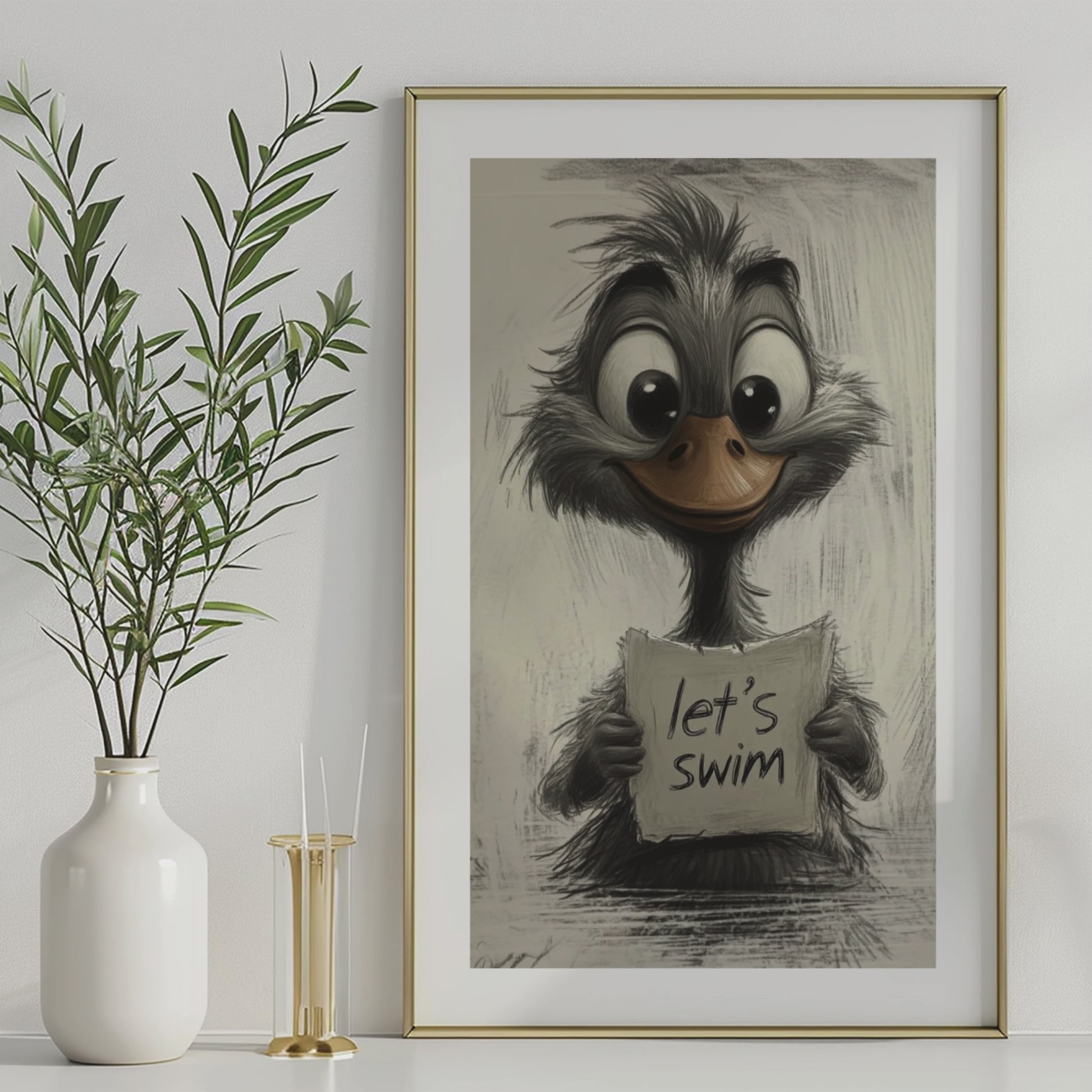 Dive into a world of artistic whimsy with our charcoal sketch featuring a charismatic cartoon goose. This delightful illustration captures the spirit of adventure, depicting the goose holding an old paper with the playful text "let's swim". Rendered in a scratchy, expressive charcoal style, the artwork brings a unique blend of humor and artistic sophistication. The raw, textured lines create a dynamic visual narrative that speaks to the joy of spontaneity and exploration. Perfect for those who appreciate quirky art that tells a story with character and charm.