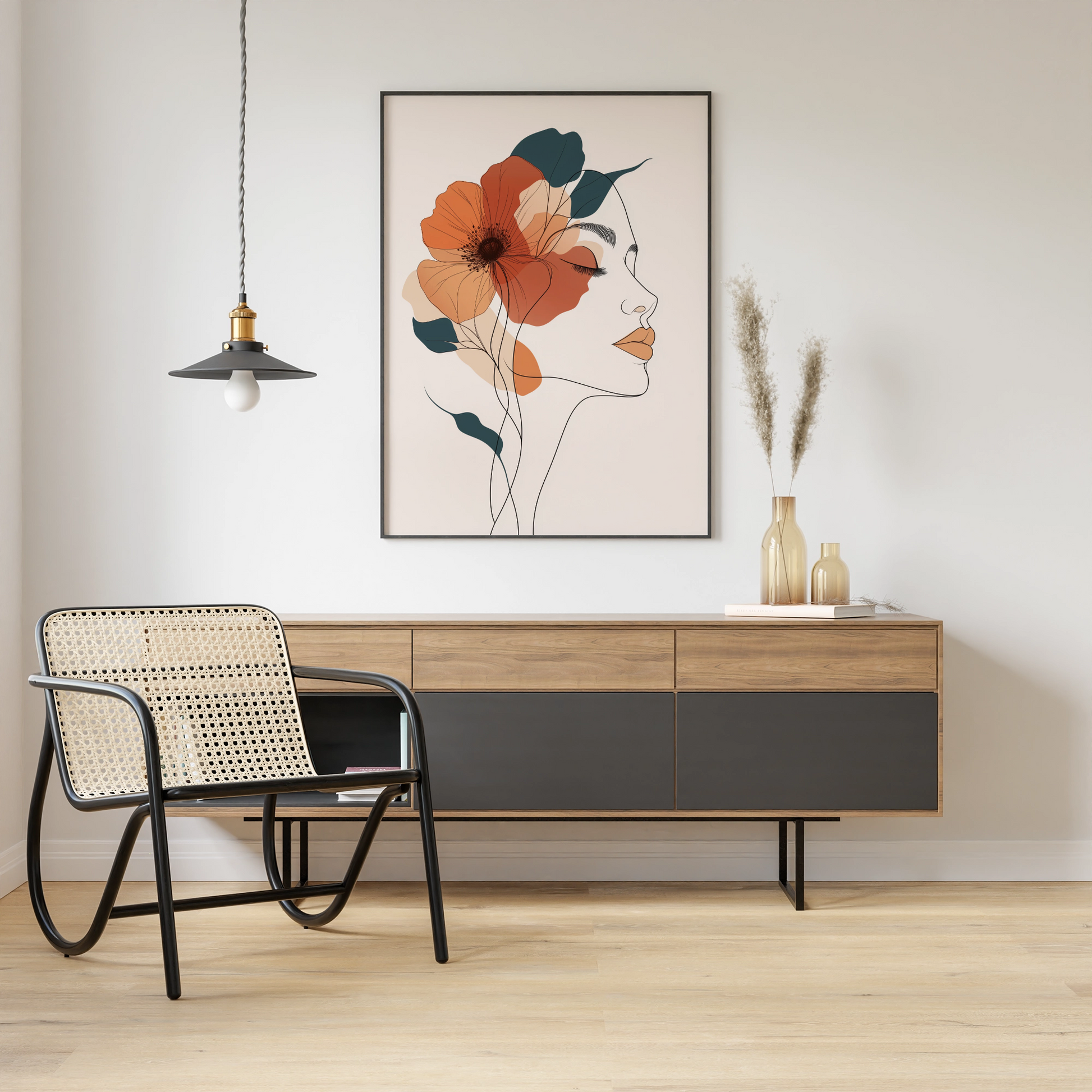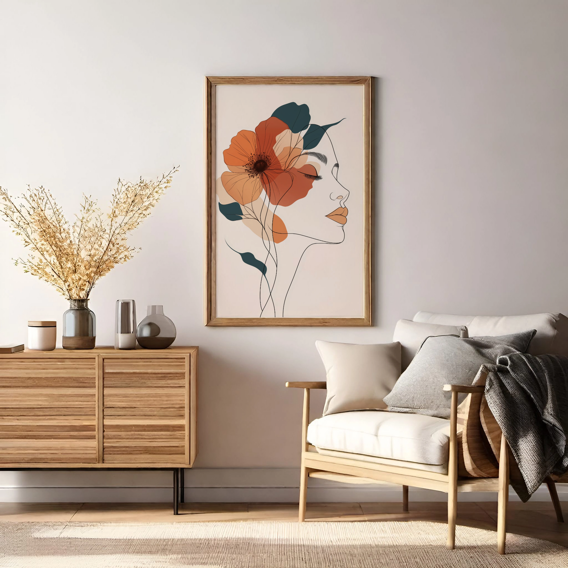 Elevate your space with our captivating bohemian line art painting, featuring a stylized woman's face adorned with abstract floral elements. This unique artwork showcases a large, eye-catching orange flower alongside various leaves and shapes in vibrant shades of orange, green, and blue. The woman's features are rendered in minimalist, elegant lines, creating a harmonious blend of simplicity and complexity. Perfect for those who appreciate modern, eclectic art, this piece adds a touch of bohemian charm and artistic flair to any room. Whether displayed in a living area, bedroom, or creative space, this line art painting brings a sense of feminine energy and natural beauty to your decor.