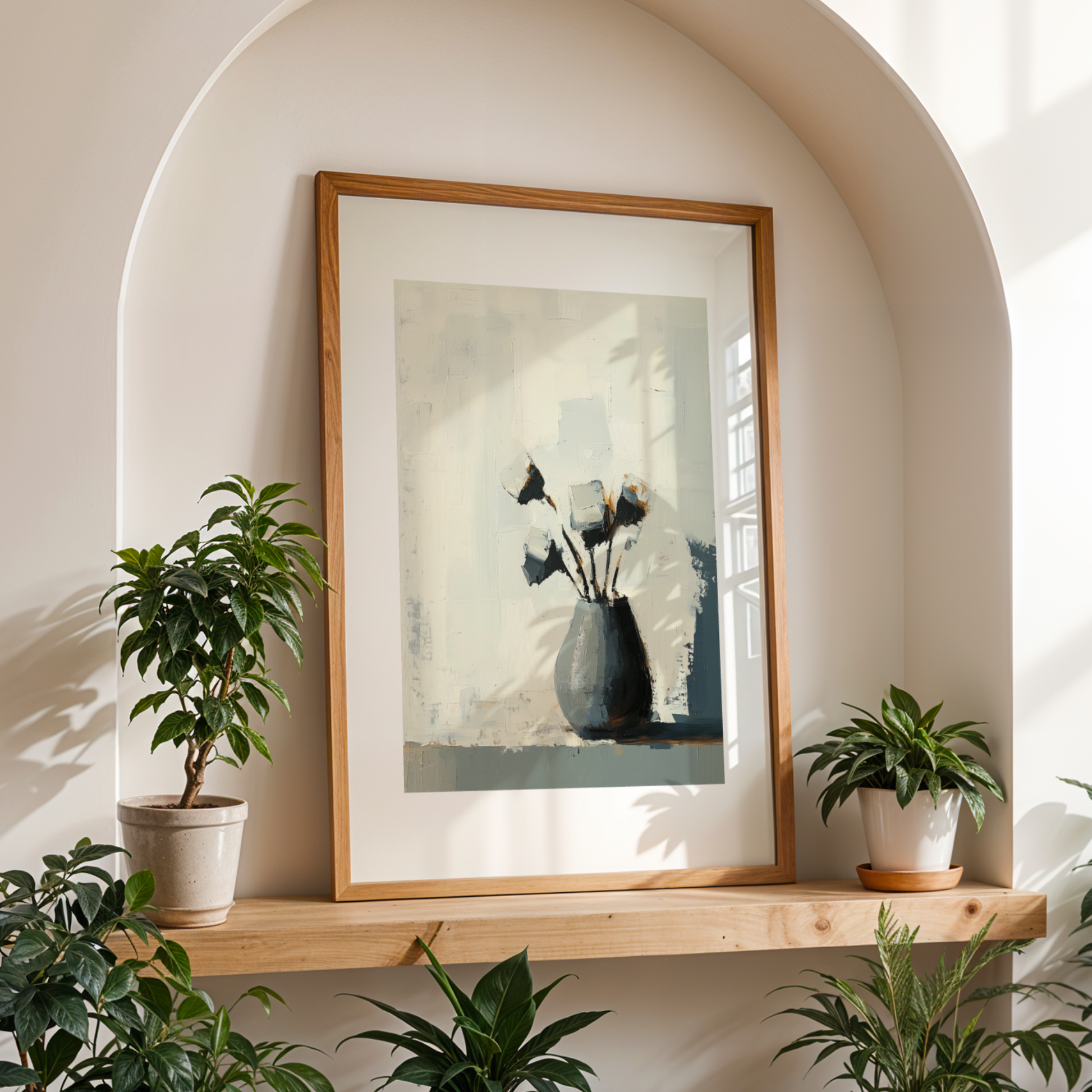 Elevate your decor with this striking oil painting, featuring an abstract grey vase and stylized floral forms set against a crisp white background. The composition embraces the essence of modern minimalism, with rough brushstrokes and simplified shapes that evoke the spirit of mid century abstract art. The neutral palette and textured surface create a sophisticated, gallery worthy look that complements contemporary interiors. This artwork’s bold yet understated style highlights the beauty of abstraction, focusing on form, texture, and balance rather than realistic detail. The rough, expressive brushwork and harmonious arrangement of shapes invite viewers to appreciate the subtle interplay of color and composition, making it a perfect choice for those who value modern art and minimalist design.