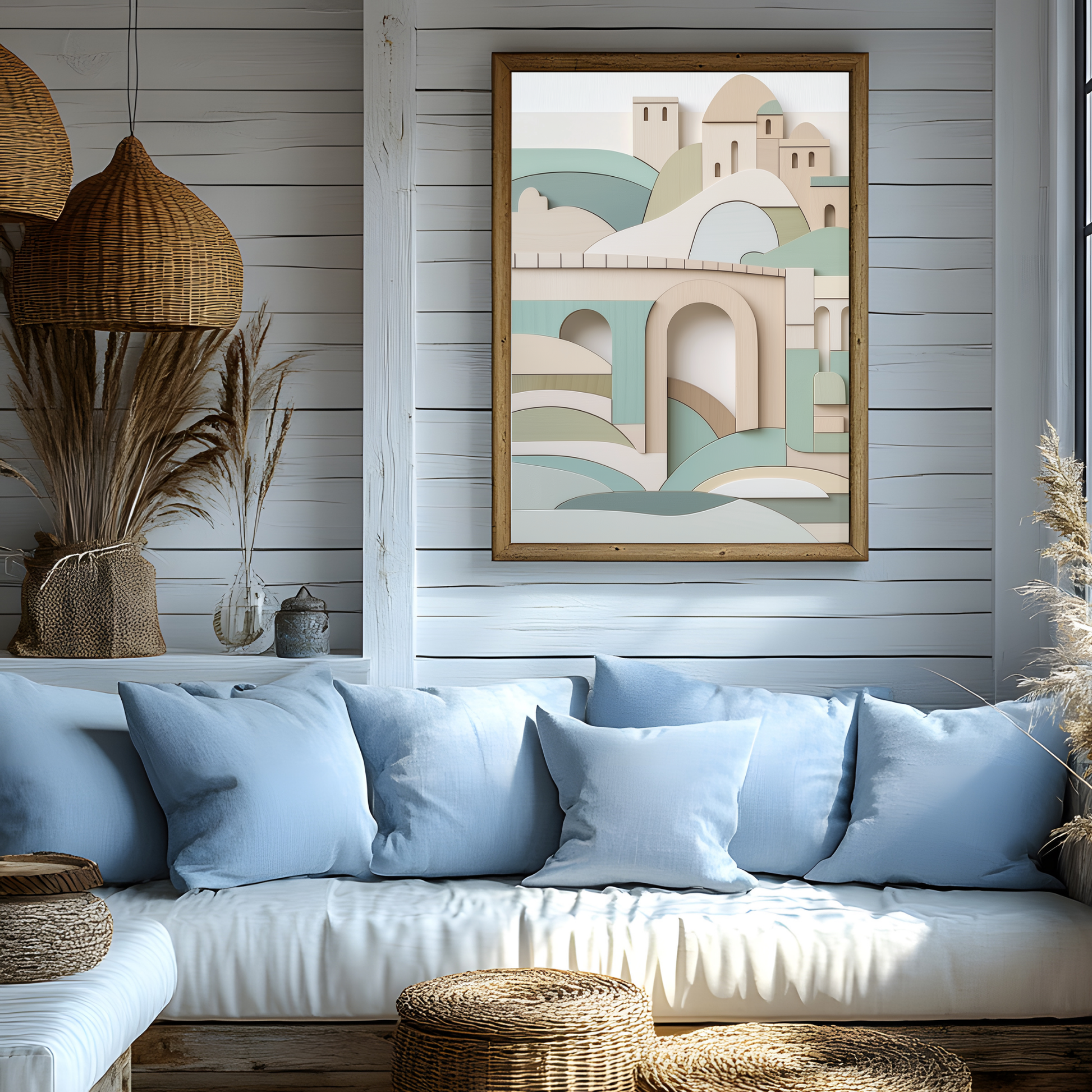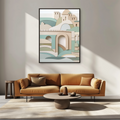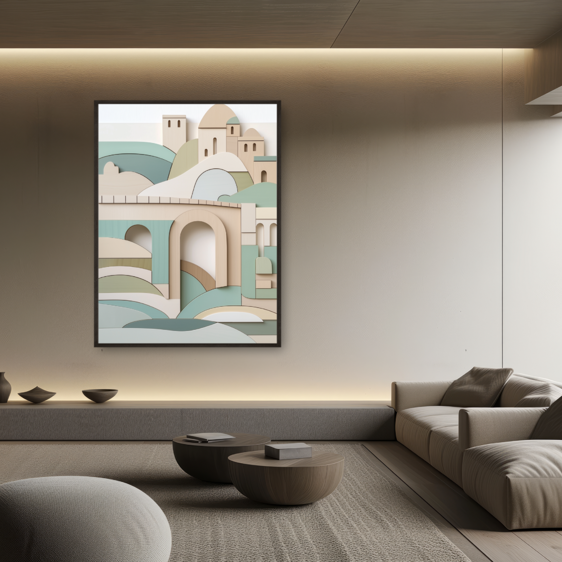Enhance your home with this stunning wooden wall art piece, featuring an abstract, geometric interpretation of the iconic Rialto Bridge. Crafted with smooth lines and soft pastel colors, this artwork elegantly combines arches, hills, water waves, and buildings in harmonious shades of green, blue, and beige. Set against a crisp white background, each element is thoughtfully arranged to create a captivating sense of depth and a striking three-dimensional effect. Perfect for modern and contemporary interiors, this unique wall art brings a touch of Venetian charm and architectural beauty to any space. The blend of natural wood texture and pastel hues offers a calming yet sophisticated vibe, making it ideal for living rooms, bedrooms, or offices. Celebrate timeless design and artistic craftsmanship with this eye-catching piece that will elevate your decor.