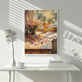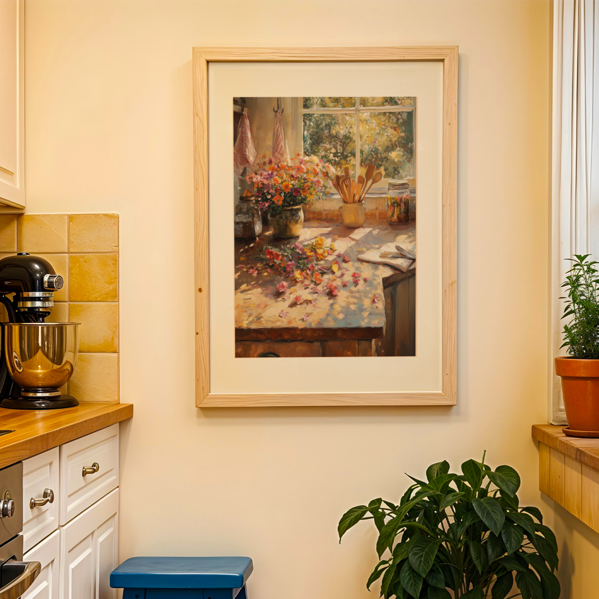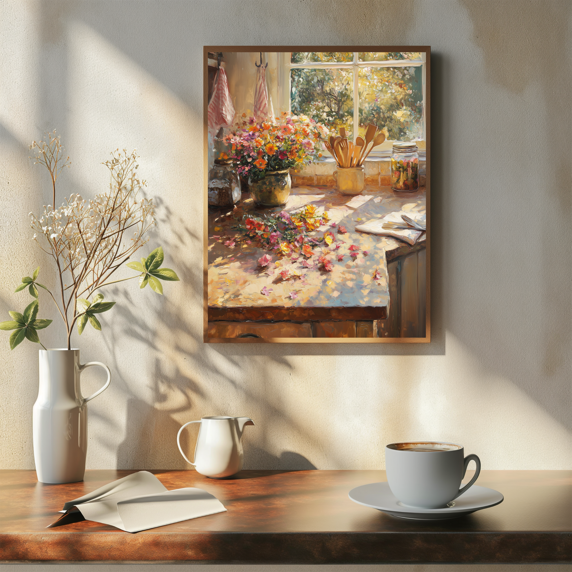 Brighten your home with this abstract oil painting capturing a sunlit kitchen countertop, alive with the warmth of organic textures and the joyful essence of spring. Freshly picked spring flowers and vibrant petals are scattered freely across the surface, infusing the scene with spontaneous color and natural beauty. The relaxed arrangement of blooms, combined with the countertop’s rich texture and soft natural light, evokes a sense of everyday serenity and uplifting comfort. In the softly blurred background, homely kitchen details like a hanging oven mitt, a jar of wooden utensils, and a napkin holder add to the inviting, lived-in feel. The harmonious blend of bright colors, expressive brushwork, and gentle glow creates a visually rich composition perfect for kitchens, dining rooms, or any space seeking a touch of spring-inspired energy and warmth.