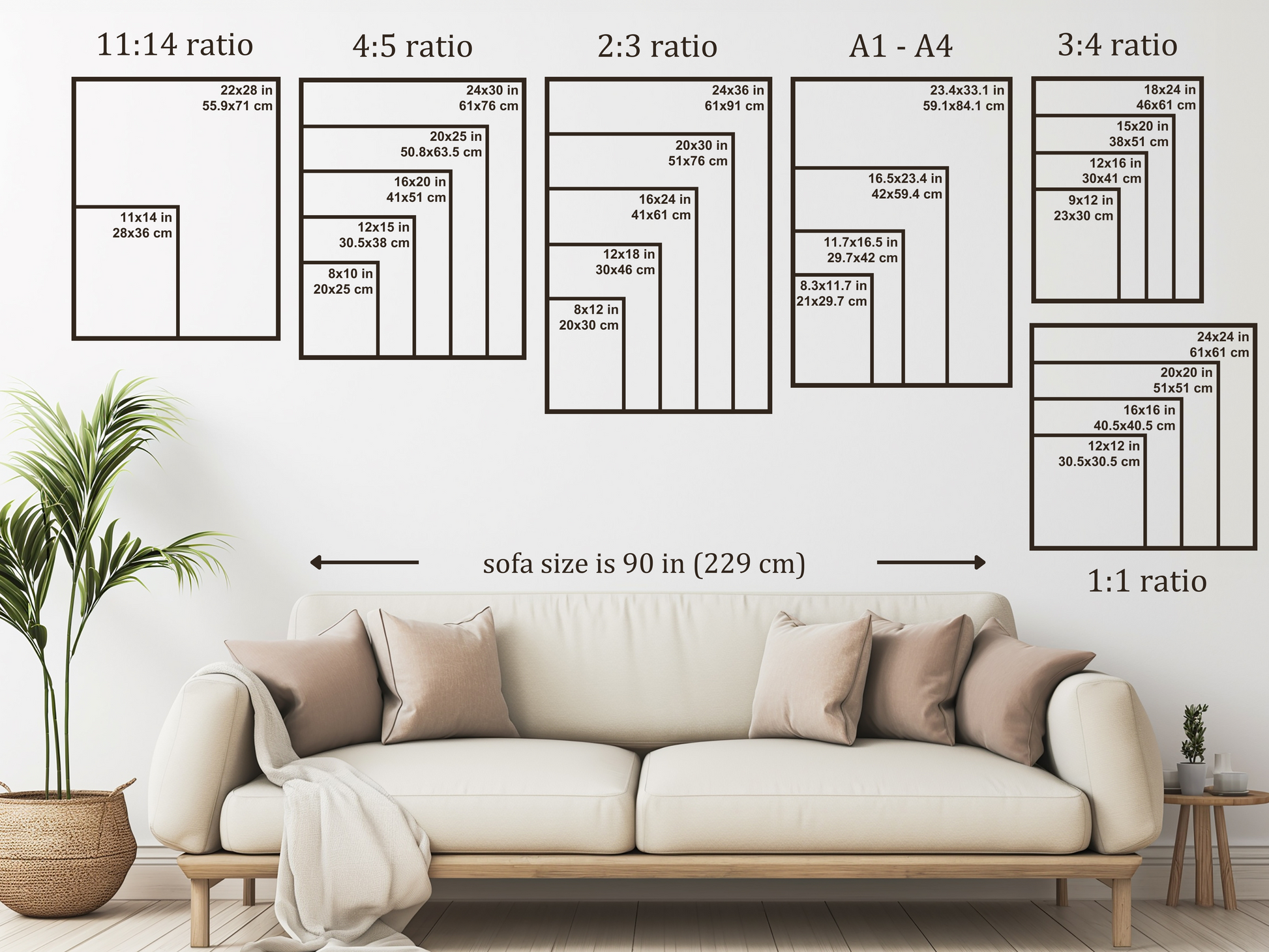 Inches: 4x6, 6x9, 8x12, 10x15, 12x18, 16x24, 20x30, 24x36
