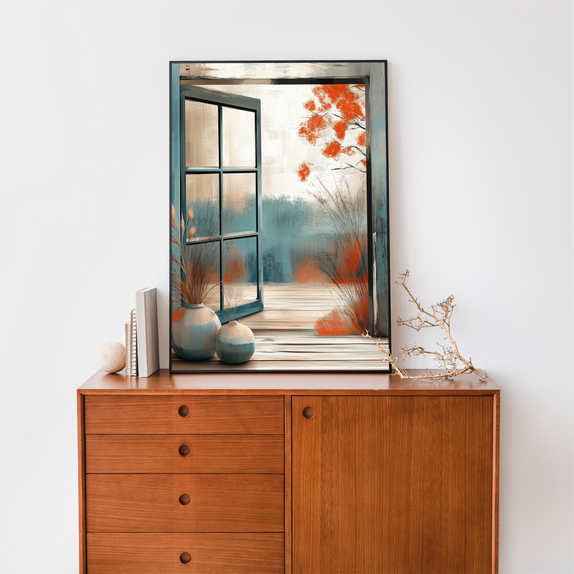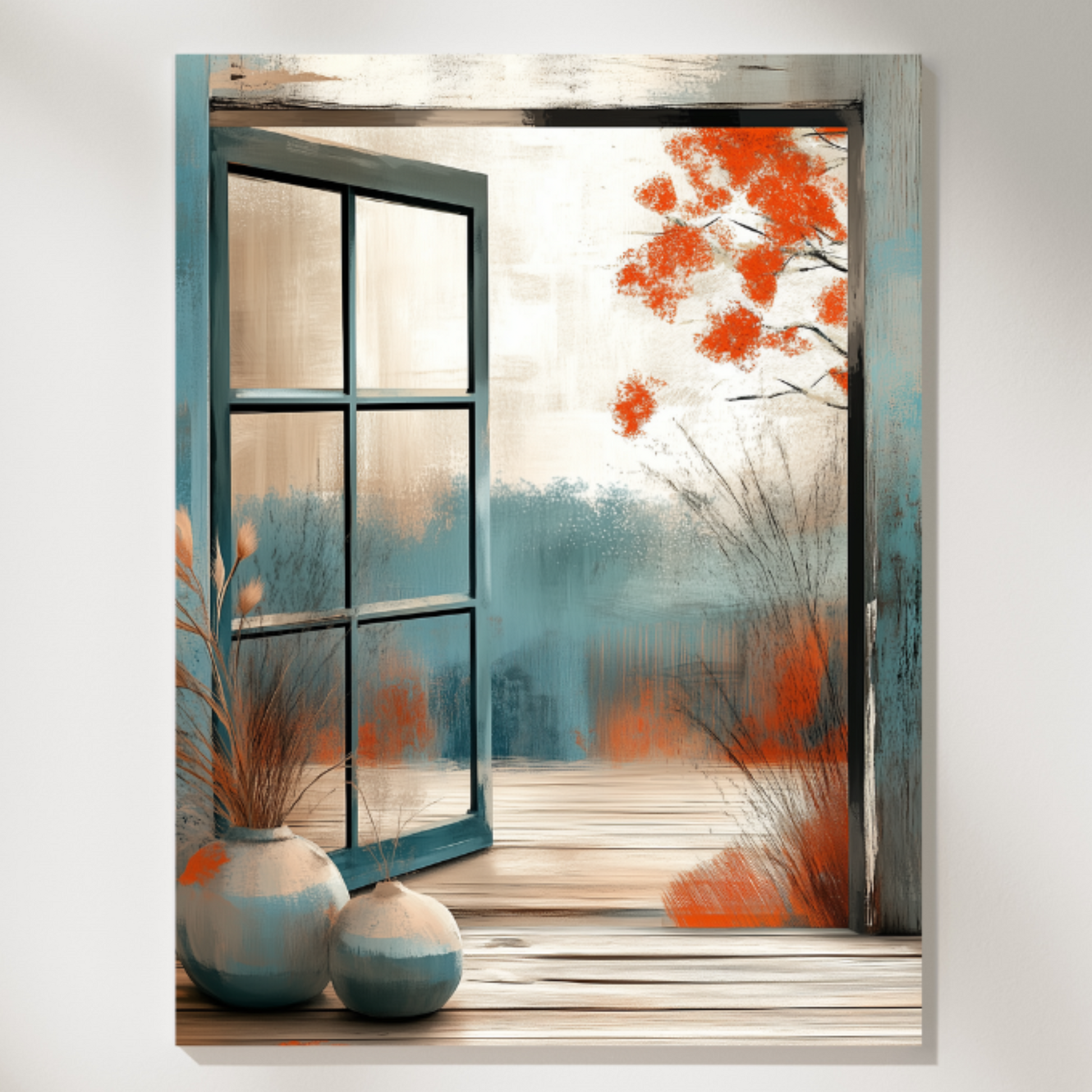 Bring the warmth and beauty of autumn into your home with this captivating wall art piece. This stunning photograph captures a picturesque fall landscape as seen through a window, creating an intimate and inviting perspective. The vibrant hues of changing leaves paint a tapestry of reds, oranges, and golds, contrasting beautifully with the crisp, clear sky. The window frame adds depth and context, inviting viewers to feel as if they're peering out from the comfort of a cozy interior into the splendor of nature's autumnal display. This art offers a perfect blend of indoor comfort and outdoor beauty, making it an ideal addition to any room seeking a touch of seasonal charm. The photograph's composition masterfully balances the intricate details of fall foliage with the broader landscape, creating a visually rich and engaging piece. Whether displayed in a living room, bedroom, or office, this artwork serves as a daily reminder of autumn's fleeting beauty and the simple joy of gazing out at a perfect fall day. It's an excellent choice for nature lovers, photography enthusiasts, or anyone looking to infuse their space with the warm, inviting essence of autumn.