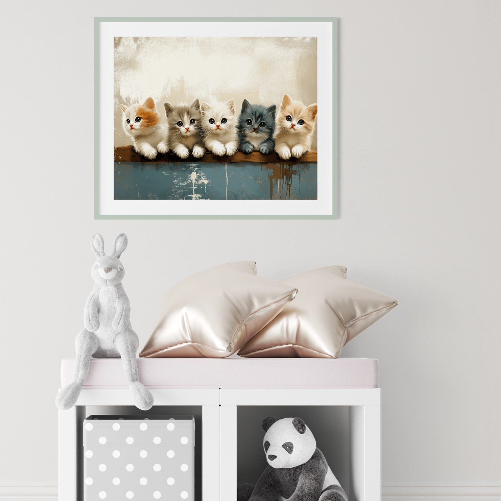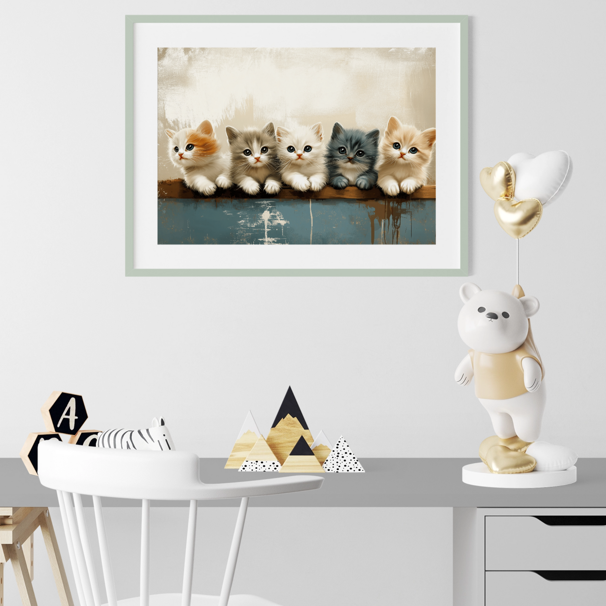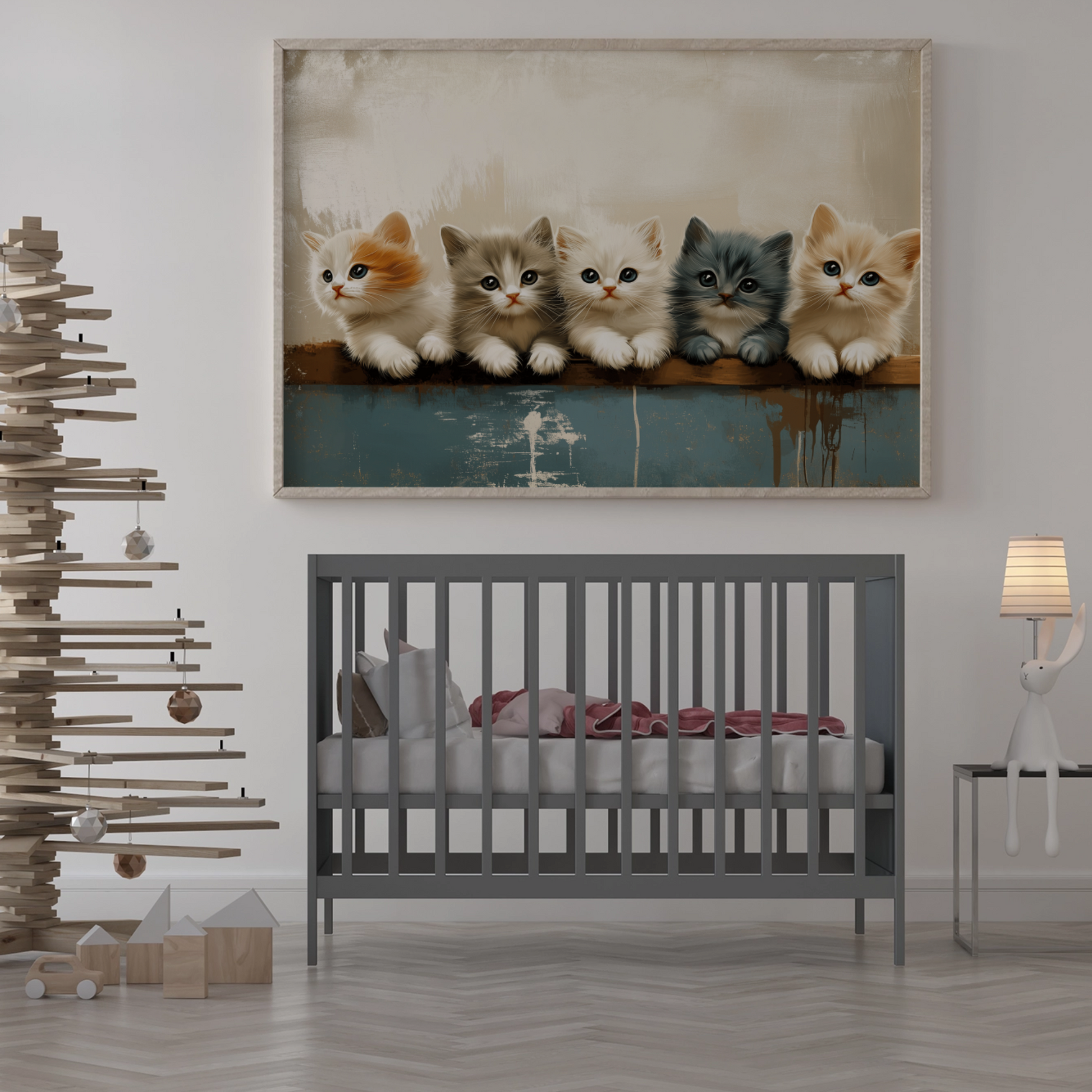 Bring a touch of whimsy and warmth to your home with our enchanting "Five Kittens on Wooden Bar" Canvas Wall Art Print. This delightful piece showcases a quintet of adorable kittens perched playfully on a rustic wooden bar, capturing the perfect blend of cuteness and charm. The high-quality canvas print brings out the fine details of each kitten's fur and expressive eyes, making it a captivating focal point for any room. Ideal for cat lovers and art enthusiasts alike, this versatile wall art adds character to various spaces, from living rooms and bedrooms to nurseries and offices. The neutral tones of the wooden bar complement the vibrant personalities of the kittens, ensuring this piece fits seamlessly into diverse decor styles. Elevate your wall decor with this irresistible feline-themed artwork that's sure to spark joy and conversation.