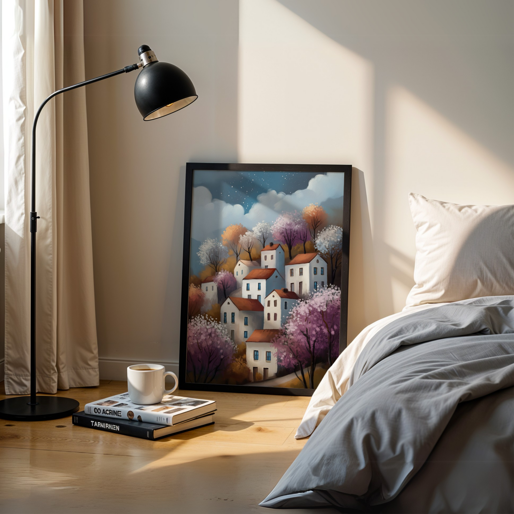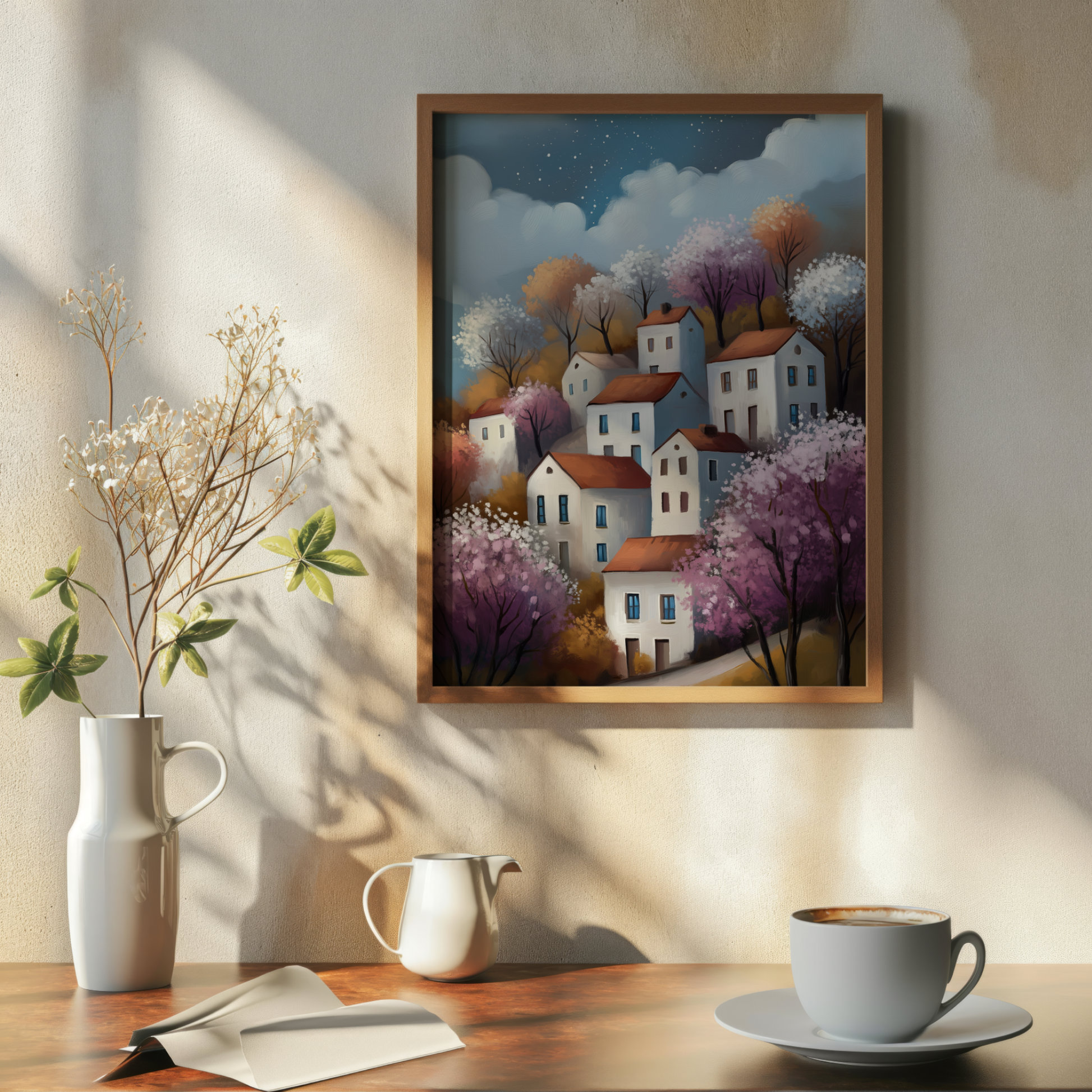 Bring the enchantment of spring into your home with this captivating wall art, featuring a charming village of white cottages nestled among blossoming trees. The scene is beautifully illuminated by a star-speckled sky, creating a tranquil and inviting atmosphere that celebrates the gentle renewal of spring. Perfect for living rooms, bedrooms, or entryways, this artwork adds a touch of warmth and serenity to any space. Expertly crafted with vibrant colors and intricate details, this spring landscape wall art transports you to a peaceful countryside retreat. The harmonious blend of blooming flora, cozy cottages, and a dreamy night sky makes it an ideal choice for those seeking to infuse their decor with nature-inspired elegance and timeless beauty.